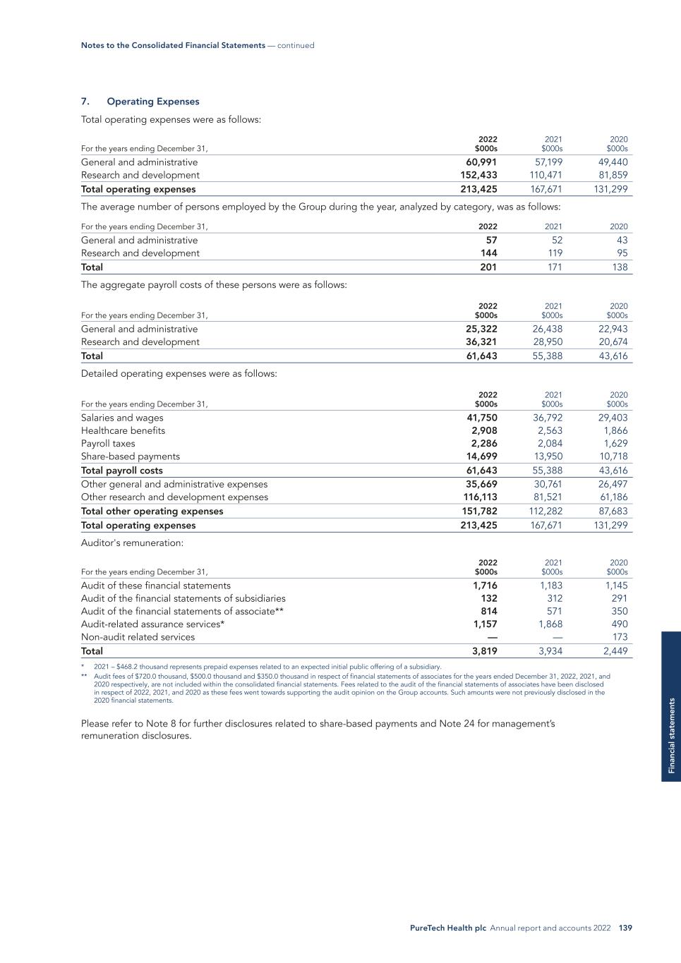 PureTech Health plc Annual report and accounts 2022 139 Fi na nc ia l s ta te m en ts 7. Operating Expenses Total operating expenses were as follows: For the years ending December 31, 2022 $000s 2021 $000s 2020 $000s General and administrative 60,991 57,199 49,440 Research and development 152,433 110,471 81,859 Total operating expenses 213,425 167,671 131,299 The average number of persons employed by the Group during the year, analyzed by category, was as follows: For the years ending December 31, 2022 2021 2020 General and administrative 57 52 43 Research and development 144 119 95 Total 201 171 138 The aggregate payroll costs of these persons were as follows: 2022 $000s 2021 $000s 2020 $000sFor the years ending December 31, General and administrative 25,322 26,438 22,943 Research and development 36,321 28,950 20,674 Total 61,643 55,388 43,616 Detailed operating expenses were as follows: 2022 $000s 2021 $000s 2020 $000sFor the years ending December 31, Salaries and wages 41,750 36,792 29,403 Healthcare benefits 2,908 2,563 1,866 Payroll taxes 2,286 2,084 1,629 Share-based payments 14,699 13,950 10,718 Total payroll costs 61,643 55,388 43,616 Other general and administrative expenses 35,669 30,761 26,497 Other research and development expenses 116,113 81,521 61,186 Total other operating expenses 151,782 112,282 87,683 Total operating expenses 213,425 167,671 131,299 Auditor's remuneration: For the years ending December 31, 2022 $000s 2021 $000s 2020 $000s Audit of these financial statements 1,716 1,183 1,145 Audit of the financial statements of subsidiaries 132 312 291 Audit of the financial statements of associate** 814 571 350 Audit-related assurance services* 1,157 1,868 490 Non-audit related services — — 173 Total 3,819 3,934 2,449 * 2021 – $468.2 thousand represents prepaid expenses related to an expected initial public offering of a subsidiary. ** Audit fees of $720.0 thousand, $500.0 thousand and $350.0 thousand in respect of financial statements of associates for the years ended December 31, 2022, 2021, and 2020 respectively, are not included within the consolidated financial statements. Fees related to the audit of the financial statements of associates have been disclosed in respect of 2022, 2021, and 2020 as these fees went towards supporting the audit opinion on the Group accounts. Such amounts were not previously disclosed in the 2020 financial statements. Please refer to Note 8 for further disclosures related to share-based payments and Note 24 for management’s remuneration disclosures. Notes to the Consolidated Financial Statements — continued