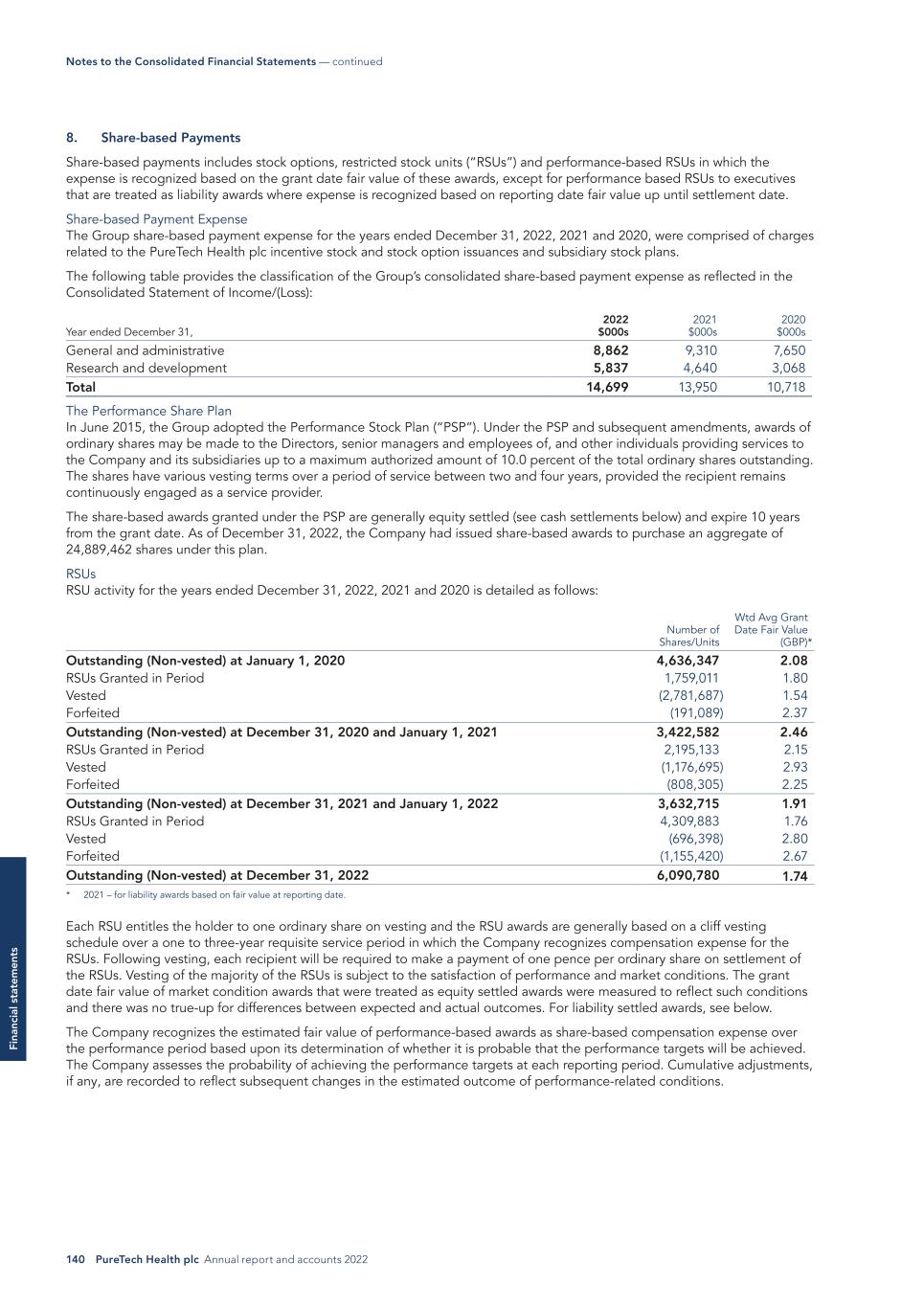 140 PureTech Health plc Annual report and accounts 2022 Fi na nc ia l s ta te m en ts 8. Share-based Payments Share-based payments includes stock options, restricted stock units (“RSUs”) and performance-based RSUs in which the expense is recognized based on the grant date fair value of these awards, except for performance based RSUs to executives that are treated as liability awards where expense is recognized based on reporting date fair value up until settlement date. Share-based Payment Expense The Group share-based payment expense for the years ended December 31, 2022, 2021 and 2020, were comprised of charges related to the PureTech Health plc incentive stock and stock option issuances and subsidiary stock plans. The following table provides the classification of the Group’s consolidated share-based payment expense as reflected in the Consolidated Statement of Income/(Loss): Year ended December 31, 2022 $000s 2021 $000s 2020 $000s General and administrative 8,862 9,310 7,650 Research and development 5,837 4,640 3,068 Total 14,699 13,950 10,718 The Performance Share Plan In June 2015, the Group adopted the Performance Stock Plan (“PSP”). Under the PSP and subsequent amendments, awards of ordinary shares may be made to the Directors, senior managers and employees of, and other individuals providing services to the Company and its subsidiaries up to a maximum authorized amount of 10.0 percent of the total ordinary shares outstanding. The shares have various vesting terms over a period of service between two and four years, provided the recipient remains continuously engaged as a service provider. The share-based awards granted under the PSP are generally equity settled (see cash settlements below) and expire 10 years from the grant date. As of December 31, 2022, the Company had issued share-based awards to purchase an aggregate of 24,889,462 shares under this plan. RSUs RSU activity for the years ended December 31, 2022, 2021 and 2020 is detailed as follows: Number of Shares/Units Wtd Avg Grant Date Fair Value (GBP)* Outstanding (Non-vested) at January 1, 2020 4,636,347 2.08 RSUs Granted in Period 1,759,011 1.80 Vested (2,781,687) 1.54 Forfeited (191,089) 2.37 Outstanding (Non-vested) at December 31, 2020 and January 1, 2021 3,422,582 2.46 RSUs Granted in Period 2,195,133 2.15 Vested (1,176,695) 2.93 Forfeited (808,305) 2.25 Outstanding (Non-vested) at December 31, 2021 and January 1, 2022 3,632,715 1.91 RSUs Granted in Period 4,309,883 1.76 Vested (696,398) 2.80 Forfeited (1,155,420) 2.67 Outstanding (Non-vested) at December 31, 2022 6,090,780 1.74 * 2021 – for liability awards based on fair value at reporting date. Each RSU entitles the holder to one ordinary share on vesting and the RSU awards are generally based on a cliff vesting schedule over a one to three-year requisite service period in which the Company recognizes compensation expense for the RSUs. Following vesting, each recipient will be required to make a payment of one pence per ordinary share on settlement of the RSUs. Vesting of the majority of the RSUs is subject to the satisfaction of performance and market conditions. The grant date fair value of market condition awards that were treated as equity settled awards were measured to reflect such conditions and there was no true-up for differences between expected and actual outcomes. For liability settled awards, see below. The Company recognizes the estimated fair value of performance-based awards as share-based compensation expense over the performance period based upon its determination of whether it is probable that the performance targets will be achieved. The Company assesses the probability of achieving the performance targets at each reporting period. Cumulative adjustments, if any, are recorded to reflect subsequent changes in the estimated outcome of performance-related conditions. Notes to the Consolidated Financial Statements — continued
