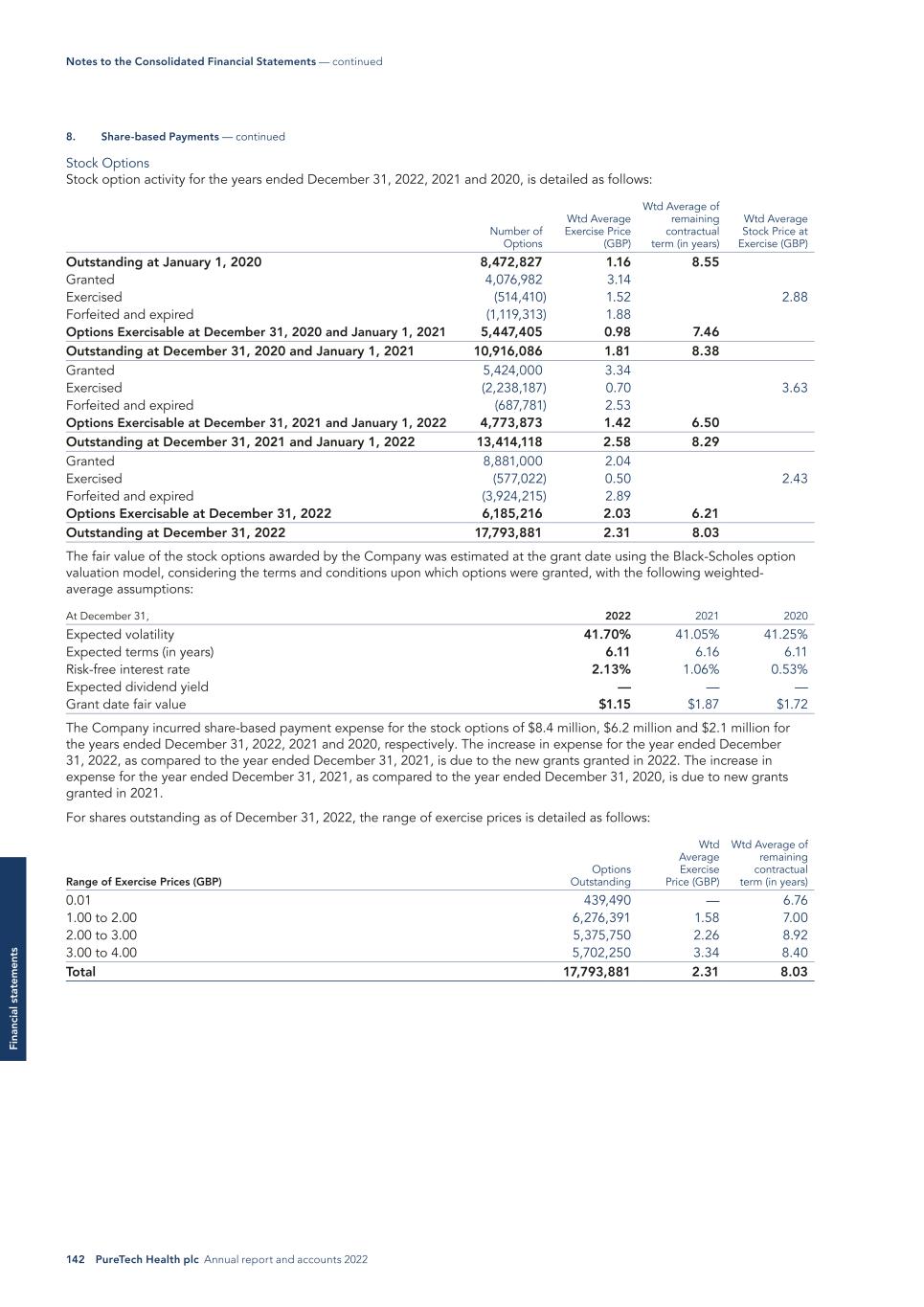 142 PureTech Health plc Annual report and accounts 2022 Fi na nc ia l s ta te m en ts Stock Options Stock option activity for the years ended December 31, 2022, 2021 and 2020, is detailed as follows: Number of Options Wtd Average Exercise Price (GBP) Wtd Average of remaining contractual term (in years) Wtd Average Stock Price at Exercise (GBP) Outstanding at January 1, 2020 8,472,827 1.16 8.55 Granted 4,076,982 3.14 Exercised (514,410) 1.52 2.88 Forfeited and expired (1,119,313) 1.88 Options Exercisable at December 31, 2020 and January 1, 2021 5,447,405 0.98 7.46 Outstanding at December 31, 2020 and January 1, 2021 10,916,086 1.81 8.38 Granted 5,424,000 3.34 Exercised (2,238,187) 0.70 3.63 Forfeited and expired (687,781) 2.53 Options Exercisable at December 31, 2021 and January 1, 2022 4,773,873 1.42 6.50 Outstanding at December 31, 2021 and January 1, 2022 13,414,118 2.58 8.29 Granted 8,881,000 2.04 Exercised (577,022) 0.50 2.43 Forfeited and expired (3,924,215) 2.89 Options Exercisable at December 31, 2022 6,185,216 2.03 6.21 Outstanding at December 31, 2022 17,793,881 2.31 8.03 The fair value of the stock options awarded by the Company was estimated at the grant date using the Black-Scholes option valuation model, considering the terms and conditions upon which options were granted, with the following weighted- average assumptions: At December 31, 2022 2021 2020 Expected volatility 41.70% 41.05% 41.25% Expected terms (in years) 6.11 6.16 6.11 Risk-free interest rate 2.13% 1.06% 0.53% Expected dividend yield — — — Grant date fair value $1.15 $1.87 $1.72 The Company incurred share-based payment expense for the stock options of $8.4 million, $6.2 million and $2.1 million for the years ended December 31, 2022, 2021 and 2020, respectively. The increase in expense for the year ended December 31, 2022, as compared to the year ended December 31, 2021, is due to the new grants granted in 2022. The increase in expense for the year ended December 31, 2021, as compared to the year ended December 31, 2020, is due to new grants granted in 2021. For shares outstanding as of December 31, 2022, the range of exercise prices is detailed as follows: Range of Exercise Prices (GBP) Options Outstanding Wtd Average Exercise Price (GBP) Wtd Average of remaining contractual term (in years) 0.01 439,490 — 6.76 1.00 to 2.00 6,276,391 1.58 7.00 2.00 to 3.00 5,375,750 2.26 8.92 3.00 to 4.00 5,702,250 3.34 8.40 Total 17,793,881 2.31 8.03 8. Share-based Payments — continued Notes to the Consolidated Financial Statements — continued