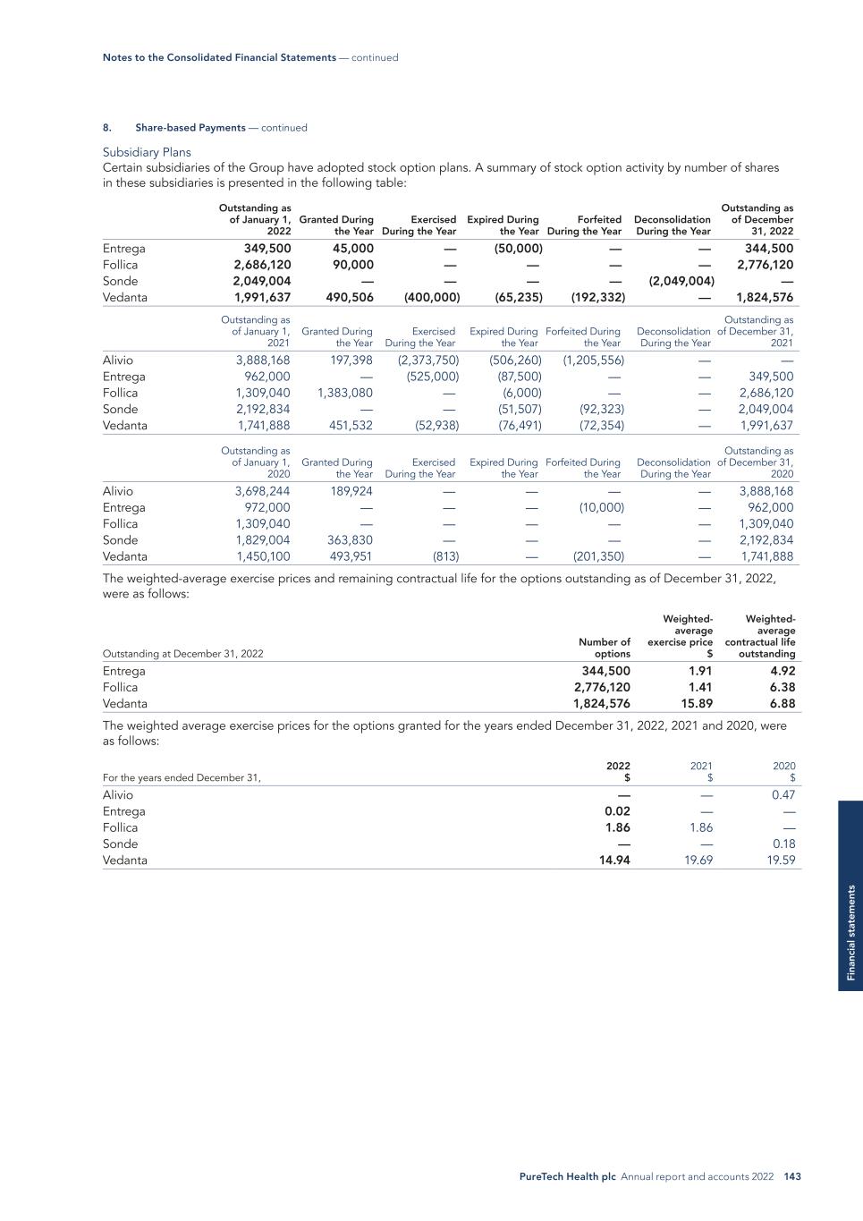 PureTech Health plc Annual report and accounts 2022 143 Fi na nc ia l s ta te m en ts Subsidiary Plans Certain subsidiaries of the Group have adopted stock option plans. A summary of stock option activity by number of shares in these subsidiaries is presented in the following table: Outstanding as of January 1, 2022 Granted During the Year Exercised During the Year Expired During the Year Forfeited During the Year Deconsolidation During the Year Outstanding as of December 31, 2022 Entrega 349,500 45,000 — (50,000) — — 344,500 Follica 2,686,120 90,000 — — — — 2,776,120 Sonde 2,049,004 — — — — (2,049,004) — Vedanta 1,991,637 490,506 (400,000) (65,235) (192,332) — 1,824,576 Outstanding as of January 1, 2021 Granted During the Year Exercised During the Year Expired During the Year Forfeited During the Year Deconsolidation During the Year Outstanding as of December 31, 2021 Alivio 3,888,168 197,398 (2,373,750) (506,260) (1,205,556) — — Entrega 962,000 — (525,000) (87,500) — — 349,500 Follica 1,309,040 1,383,080 — (6,000) — — 2,686,120 Sonde 2,192,834 — — (51,507) (92,323) — 2,049,004 Vedanta 1,741,888 451,532 (52,938) (76,491) (72,354) — 1,991,637 Outstanding as of January 1, 2020 Granted During the Year Exercised During the Year Expired During the Year Forfeited During the Year Deconsolidation During the Year Outstanding as of December 31, 2020 Alivio 3,698,244 189,924 — — — — 3,888,168 Entrega 972,000 — — — (10,000) — 962,000 Follica 1,309,040 — — — — — 1,309,040 Sonde 1,829,004 363,830 — — — — 2,192,834 Vedanta 1,450,100 493,951 (813) — (201,350) — 1,741,888 The weighted-average exercise prices and remaining contractual life for the options outstanding as of December 31, 2022, were as follows: Outstanding at December 31, 2022 Number of options Weighted- average exercise price $ Weighted- average contractual life outstanding Entrega 344,500 1.91 4.92 Follica 2,776,120 1.41 6.38 Vedanta 1,824,576 15.89 6.88 The weighted average exercise prices for the options granted for the years ended December 31, 2022, 2021 and 2020, were as follows: For the years ended December 31, 2022 $ 2021 $ 2020 $ Alivio — — 0.47 Entrega 0.02 — — Follica 1.86 1.86 — Sonde — — 0.18 Vedanta 14.94 19.69 19.59 8. Share-based Payments — continued Notes to the Consolidated Financial Statements — continued