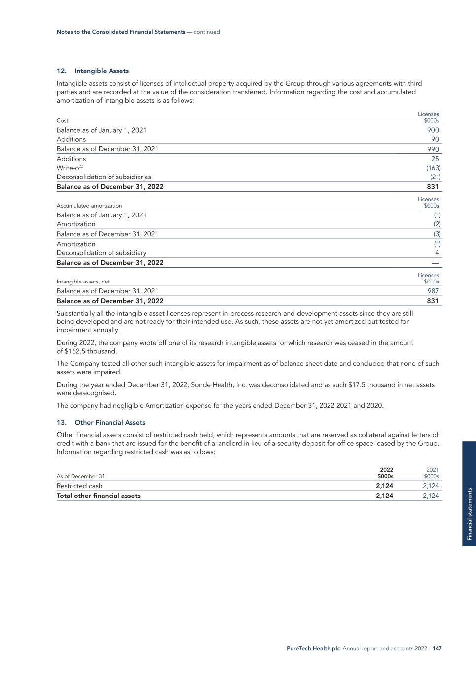 PureTech Health plc Annual report and accounts 2022 147 Fi na nc ia l s ta te m en ts 12. Intangible Assets Intangible assets consist of licenses of intellectual property acquired by the Group through various agreements with third parties and are recorded at the value of the consideration transferred. Information regarding the cost and accumulated amortization of intangible assets is as follows: Cost Licenses $000s Balance as of January 1, 2021 900 Additions 90 Balance as of December 31, 2021 990 Additions 25 Write-off (163) Deconsolidation of subsidiaries (21) Balance as of December 31, 2022 831 Accumulated amortization Licenses $000s Balance as of January 1, 2021 (1) Amortization (2) Balance as of December 31, 2021 (3) Amortization (1) Deconsolidation of subsidiary 4 Balance as of December 31, 2022 — Intangible assets, net Licenses $000s Balance as of December 31, 2021 987 Balance as of December 31, 2022 831 Substantially all the intangible asset licenses represent in-process-research-and-development assets since they are still being developed and are not ready for their intended use. As such, these assets are not yet amortized but tested for impairment annually. During 2022, the company wrote off one of its research intangible assets for which research was ceased in the amount of $162.5 thousand. The Company tested all other such intangible assets for impairment as of balance sheet date and concluded that none of such assets were impaired. During the year ended December 31, 2022, Sonde Health, Inc. was deconsolidated and as such $17.5 thousand in net assets were derecognised. The company had negligible Amortization expense for the years ended December 31, 2022 2021 and 2020. 13. Other Financial Assets Other financial assets consist of restricted cash held, which represents amounts that are reserved as collateral against letters of credit with a bank that are issued for the benefit of a landlord in lieu of a security deposit for office space leased by the Group. Information regarding restricted cash was as follows: 2022 $000s 2021 $000sAs of December 31, Restricted cash 2,124 2,124 Total other financial assets 2,124 2,124 Notes to the Consolidated Financial Statements — continued