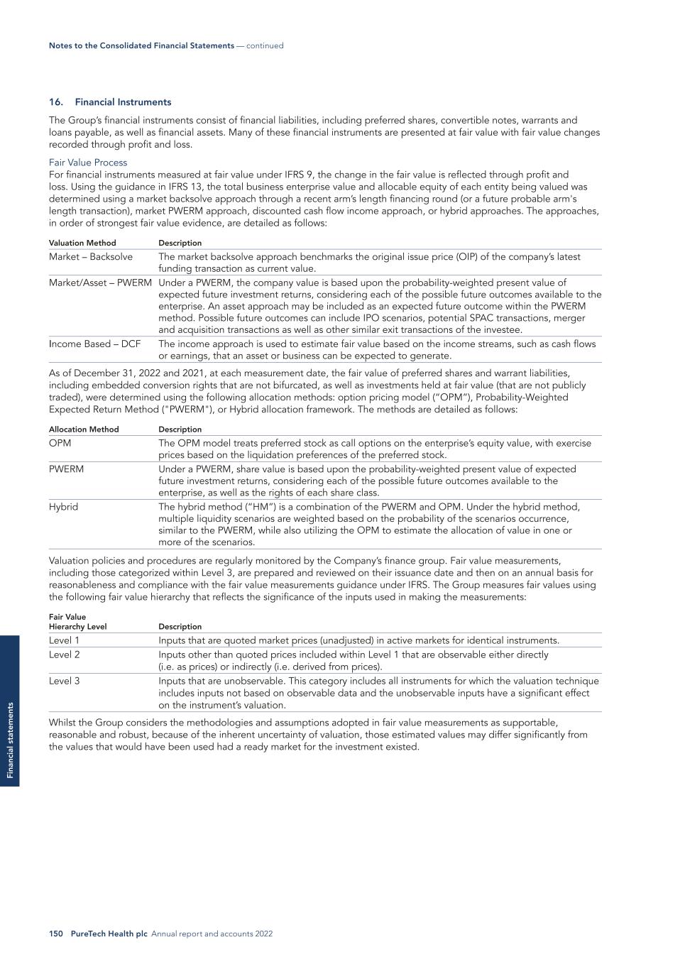 150 PureTech Health plc Annual report and accounts 2022 Fi na nc ia l s ta te m en ts 16. Financial Instruments The Group’s financial instruments consist of financial liabilities, including preferred shares, convertible notes, warrants and loans payable, as well as financial assets. Many of these financial instruments are presented at fair value with fair value changes recorded through profit and loss. Fair Value Process For financial instruments measured at fair value under IFRS 9, the change in the fair value is reflected through profit and loss. Using the guidance in IFRS 13, the total business enterprise value and allocable equity of each entity being valued was determined using a market backsolve approach through a recent arm’s length financing round (or a future probable arm's length transaction), market PWERM approach, discounted cash flow income approach, or hybrid approaches. The approaches, in order of strongest fair value evidence, are detailed as follows: Valuation Method Description Market – Backsolve The market backsolve approach benchmarks the original issue price (OIP) of the company’s latest funding transaction as current value. Market/Asset – PWERM Under a PWERM, the company value is based upon the probability-weighted present value of expected future investment returns, considering each of the possible future outcomes available to the enterprise. An asset approach may be included as an expected future outcome within the PWERM method. Possible future outcomes can include IPO scenarios, potential SPAC transactions, merger and acquisition transactions as well as other similar exit transactions of the investee. Income Based – DCF The income approach is used to estimate fair value based on the income streams, such as cash flows or earnings, that an asset or business can be expected to generate. As of December 31, 2022 and 2021, at each measurement date, the fair value of preferred shares and warrant liabilities, including embedded conversion rights that are not bifurcated, as well as investments held at fair value (that are not publicly traded), were determined using the following allocation methods: option pricing model (“OPM”), Probability-Weighted Expected Return Method ("PWERM"), or Hybrid allocation framework. The methods are detailed as follows: Allocation Method Description OPM The OPM model treats preferred stock as call options on the enterprise’s equity value, with exercise prices based on the liquidation preferences of the preferred stock. PWERM Under a PWERM, share value is based upon the probability-weighted present value of expected future investment returns, considering each of the possible future outcomes available to the enterprise, as well as the rights of each share class. Hybrid The hybrid method (“HM”) is a combination of the PWERM and OPM. Under the hybrid method, multiple liquidity scenarios are weighted based on the probability of the scenarios occurrence, similar to the PWERM, while also utilizing the OPM to estimate the allocation of value in one or more of the scenarios. Valuation policies and procedures are regularly monitored by the Company’s finance group. Fair value measurements, including those categorized within Level 3, are prepared and reviewed on their issuance date and then on an annual basis for reasonableness and compliance with the fair value measurements guidance under IFRS. The Group measures fair values using the following fair value hierarchy that reflects the significance of the inputs used in making the measurements: Fair Value Hierarchy Level Description Level 1 Inputs that are quoted market prices (unadjusted) in active markets for identical instruments. Level 2 Inputs other than quoted prices included within Level 1 that are observable either directly (i.e. as prices) or indirectly (i.e. derived from prices). Level 3 Inputs that are unobservable. This category includes all instruments for which the valuation technique includes inputs not based on observable data and the unobservable inputs have a significant effect on the instrument’s valuation. Whilst the Group considers the methodologies and assumptions adopted in fair value measurements as supportable, reasonable and robust, because of the inherent uncertainty of valuation, those estimated values may differ significantly from the values that would have been used had a ready market for the investment existed. Notes to the Consolidated Financial Statements — continued