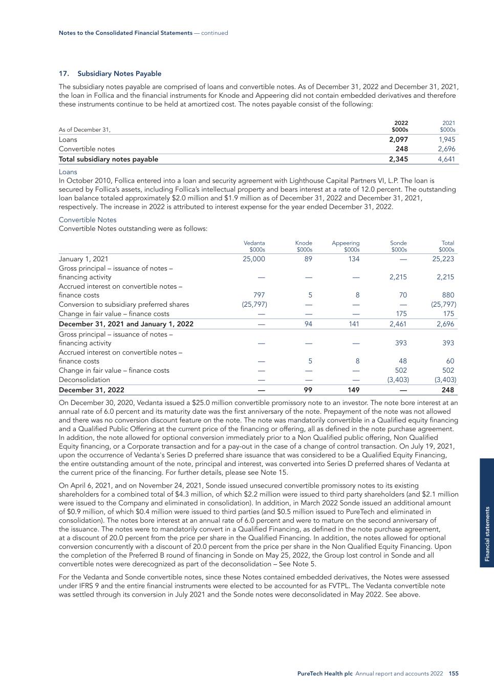 PureTech Health plc Annual report and accounts 2022 155 Fi na nc ia l s ta te m en ts 17. Subsidiary Notes Payable The subsidiary notes payable are comprised of loans and convertible notes. As of December 31, 2022 and December 31, 2021, the loan in Follica and the financial instruments for Knode and Appeering did not contain embedded derivatives and therefore these instruments continue to be held at amortized cost. The notes payable consist of the following: 2022 $000s 2021 $000sAs of December 31, Loans 2,097 1,945 Convertible notes 248 2,696 Total subsidiary notes payable 2,345 4,641 Loans In October 2010, Follica entered into a loan and security agreement with Lighthouse Capital Partners VI, L.P. The loan is secured by Follica’s assets, including Follica’s intellectual property and bears interest at a rate of 12.0 percent. The outstanding loan balance totaled approximately $2.0 million and $1.9 million as of December 31, 2022 and December 31, 2021, respectively. The increase in 2022 is attributed to interest expense for the year ended December 31, 2022. Convertible Notes Convertible Notes outstanding were as follows: Vedanta $000s Knode $000s Appeering $000s Sonde $000s Total $000s January 1, 2021 25,000 89 134 — 25,223 Gross principal – issuance of notes – financing activity — — — 2,215 2,215 Accrued interest on convertible notes – finance costs 797 5 8 70 880 Conversion to subsidiary preferred shares (25,797) — — — (25,797) Change in fair value – finance costs — — — 175 175 December 31, 2021 and January 1, 2022 — 94 141 2,461 2,696 Gross principal – issuance of notes – financing activity — — — 393 393 Accrued interest on convertible notes – finance costs — 5 8 48 60 Change in fair value – finance costs — — — 502 502 Deconsolidation — — — (3,403) (3,403) December 31, 2022 — 99 149 — 248 On December 30, 2020, Vedanta issued a $25.0 million convertible promissory note to an investor. The note bore interest at an annual rate of 6.0 percent and its maturity date was the first anniversary of the note. Prepayment of the note was not allowed and there was no conversion discount feature on the note. The note was mandatorily convertible in a Qualified equity financing and a Qualified Public Offering at the current price of the financing or offering, all as defined in the note purchase agreement. In addition, the note allowed for optional conversion immediately prior to a Non Qualified public offering, Non Qualified Equity financing, or a Corporate transaction and for a pay-out in the case of a change of control transaction. On July 19, 2021, upon the occurrence of Vedanta's Series D preferred share issuance that was considered to be a Qualified Equity Financing, the entire outstanding amount of the note, principal and interest, was converted into Series D preferred shares of Vedanta at the current price of the financing. For further details, please see Note 15. On April 6, 2021, and on November 24, 2021, Sonde issued unsecured convertible promissory notes to its existing shareholders for a combined total of $4.3 million, of which $2.2 million were issued to third party shareholders (and $2.1 million were issued to the Company and eliminated in consolidation). In addition, in March 2022 Sonde issued an additional amount of $0.9 million, of which $0.4 million were issued to third parties (and $0.5 million issued to PureTech and eliminated in consolidation). The notes bore interest at an annual rate of 6.0 percent and were to mature on the second anniversary of the issuance. The notes were to mandatorily convert in a Qualified Financing, as defined in the note purchase agreement, at a discount of 20.0 percent from the price per share in the Qualified Financing. In addition, the notes allowed for optional conversion concurrently with a discount of 20.0 percent from the price per share in the Non Qualified Equity Financing. Upon the completion of the Preferred B round of financing in Sonde on May 25, 2022, the Group lost control in Sonde and all convertible notes were derecognized as part of the deconsolidation – See Note 5. For the Vedanta and Sonde convertible notes, since these Notes contained embedded derivatives, the Notes were assessed under IFRS 9 and the entire financial instruments were elected to be accounted for as FVTPL. The Vedanta convertible note was settled through its conversion in July 2021 and the Sonde notes were deconsolidated in May 2022. See above. Notes to the Consolidated Financial Statements — continued