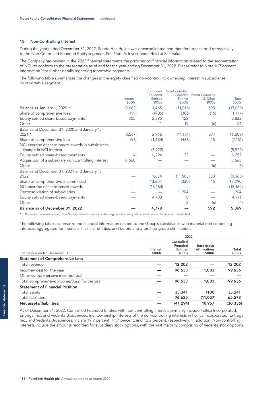 156 PureTech Health plc Annual report and accounts 2022 Fi na nc ia l s ta te m en ts 18. Non-Controlling Interest During the year ended December 31, 2022, Sonde Health, Inc was deconsolidated and therefore transferred retroactively to the Non-Controlled Founded Entity segment. See Note 5. Investments Held at Fair Value. The Company has revised in the 2022 financial statements the prior period financial information related to the segmentation of NCI, to conform to the presentation as of and for the year ending December 31, 2022. Please refer to Note 4 “Segment Information” for further details regarding reportable segments. The following table summarizes the changes in the equity classified non-controlling ownership interest in subsidiaries by reportable segment: Internal $000s Controlled Founded Entities $000s Non-Controlled Founded Entities $000s Parent Company & Other $000s Total $000s Balance at January 1, 2020 * (8,682) 1,465 (11,016) 593 (17,639) Share of comprehensive loss (191) (905) (306) (15) (1,417) Equity settled share-based payments 305 2,395 122 — 2,822 Other — 11 19 (6) 24 Balance at December 31, 2020 and January 1, 2021 * (8,567) 2,966 (11,181) 574 (16,209) Share of comprehensive loss (96) (1,634) (436) 15 (2,151) NCI exercise of share-based awards in subsidiaries – change in NCI interest — (5,922) — — (5,922) Equity settled share-based payments (4) 6,224 32 — 6,252 Acquisition of a subsidiary non controlling interest 8,668 — — — 8,668 Other — — — (6) (6) Balance at December 31, 2021 and January 1, 2022 — 1,634 (11,585) 583 (9,368) Share of comprehensive income (loss) — 13,604 (330) 15 13,290 NCI exercise of share-based awards — (15,164) — — (15,164) Deconsolidation of subsidiaries — — 11,904 — 11,904 Equity settled share-based payments — 4,703 8 — 4,711 Other — — 2 (6) (4) Balance as of December 31, 2022 — 4,778 — 592 5,369 * Revised to reclassify Sonde to the Non-controlled Founded Entities segment to comply with current period classification. See Note 4. The following tables summarize the financial information related to the Group’s subsidiaries with material non-controlling interests, aggregated for interests in similar entities, and before and after intra group eliminations. 2022 For the year ended December 31 Internal $000s Controlled Founded Entities $000s Intra-group eliminations $000s Total $000s Statement of Comprehensive Loss Total revenue — 12,202 — 12,202 Income/(loss) for the year — 98,633 1,003 99,636 Other comprehensive income/(loss) — — — — Total comprehensive income/(loss) for the year — 98,633 1,003 99,636 Statement of Financial Position Total assets — 35,341 (100) 35,241 Total liabilities — 76,635 (11,057) 65,578 Net assets/(liabilities) — (41,294) 10,957 (30,336) As of December 31, 2022, Controlled Founded Entities with non-controlling interests primarily include Follica Incorporated, Entrega Inc., and Vedanta Biosciences, Inc. Ownership interests of the non-controlling interests in Follica Incorporated, Entrega Inc., and Vedanta Biosciences, Inc are 19.9 percent, 11.7 percent, and 12.2 percent, respectively. In addition, Non-controlling interests include the amounts recorded for subsidiary stock options, with the vast majority comprising of Vedanta stock options. Notes to the Consolidated Financial Statements — continued