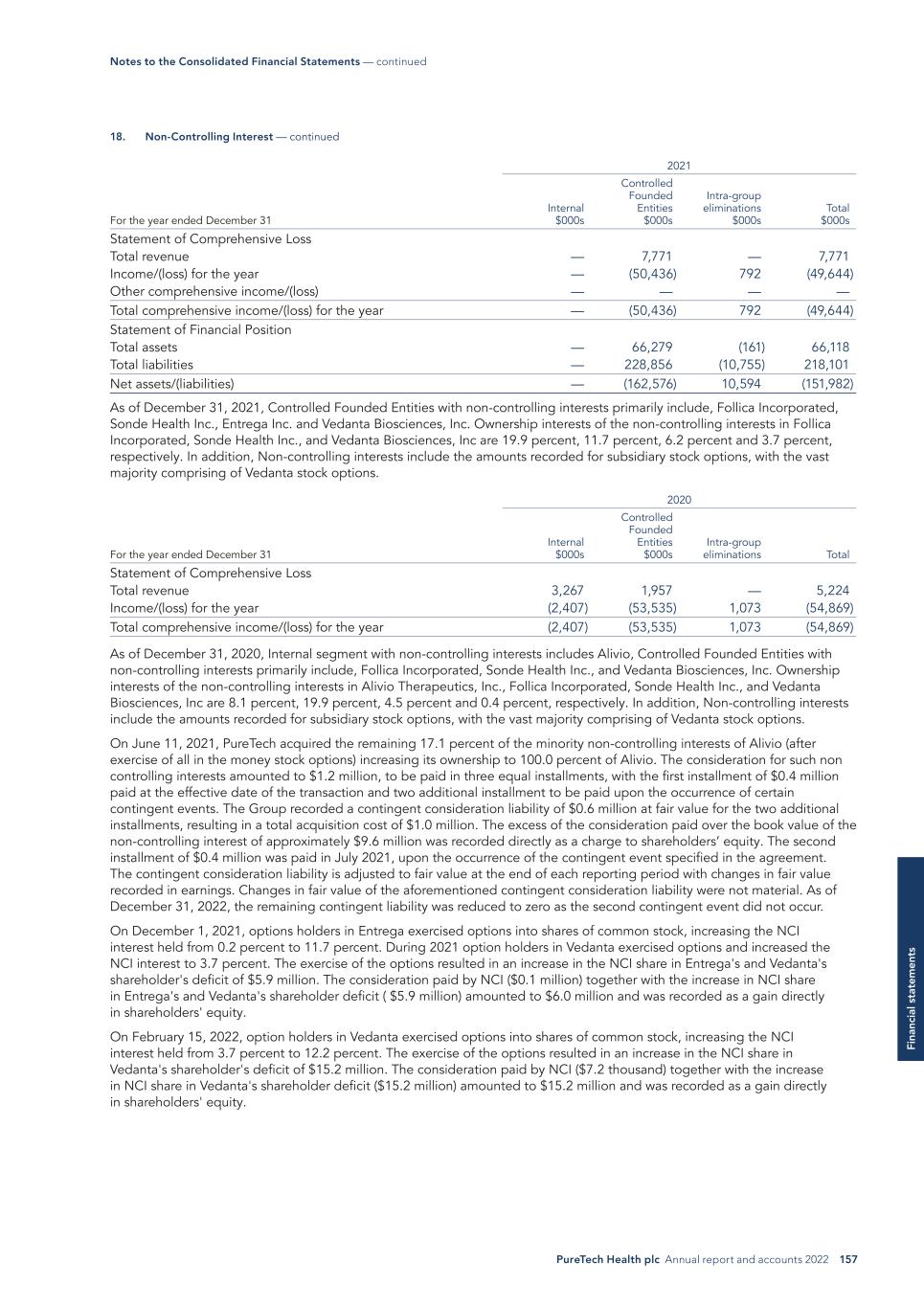 PureTech Health plc Annual report and accounts 2022 157 Fi na nc ia l s ta te m en ts 2021 For the year ended December 31 Internal $000s Controlled Founded Entities $000s Intra-group eliminations $000s Total $000s Statement of Comprehensive Loss Total revenue — 7,771 — 7,771 Income/(loss) for the year — (50,436) 792 (49,644) Other comprehensive income/(loss) — — — — Total comprehensive income/(loss) for the year — (50,436) 792 (49,644) Statement of Financial Position Total assets — 66,279 (161) 66,118 Total liabilities — 228,856 (10,755) 218,101 Net assets/(liabilities) — (162,576) 10,594 (151,982) As of December 31, 2021, Controlled Founded Entities with non-controlling interests primarily include, Follica Incorporated, Sonde Health Inc., Entrega Inc. and Vedanta Biosciences, Inc. Ownership interests of the non-controlling interests in Follica Incorporated, Sonde Health Inc., and Vedanta Biosciences, Inc are 19.9 percent, 11.7 percent, 6.2 percent and 3.7 percent, respectively. In addition, Non-controlling interests include the amounts recorded for subsidiary stock options, with the vast majority comprising of Vedanta stock options. 2020 For the year ended December 31 Internal $000s Controlled Founded Entities $000s Intra-group eliminations Total Statement of Comprehensive Loss Total revenue 3,267 1,957 — 5,224 Income/(loss) for the year (2,407) (53,535) 1,073 (54,869) Total comprehensive income/(loss) for the year (2,407) (53,535) 1,073 (54,869) As of December 31, 2020, Internal segment with non-controlling interests includes Alivio, Controlled Founded Entities with non-controlling interests primarily include, Follica Incorporated, Sonde Health Inc., and Vedanta Biosciences, Inc. Ownership interests of the non-controlling interests in Alivio Therapeutics, Inc., Follica Incorporated, Sonde Health Inc., and Vedanta Biosciences, Inc are 8.1 percent, 19.9 percent, 4.5 percent and 0.4 percent, respectively. In addition, Non-controlling interests include the amounts recorded for subsidiary stock options, with the vast majority comprising of Vedanta stock options. On June 11, 2021, PureTech acquired the remaining 17.1 percent of the minority non-controlling interests of Alivio (after exercise of all in the money stock options) increasing its ownership to 100.0 percent of Alivio. The consideration for such non controlling interests amounted to $1.2 million, to be paid in three equal installments, with the first installment of $0.4 million paid at the effective date of the transaction and two additional installment to be paid upon the occurrence of certain contingent events. The Group recorded a contingent consideration liability of $0.6 million at fair value for the two additional installments, resulting in a total acquisition cost of $1.0 million. The excess of the consideration paid over the book value of the non-controlling interest of approximately $9.6 million was recorded directly as a charge to shareholders’ equity. The second installment of $0.4 million was paid in July 2021, upon the occurrence of the contingent event specified in the agreement. The contingent consideration liability is adjusted to fair value at the end of each reporting period with changes in fair value recorded in earnings. Changes in fair value of the aforementioned contingent consideration liability were not material. As of December 31, 2022, the remaining contingent liability was reduced to zero as the second contingent event did not occur. On December 1, 2021, options holders in Entrega exercised options into shares of common stock, increasing the NCI interest held from 0.2 percent to 11.7 percent. During 2021 option holders in Vedanta exercised options and increased the NCI interest to 3.7 percent. The exercise of the options resulted in an increase in the NCI share in Entrega's and Vedanta's shareholder's deficit of $5.9 million. The consideration paid by NCI ($0.1 million) together with the increase in NCI share in Entrega's and Vedanta's shareholder deficit ( $5.9 million) amounted to $6.0 million and was recorded as a gain directly in shareholders' equity. On February 15, 2022, option holders in Vedanta exercised options into shares of common stock, increasing the NCI interest held from 3.7 percent to 12.2 percent. The exercise of the options resulted in an increase in the NCI share in Vedanta's shareholder's deficit of $15.2 million. The consideration paid by NCI ($7.2 thousand) together with the increase in NCI share in Vedanta's shareholder deficit ($15.2 million) amounted to $15.2 million and was recorded as a gain directly in shareholders' equity. Notes to the Consolidated Financial Statements — continued 18. Non-Controlling Interest — continued