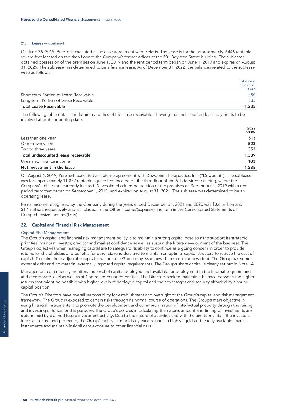 160 PureTech Health plc Annual report and accounts 2022 Fi na nc ia l s ta te m en ts On June 26, 2019, PureTech executed a sublease agreement with Gelesis. The lease is for the approximately 9,446 rentable square feet located on the sixth floor of the Company’s former offices at the 501 Boylston Street building. The sublessee obtained possession of the premises on June 1, 2019 and the rent period term began on June 1, 2019 and expires on August 31, 2025. The sublease was determined to be a finance lease. As of December 31, 2022, the balances related to the sublease were as follows: Total lease receivable $000s Short-term Portion of Lease Receivable 450 Long-term Portion of Lease Receivable 835 Total Lease Receivable 1,285 The following table details the future maturities of the lease receivable, showing the undiscounted lease payments to be received after the reporting date: 2022 $000s Less than one year 513 One to two years 523 Two to three years 353 Total undiscounted lease receivable 1,389 Unearned Finance income 103 Net investment in the lease 1,285 On August 6, 2019, PureTech executed a sublease agreement with Dewpoint Therapeutics, Inc. (“Dewpoint”). The sublease was for approximately 11,852 rentable square feet located on the third floor of the 6 Tide Street building, where the Company’s offices are currently located. Dewpoint obtained possession of the premises on September 1, 2019 with a rent period term that began on September 1, 2019, and expired on August 31, 2021. The sublease was determined to be an operating lease. Rental income recognized by the Company during the years ended December 31, 2021 and 2020 was $0.6 million and $1.1 million, respectively and is included in the Other income/(expense) line item in the Consolidated Statements of Comprehensive Income/(Loss). 22. Capital and Financial Risk Management Capital Risk Management The Group's capital and financial risk management policy is to maintain a strong capital base so as to support its strategic priorities, maintain investor, creditor and market confidence as well as sustain the future development of the business. The Group’s objectives when managing capital are to safeguard its ability to continue as a going concern in order to provide returns for shareholders and benefits for other stakeholders and to maintain an optimal capital structure to reduce the cost of capital. To maintain or adjust the capital structure, the Group may issue new shares or incur new debt. The Group has some external debt and no material externally imposed capital requirements. The Group’s share capital is clearly set out in Note 14. Management continuously monitors the level of capital deployed and available for deployment in the Internal segment and at the corporate level as well as at Controlled Founded Entities. The Directors seek to maintain a balance between the higher returns that might be possible with higher levels of deployed capital and the advantages and security afforded by a sound capital position. The Group’s Directors have overall responsibility for establishment and oversight of the Group's capital and risk management framework. The Group is exposed to certain risks through its normal course of operations. The Group’s main objective in using financial instruments is to promote the development and commercialization of intellectual property through the raising and investing of funds for this purpose. The Group’s policies in calculating the nature, amount and timing of investments are determined by planned future investment activity. Due to the nature of activities and with the aim to maintain the investors’ funds as secure and protected, the Group’s policy is to hold any excess funds in highly liquid and readily available financial instruments and maintain insignificant exposure to other financial risks. Notes to the Consolidated Financial Statements — continued 21. Leases — continued