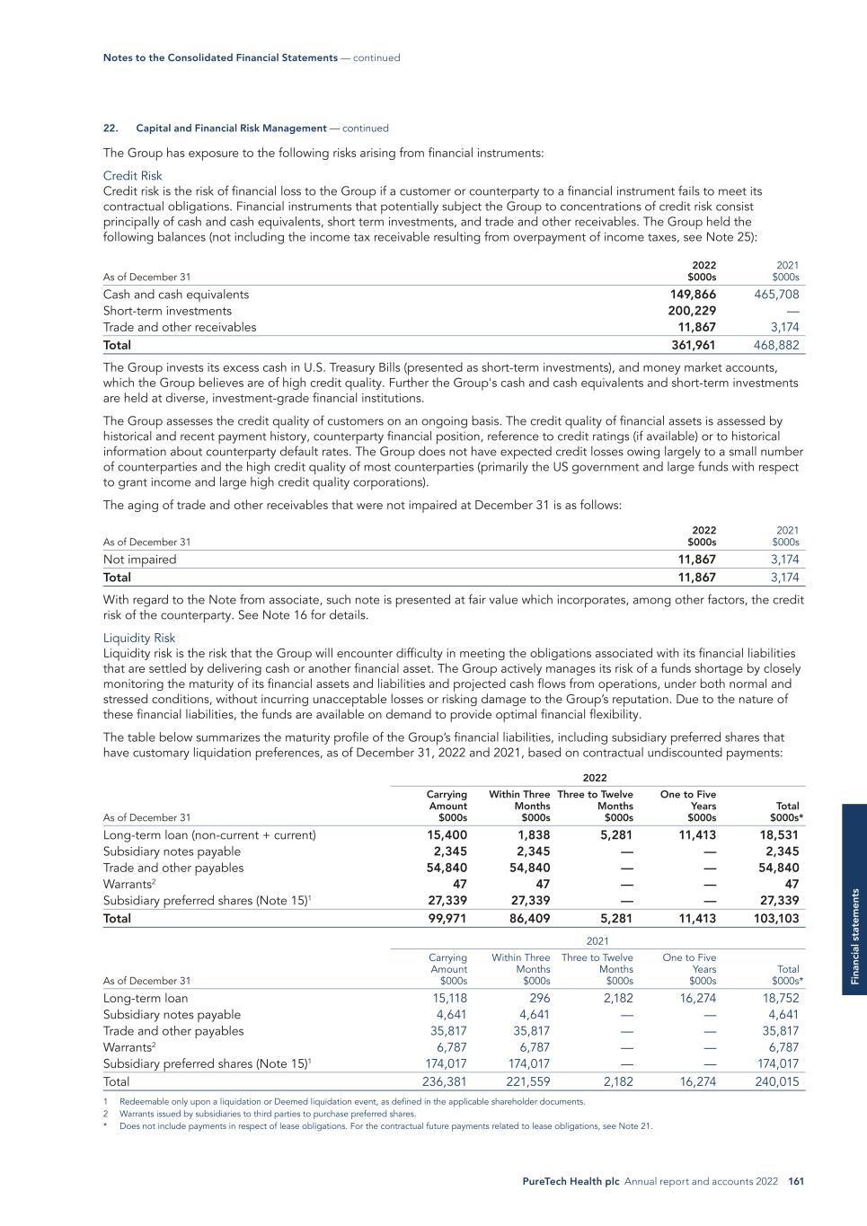 PureTech Health plc Annual report and accounts 2022 161 Fi na nc ia l s ta te m en ts The Group has exposure to the following risks arising from financial instruments: Credit Risk Credit risk is the risk of financial loss to the Group if a customer or counterparty to a financial instrument fails to meet its contractual obligations. Financial instruments that potentially subject the Group to concentrations of credit risk consist principally of cash and cash equivalents, short term investments, and trade and other receivables. The Group held the following balances (not including the income tax receivable resulting from overpayment of income taxes, see Note 25): 2022 $000s 2021 $000sAs of December 31 Cash and cash equivalents 149,866 465,708 Short-term investments 200,229 — Trade and other receivables 11,867 3,174 Total 361,961 468,882 The Group invests its excess cash in U.S. Treasury Bills (presented as short-term investments), and money market accounts, which the Group believes are of high credit quality. Further the Group's cash and cash equivalents and short-term investments are held at diverse, investment-grade financial institutions. The Group assesses the credit quality of customers on an ongoing basis. The credit quality of financial assets is assessed by historical and recent payment history, counterparty financial position, reference to credit ratings (if available) or to historical information about counterparty default rates. The Group does not have expected credit losses owing largely to a small number of counterparties and the high credit quality of most counterparties (primarily the US government and large funds with respect to grant income and large high credit quality corporations). The aging of trade and other receivables that were not impaired at December 31 is as follows: As of December 31 2022 $000s 2021 $000s Not impaired 11,867 3,174 Total 11,867 3,174 With regard to the Note from associate, such note is presented at fair value which incorporates, among other factors, the credit risk of the counterparty. See Note 16 for details. Liquidity Risk Liquidity risk is the risk that the Group will encounter difficulty in meeting the obligations associated with its financial liabilities that are settled by delivering cash or another financial asset. The Group actively manages its risk of a funds shortage by closely monitoring the maturity of its financial assets and liabilities and projected cash flows from operations, under both normal and stressed conditions, without incurring unacceptable losses or risking damage to the Group’s reputation. Due to the nature of these financial liabilities, the funds are available on demand to provide optimal financial flexibility. The table below summarizes the maturity profile of the Group’s financial liabilities, including subsidiary preferred shares that have customary liquidation preferences, as of December 31, 2022 and 2021, based on contractual undiscounted payments: As of December 31 2022 Carrying Amount $000s Within Three Months $000s Three to Twelve Months $000s One to Five Years $000s Total $000s* Long-term loan (non-current + current) 15,400 1,838 5,281 11,413 18,531 Subsidiary notes payable 2,345 2,345 — — 2,345 Trade and other payables 54,840 54,840 — — 54,840 Warrants2 47 47 — — 47 Subsidiary preferred shares (Note 15)1 27,339 27,339 — — 27,339 Total 99,971 86,409 5,281 11,413 103,103 As of December 31 2021 Carrying Amount $000s Within Three Months $000s Three to Twelve Months $000s One to Five Years $000s Total $000s* Long-term loan 15,118 296 2,182 16,274 18,752 Subsidiary notes payable 4,641 4,641 — — 4,641 Trade and other payables 35,817 35,817 — — 35,817 Warrants2 6,787 6,787 — — 6,787 Subsidiary preferred shares (Note 15)1 174,017 174,017 — — 174,017 Total 236,381 221,559 2,182 16,274 240,015 1 Redeemable only upon a liquidation or Deemed liquidation event, as defined in the applicable shareholder documents. 2 Warrants issued by subsidiaries to third parties to purchase preferred shares. * Does not include payments in respect of lease obligations. For the contractual future payments related to lease obligations, see Note 21. 22. Capital and Financial Risk Management — continued Notes to the Consolidated Financial Statements — continued