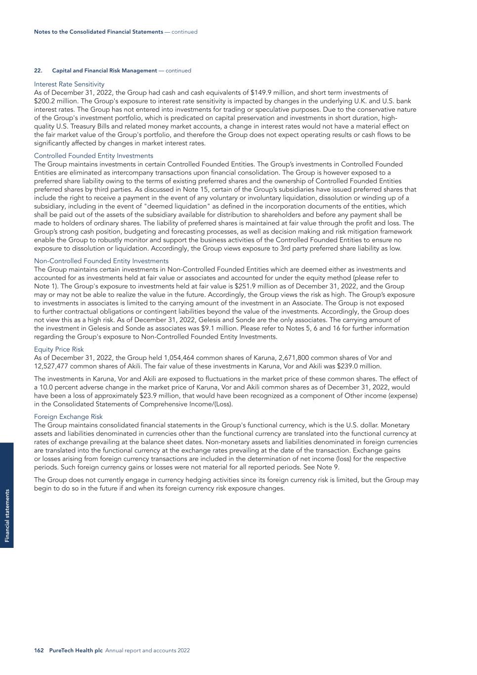 162 PureTech Health plc Annual report and accounts 2022 Fi na nc ia l s ta te m en ts Interest Rate Sensitivity As of December 31, 2022, the Group had cash and cash equivalents of $149.9 million, and short term investments of $200.2 million. The Group's exposure to interest rate sensitivity is impacted by changes in the underlying U.K. and U.S. bank interest rates. The Group has not entered into investments for trading or speculative purposes. Due to the conservative nature of the Group's investment portfolio, which is predicated on capital preservation and investments in short duration, high- quality U.S. Treasury Bills and related money market accounts, a change in interest rates would not have a material effect on the fair market value of the Group's portfolio, and therefore the Group does not expect operating results or cash flows to be significantly affected by changes in market interest rates. Controlled Founded Entity Investments The Group maintains investments in certain Controlled Founded Entities. The Group’s investments in Controlled Founded Entities are eliminated as intercompany transactions upon financial consolidation. The Group is however exposed to a preferred share liability owing to the terms of existing preferred shares and the ownership of Controlled Founded Entities preferred shares by third parties. As discussed in Note 15, certain of the Group’s subsidiaries have issued preferred shares that include the right to receive a payment in the event of any voluntary or involuntary liquidation, dissolution or winding up of a subsidiary, including in the event of "deemed liquidation" as defined in the incorporation documents of the entities, which shall be paid out of the assets of the subsidiary available for distribution to shareholders and before any payment shall be made to holders of ordinary shares. The liability of preferred shares is maintained at fair value through the profit and loss. The Group’s strong cash position, budgeting and forecasting processes, as well as decision making and risk mitigation framework enable the Group to robustly monitor and support the business activities of the Controlled Founded Entities to ensure no exposure to dissolution or liquidation. Accordingly, the Group views exposure to 3rd party preferred share liability as low. Non-Controlled Founded Entity Investments The Group maintains certain investments in Non-Controlled Founded Entities which are deemed either as investments and accounted for as investments held at fair value or associates and accounted for under the equity method (please refer to Note 1). The Group's exposure to investments held at fair value is $251.9 million as of December 31, 2022, and the Group may or may not be able to realize the value in the future. Accordingly, the Group views the risk as high. The Group’s exposure to investments in associates is limited to the carrying amount of the investment in an Associate. The Group is not exposed to further contractual obligations or contingent liabilities beyond the value of the investments. Accordingly, the Group does not view this as a high risk. As of December 31, 2022, Gelesis and Sonde are the only associates. The carrying amount of the investment in Gelesis and Sonde as associates was $9.1 million. Please refer to Notes 5, 6 and 16 for further information regarding the Group's exposure to Non-Controlled Founded Entity Investments. Equity Price Risk As of December 31, 2022, the Group held 1,054,464 common shares of Karuna, 2,671,800 common shares of Vor and 12,527,477 common shares of Akili. The fair value of these investments in Karuna, Vor and Akili was $239.0 million. The investments in Karuna, Vor and Akili are exposed to fluctuations in the market price of these common shares. The effect of a 10.0 percent adverse change in the market price of Karuna, Vor and Akili common shares as of December 31, 2022, would have been a loss of approximately $23.9 million, that would have been recognized as a component of Other income (expense) in the Consolidated Statements of Comprehensive Income/(Loss). Foreign Exchange Risk The Group maintains consolidated financial statements in the Group's functional currency, which is the U.S. dollar. Monetary assets and liabilities denominated in currencies other than the functional currency are translated into the functional currency at rates of exchange prevailing at the balance sheet dates. Non-monetary assets and liabilities denominated in foreign currencies are translated into the functional currency at the exchange rates prevailing at the date of the transaction. Exchange gains or losses arising from foreign currency transactions are included in the determination of net income (loss) for the respective periods. Such foreign currency gains or losses were not material for all reported periods. See Note 9. The Group does not currently engage in currency hedging activities since its foreign currency risk is limited, but the Group may begin to do so in the future if and when its foreign currency risk exposure changes. Notes to the Consolidated Financial Statements — continued 22. Capital and Financial Risk Management — continued