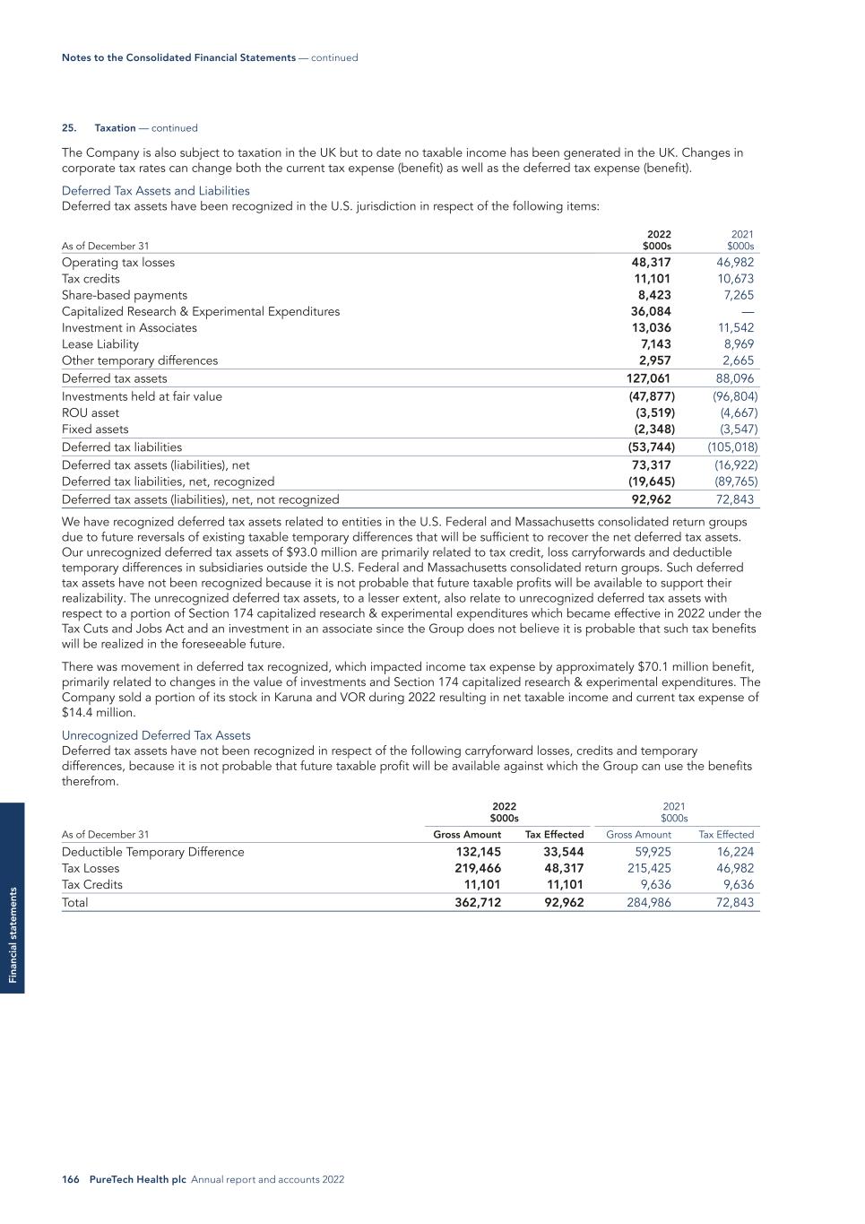 166 PureTech Health plc Annual report and accounts 2022 Fi na nc ia l s ta te m en ts The Company is also subject to taxation in the UK but to date no taxable income has been generated in the UK. Changes in corporate tax rates can change both the current tax expense (benefit) as well as the deferred tax expense (benefit). Deferred Tax Assets and Liabilities Deferred tax assets have been recognized in the U.S. jurisdiction in respect of the following items: 2022 $000s 2021 $000sAs of December 31 Operating tax losses 48,317 46,982 Tax credits 11,101 10,673 Share-based payments 8,423 7,265 Capitalized Research & Experimental Expenditures 36,084 — Investment in Associates 13,036 11,542 Lease Liability 7,143 8,969 Other temporary differences 2,957 2,665 Deferred tax assets 127,061 88,096 Investments held at fair value (47,877) (96,804) ROU asset (3,519) (4,667) Fixed assets (2,348) (3,547) Deferred tax liabilities (53,744) (105,018) Deferred tax assets (liabilities), net 73,317 (16,922) Deferred tax liabilities, net, recognized (19,645) (89,765) Deferred tax assets (liabilities), net, not recognized 92,962 72,843 We have recognized deferred tax assets related to entities in the U.S. Federal and Massachusetts consolidated return groups due to future reversals of existing taxable temporary differences that will be sufficient to recover the net deferred tax assets. Our unrecognized deferred tax assets of $93.0 million are primarily related to tax credit, loss carryforwards and deductible temporary differences in subsidiaries outside the U.S. Federal and Massachusetts consolidated return groups. Such deferred tax assets have not been recognized because it is not probable that future taxable profits will be available to support their realizability. The unrecognized deferred tax assets, to a lesser extent, also relate to unrecognized deferred tax assets with respect to a portion of Section 174 capitalized research & experimental expenditures which became effective in 2022 under the Tax Cuts and Jobs Act and an investment in an associate since the Group does not believe it is probable that such tax benefits will be realized in the foreseeable future. There was movement in deferred tax recognized, which impacted income tax expense by approximately $70.1 million benefit, primarily related to changes in the value of investments and Section 174 capitalized research & experimental expenditures. The Company sold a portion of its stock in Karuna and VOR during 2022 resulting in net taxable income and current tax expense of $14.4 million. Unrecognized Deferred Tax Assets Deferred tax assets have not been recognized in respect of the following carryforward losses, credits and temporary differences, because it is not probable that future taxable profit will be available against which the Group can use the benefits therefrom. 2022 $000s 2021 $000s As of December 31 Gross Amount Tax Effected Gross Amount Tax Effected Deductible Temporary Difference 132,145 33,544 59,925 16,224 Tax Losses 219,466 48,317 215,425 46,982 Tax Credits 11,101 11,101 9,636 9,636 Total 362,712 92,962 284,986 72,843 Notes to the Consolidated Financial Statements — continued 25. Taxation — continued