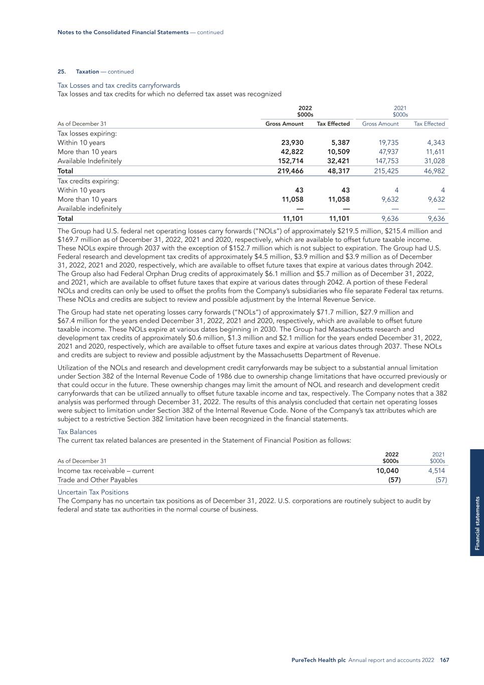 PureTech Health plc Annual report and accounts 2022 167 Fi na nc ia l s ta te m en ts Tax Losses and tax credits carryforwards Tax losses and tax credits for which no deferred tax asset was recognized As of December 31 2022 $000s 2021 $000s Gross Amount Tax Effected Gross Amount Tax Effected Tax losses expiring: Within 10 years 23,930 5,387 19,735 4,343 More than 10 years 42,822 10,509 47,937 11,611 Available Indefinitely 152,714 32,421 147,753 31,028 Total 219,466 48,317 215,425 46,982 Tax credits expiring: Within 10 years 43 43 4 4 More than 10 years 11,058 11,058 9,632 9,632 Available indefinitely — — — — Total 11,101 11,101 9,636 9,636 The Group had U.S. federal net operating losses carry forwards (“NOLs”) of approximately $219.5 million, $215.4 million and $169.7 million as of December 31, 2022, 2021 and 2020, respectively, which are available to offset future taxable income. These NOLs expire through 2037 with the exception of $152.7 million which is not subject to expiration. The Group had U.S. Federal research and development tax credits of approximately $4.5 million, $3.9 million and $3.9 million as of December 31, 2022, 2021 and 2020, respectively, which are available to offset future taxes that expire at various dates through 2042. The Group also had Federal Orphan Drug credits of approximately $6.1 million and $5.7 million as of December 31, 2022, and 2021, which are available to offset future taxes that expire at various dates through 2042. A portion of these Federal NOLs and credits can only be used to offset the profits from the Company’s subsidiaries who file separate Federal tax returns. These NOLs and credits are subject to review and possible adjustment by the Internal Revenue Service. The Group had state net operating losses carry forwards (“NOLs”) of approximately $71.7 million, $27.9 million and $67.4 million for the years ended December 31, 2022, 2021 and 2020, respectively, which are available to offset future taxable income. These NOLs expire at various dates beginning in 2030. The Group had Massachusetts research and development tax credits of approximately $0.6 million, $1.3 million and $2.1 million for the years ended December 31, 2022, 2021 and 2020, respectively, which are available to offset future taxes and expire at various dates through 2037. These NOLs and credits are subject to review and possible adjustment by the Massachusetts Department of Revenue. Utilization of the NOLs and research and development credit carryforwards may be subject to a substantial annual limitation under Section 382 of the Internal Revenue Code of 1986 due to ownership change limitations that have occurred previously or that could occur in the future. These ownership changes may limit the amount of NOL and research and development credit carryforwards that can be utilized annually to offset future taxable income and tax, respectively. The Company notes that a 382 analysis was performed through December 31, 2022. The results of this analysis concluded that certain net operating losses were subject to limitation under Section 382 of the Internal Revenue Code. None of the Company’s tax attributes which are subject to a restrictive Section 382 limitation have been recognized in the financial statements. Tax Balances The current tax related balances are presented in the Statement of Financial Position as follows: As of December 31 2022 $000s 2021 $000s Income tax receivable – current 10,040 4,514 Trade and Other Payables (57) (57) Uncertain Tax Positions The Company has no uncertain tax positions as of December 31, 2022. U.S. corporations are routinely subject to audit by federal and state tax authorities in the normal course of business. Notes to the Consolidated Financial Statements — continued 25. Taxation — continued