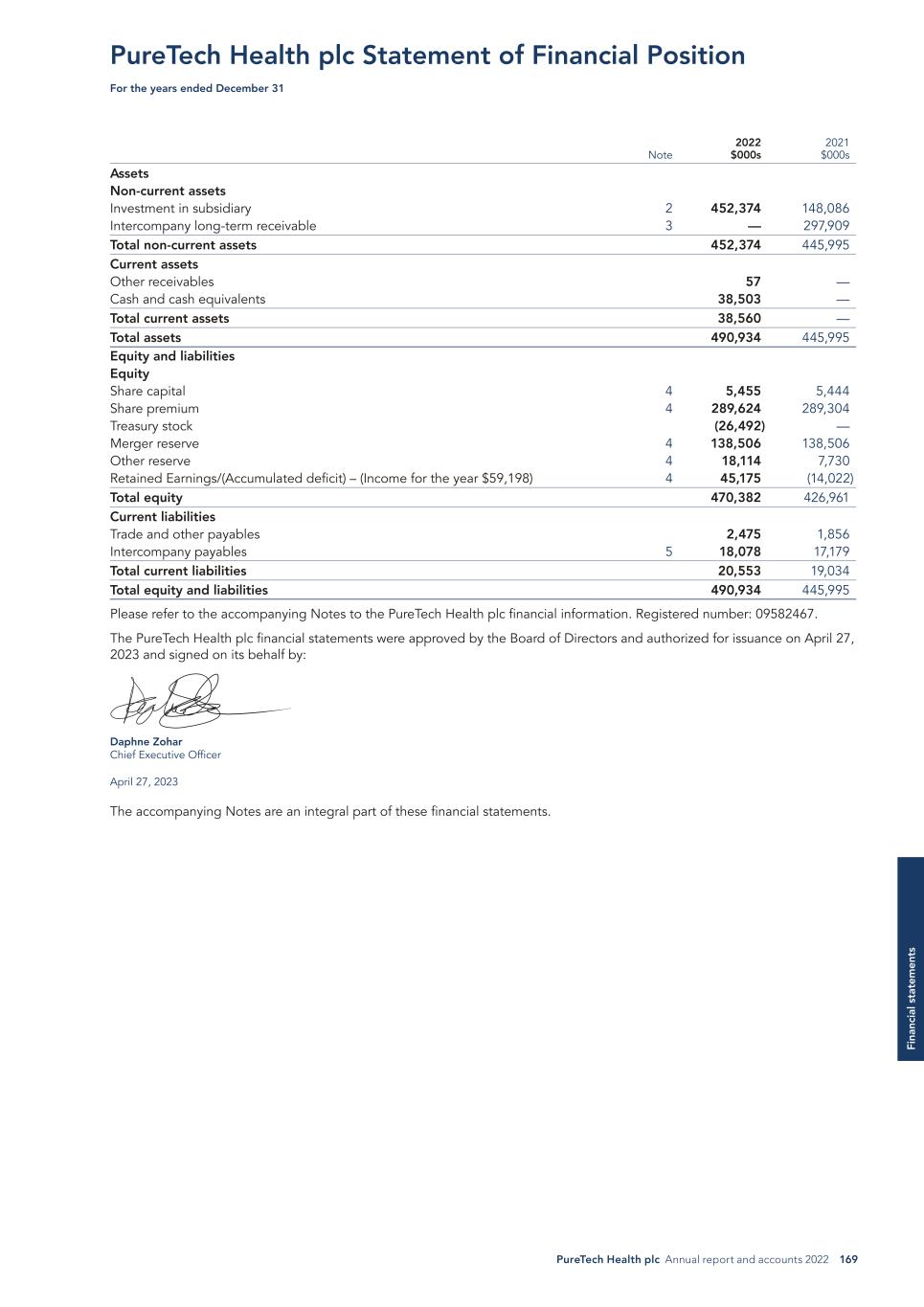 PureTech Health plc Annual report and accounts 2022 169 Fi na nc ia l s ta te m en ts 2022 $000s 2021 $000sNote Assets Non-current assets Investment in subsidiary 2 452,374 148,086 Intercompany long-term receivable 3 — 297,909 Total non-current assets 452,374 445,995 Current assets Other receivables 57 — Cash and cash equivalents 38,503 — Total current assets 38,560 — Total assets 490,934 445,995 Equity and liabilities Equity Share capital 4 5,455 5,444 Share premium 4 289,624 289,304 Treasury stock (26,492) — Merger reserve 4 138,506 138,506 Other reserve 4 18,114 7,730 Retained Earnings/(Accumulated deficit) – (Income for the year $59,198) 4 45,175 (14,022) Total equity 470,382 426,961 Current liabilities Trade and other payables 2,475 1,856 Intercompany payables 5 18,078 17,179 Total current liabilities 20,553 19,034 Total equity and liabilities 490,934 445,995 Please refer to the accompanying Notes to the PureTech Health plc financial information. Registered number: 09582467. The PureTech Health plc financial statements were approved by the Board of Directors and authorized for issuance on April 27, 2023 and signed on its behalf by: Daphne Zohar Chief Executive Officer April 27, 2023 The accompanying Notes are an integral part of these financial statements. PureTech Health plc Statement of Financial Position For the years ended December 31