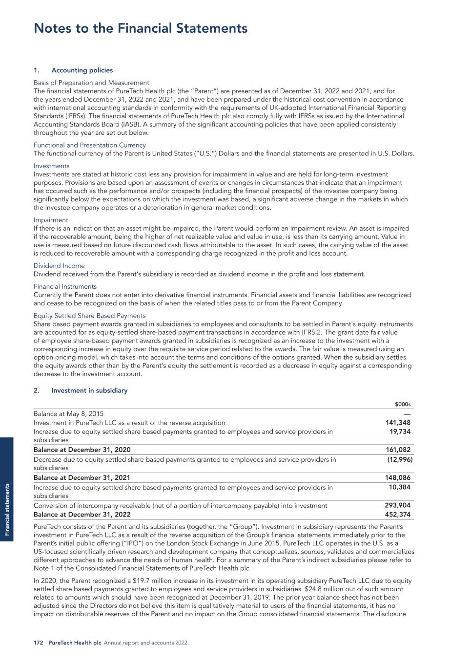 172 PureTech Health plc Annual report and accounts 2022 Fi na nc ia l s ta te m en ts 1. Accounting policies Basis of Preparation and Measurement The financial statements of PureTech Health plc (the “Parent”) are presented as of December 31, 2022 and 2021, and for the years ended December 31, 2022 and 2021, and have been prepared under the historical cost convention in accordance with international accounting standards in conformity with the requirements of UK-adopted International Financial Reporting Standards (IFRSs). The financial statements of PureTech Health plc also comply fully with IFRSs as issued by the International Accounting Standards Board (IASB). A summary of the significant accounting policies that have been applied consistently throughout the year are set out below. Functional and Presentation Currency The functional currency of the Parent is United States (“U.S.”) Dollars and the financial statements are presented in U.S. Dollars. Investments Investments are stated at historic cost less any provision for impairment in value and are held for long-term investment purposes. Provisions are based upon an assessment of events or changes in circumstances that indicate that an impairment has occurred such as the performance and/or prospects (including the financial prospects) of the investee company being significantly below the expectations on which the investment was based, a significant adverse change in the markets in which the investee company operates or a deterioration in general market conditions. Impairment If there is an indication that an asset might be impaired, the Parent would perform an impairment review. An asset is impaired if the recoverable amount, being the higher of net realizable value and value in use, is less than its carrying amount. Value in use is measured based on future discounted cash flows attributable to the asset. In such cases, the carrying value of the asset is reduced to recoverable amount with a corresponding charge recognized in the profit and loss account. Dividend Income Dividend received from the Parent's subsidiary is recorded as dividend income in the profit and loss statement. Financial Instruments Currently the Parent does not enter into derivative financial instruments. Financial assets and financial liabilities are recognized and cease to be recognized on the basis of when the related titles pass to or from the Parent Company. Equity Settled Share Based Payments Share based payment awards granted in subsidiaries to employees and consultants to be settled in Parent's equity instruments are accounted for as equity-settled share-based payment transactions in accordance with IFRS 2. The grant date fair value of employee share-based payment awards granted in subsidiaries is recognized as an increase to the investment with a corresponding increase in equity over the requisite service period related to the awards. The fair value is measured using an option pricing model, which takes into account the terms and conditions of the options granted. When the subsidiary settles the equity awards other than by the Parent's equity the settlement is recorded as a decrease in equity against a corresponding decrease to the investment account. 2. Investment in subsidiary $000s Balance at May 8, 2015 — Investment in PureTech LLC as a result of the reverse acquisition 141,348 Increase due to equity settled share based payments granted to employees and service providers in subsidiaries 19,734 Balance at December 31, 2020 161,082 Decrease due to equity settled share based payments granted to employees and service providers in subsidiaries (12,996) Balance at December 31, 2021 148,086 Increase due to equity settled share based payments granted to employees and service providers in subsidiaries 10,384 Conversion of intercompany receivable (net of a portion of intercompany payable) into investment 293,904 Balance at December 31, 2022 452,374 PureTech consists of the Parent and its subsidiaries (together, the “Group”). Investment in subsidiary represents the Parent’s investment in PureTech LLC as a result of the reverse acquisition of the Group’s financial statements immediately prior to the Parent’s initial public offering (“IPO”) on the London Stock Exchange in June 2015. PureTech LLC operates in the U.S. as a US-focused scientifically driven research and development company that conceptualizes, sources, validates and commercializes different approaches to advance the needs of human health. For a summary of the Parent’s indirect subsidiaries please refer to Note 1 of the Consolidated Financial Statements of PureTech Health plc. In 2020, the Parent recognized a $19.7 million increase in its investment in its operating subsidiary PureTech LLC due to equity settled share based payments granted to employees and service providers in subsidiaries. $24.8 million out of such amount related to amounts which should have been recognized at December 31, 2019. The prior year balance sheet has not been adjusted since the Directors do not believe this item is qualitatively material to users of the financial statements, it has no impact on distributable reserves of the Parent and no impact on the Group consolidated financial statements. The disclosure Notes to the Financial Statements