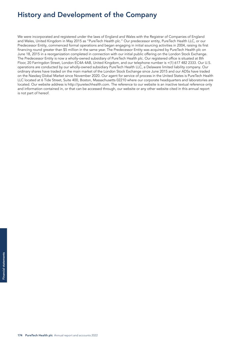 174 PureTech Health plc Annual report and accounts 2022 Fi na nc ia l s ta te m en ts We were incorporated and registered under the laws of England and Wales with the Registrar of Companies of England and Wales, United Kingdom in May 2015 as “PureTech Health plc.” Our predecessor entity, PureTech Health LLC, or our Predecessor Entity, commenced formal operations and began engaging in initial sourcing activities in 2004, raising its first financing round greater than $5 million in the same year. The Predecessor Entity was acquired by PureTech Health plc on June 18, 2015 in a reorganization completed in connection with our initial public offering on the London Stock Exchange. The Predecessor Entity is now a wholly-owned subsidiary of PureTech Health plc. Our registered office is situated at 8th Floor, 20 Farringdon Street, London EC4A 4AB, United Kingdom, and our telephone number is +(1) 617 482 2333. Our U.S. operations are conducted by our wholly-owned subsidiary PureTech Health LLC, a Delaware limited liability company. Our ordinary shares have traded on the main market of the London Stock Exchange since June 2015 and our ADSs have traded on the Nasdaq Global Market since November 2020. Our agent for service of process in the United States is PureTech Health LLC located at 6 Tide Street, Suite 400, Boston, Massachusetts 02210 where our corporate headquarters and laboratories are located. Our website address is http://puretechhealth.com. The reference to our website is an inactive textual reference only and information contained in, or that can be accessed through, our website or any other website cited in this annual report is not part of hereof. History and Development of the Company