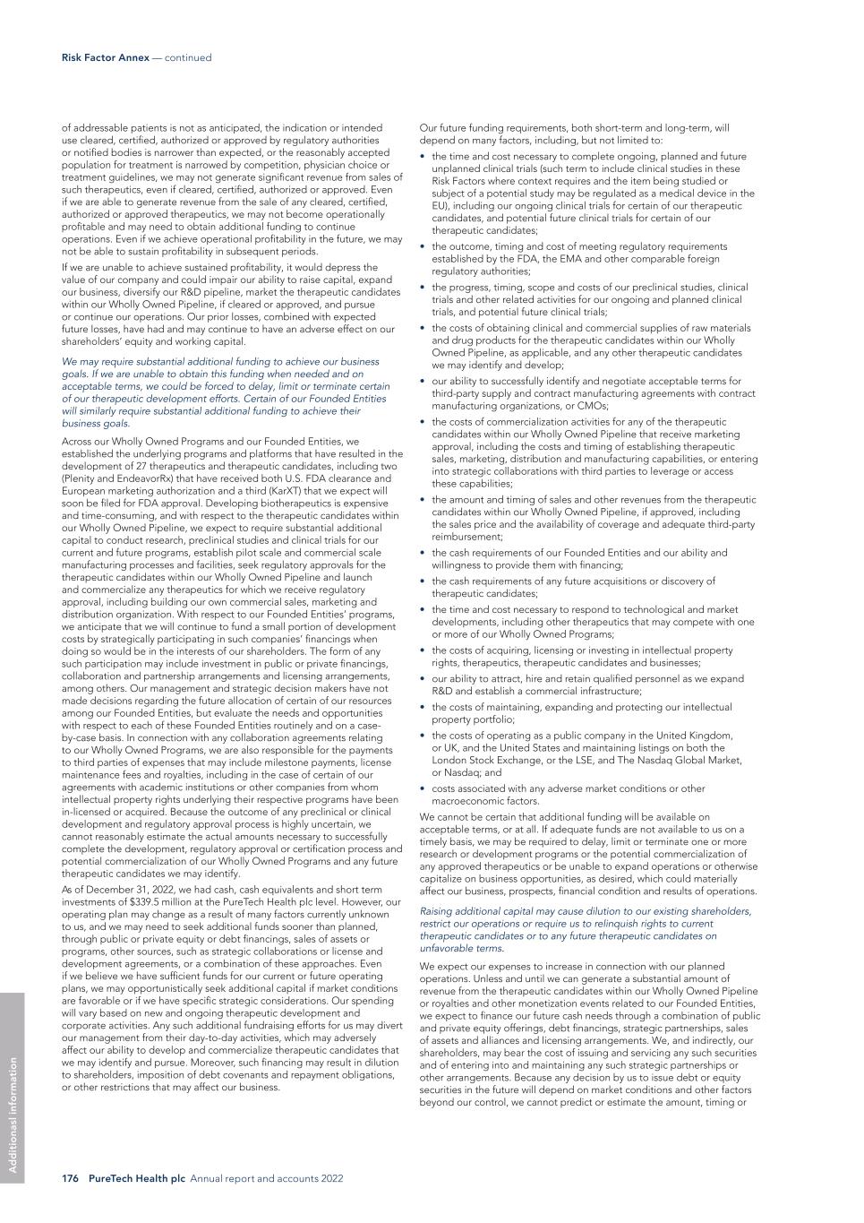 176 PureTech Health plc Annual report and accounts 2022 Risk Factor Annex — continued A d d it io na sl in fo rm at io n Our future funding requirements, both short-term and long-term, will depend on many factors, including, but not limited to: • the time and cost necessary to complete ongoing, planned and future unplanned clinical trials (such term to include clinical studies in these Risk Factors where context requires and the item being studied or subject of a potential study may be regulated as a medical device in the EU), including our ongoing clinical trials for certain of our therapeutic candidates, and potential future clinical trials for certain of our therapeutic candidates; • the outcome, timing and cost of meeting regulatory requirements established by the FDA, the EMA and other comparable foreign regulatory authorities; • the progress, timing, scope and costs of our preclinical studies, clinical trials and other related activities for our ongoing and planned clinical trials, and potential future clinical trials; • the costs of obtaining clinical and commercial supplies of raw materials and drug products for the therapeutic candidates within our Wholly Owned Pipeline, as applicable, and any other therapeutic candidates we may identify and develop; • our ability to successfully identify and negotiate acceptable terms for third-party supply and contract manufacturing agreements with contract manufacturing organizations, or CMOs; • the costs of commercialization activities for any of the therapeutic candidates within our Wholly Owned Pipeline that receive marketing approval, including the costs and timing of establishing therapeutic sales, marketing, distribution and manufacturing capabilities, or entering into strategic collaborations with third parties to leverage or access these capabilities; • the amount and timing of sales and other revenues from the therapeutic candidates within our Wholly Owned Pipeline, if approved, including the sales price and the availability of coverage and adequate third-party reimbursement; • the cash requirements of our Founded Entities and our ability and willingness to provide them with financing; • the cash requirements of any future acquisitions or discovery of therapeutic candidates; • the time and cost necessary to respond to technological and market developments, including other therapeutics that may compete with one or more of our Wholly Owned Programs; • the costs of acquiring, licensing or investing in intellectual property rights, therapeutics, therapeutic candidates and businesses; • our ability to attract, hire and retain qualified personnel as we expand R&D and establish a commercial infrastructure; • the costs of maintaining, expanding and protecting our intellectual property portfolio; • the costs of operating as a public company in the United Kingdom, or UK, and the United States and maintaining listings on both the London Stock Exchange, or the LSE, and The Nasdaq Global Market, or Nasdaq; and • costs associated with any adverse market conditions or other macroeconomic factors. We cannot be certain that additional funding will be available on acceptable terms, or at all. If adequate funds are not available to us on a timely basis, we may be required to delay, limit or terminate one or more research or development programs or the potential commercialization of any approved therapeutics or be unable to expand operations or otherwise capitalize on business opportunities, as desired, which could materially affect our business, prospects, financial condition and results of operations. Raising additional capital may cause dilution to our existing shareholders, restrict our operations or require us to relinquish rights to current therapeutic candidates or to any future therapeutic candidates on unfavorable terms. We expect our expenses to increase in connection with our planned operations. Unless and until we can generate a substantial amount of revenue from the therapeutic candidates within our Wholly Owned Pipeline or royalties and other monetization events related to our Founded Entities, we expect to finance our future cash needs through a combination of public and private equity offerings, debt financings, strategic partnerships, sales of assets and alliances and licensing arrangements. We, and indirectly, our shareholders, may bear the cost of issuing and servicing any such securities and of entering into and maintaining any such strategic partnerships or other arrangements. Because any decision by us to issue debt or equity securities in the future will depend on market conditions and other factors beyond our control, we cannot predict or estimate the amount, timing or of addressable patients is not as anticipated, the indication or intended use cleared, certified, authorized or approved by regulatory authorities or notified bodies is narrower than expected, or the reasonably accepted population for treatment is narrowed by competition, physician choice or treatment guidelines, we may not generate significant revenue from sales of such therapeutics, even if cleared, certified, authorized or approved. Even if we are able to generate revenue from the sale of any cleared, certified, authorized or approved therapeutics, we may not become operationally profitable and may need to obtain additional funding to continue operations. Even if we achieve operational profitability in the future, we may not be able to sustain profitability in subsequent periods. If we are unable to achieve sustained profitability, it would depress the value of our company and could impair our ability to raise capital, expand our business, diversify our R&D pipeline, market the therapeutic candidates within our Wholly Owned Pipeline, if cleared or approved, and pursue or continue our operations. Our prior losses, combined with expected future losses, have had and may continue to have an adverse effect on our shareholders’ equity
