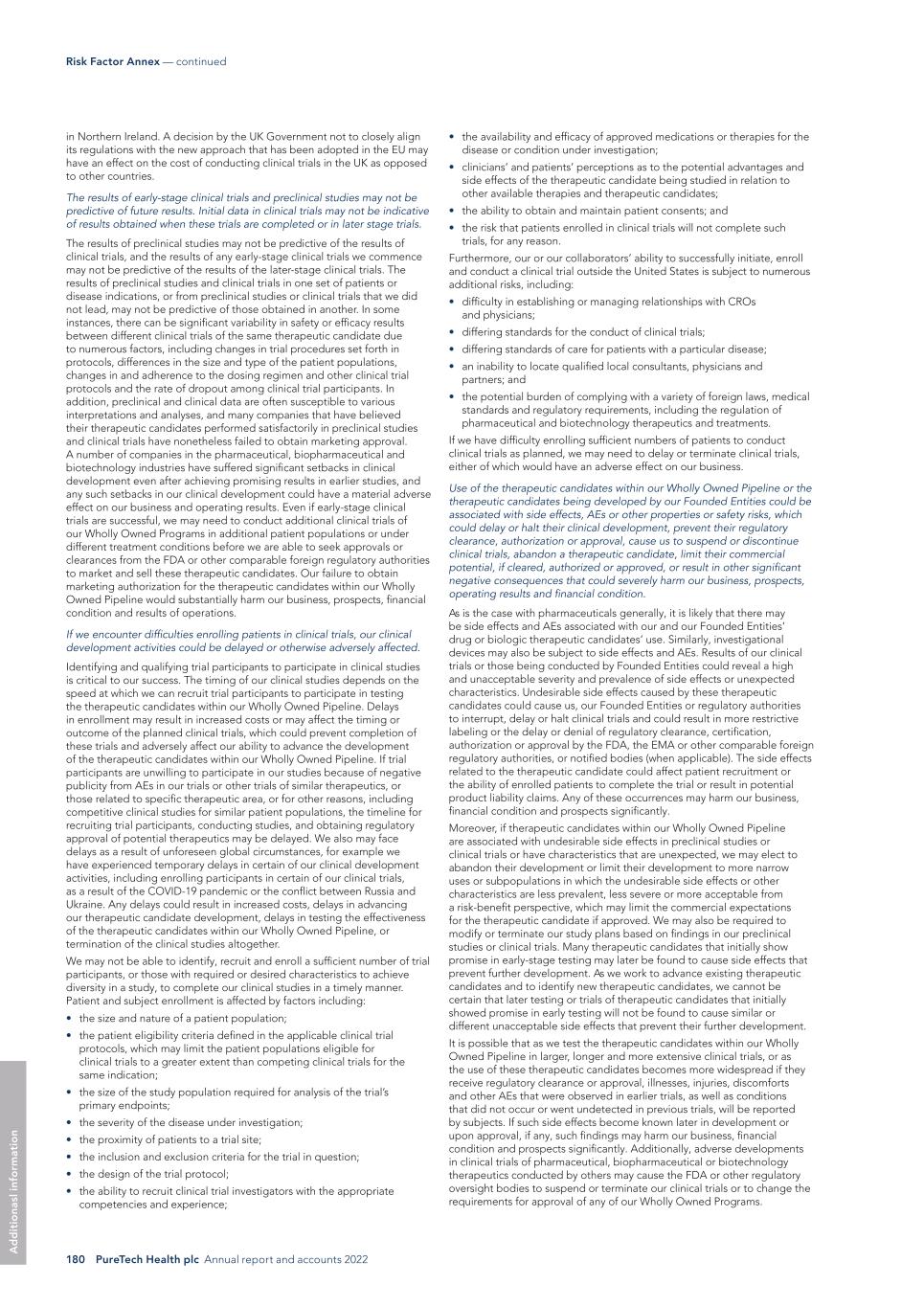 PureTech Health plc Annual report and accounts 2022 179 Risk Factor Annex — continued A d d it io na l i nf o rm at io n inspection of the clinical trial operations or trial site by the FDA or other comparable foreign regulatory authorities resulting in the imposition of a clinical hold, unforeseen safety issues or adverse side effects, failure to demonstrate a benefit from using a therapeutic candidate, changes in governmental regulations or administrative actions or lack of adequate funding to continue the clinical trial. Moreover, principal investigators for our clinical trials may serve as scientific advisors or consultants to us from time to time and receive compensation in connection with such services. Under certain circumstances, we may be required to report some of these relationships to the FDA or comparable foreign regulatory authorities. The FDA or comparable foreign regulatory authority may conclude that a financial relationship between us and a principal investigator has created a conflict of interest or otherwise affected interpretation of the study. The FDA or comparable foreign regulatory authority may therefore question the integrity of the data generated at the applicable clinical trial site and the utility of the clinical trial itself may be jeopardized. This could result in a delay in approval, or rejection, of our marketing applications by the FDA or comparable foreign regulatory authority, as the case may be, and may ultimately lead to the denial of marketing approval of one or more of our Wholly Owned Programs or our Founded Entities’ therapeutic candidates. Delays in the initiation, conduct or completion of any clinical trial of the therapeutic candidates within our Wholly Owned Pipeline will increase our costs, slow down the therapeutic candidate development and approval process and delay or potentially jeopardize our ability to commence therapeutic sales and generate revenue. In addition, many of the factors that cause, or lead to, a delay in the commencement or completion of clinical trials may also ultimately lead to the denial of regulatory approval of the therapeutic candidates within our Wholly Owned Pipeline or our Founded Entities’ therapeutic candidates. In the event we identify any additional therapeutic candidates to pursue, we cannot be sure that submission of an IDE, IND, CTA, or equivalent application, as applicable, will result in the FDA, the EMA or comparable foreign regulatory authority allowing clinical trials to begin in a timely manner, if at all. Any of these events could have a material adverse effect on our business, prospects, financial condition and results of operations. In addition, the FDA’s and other regulatory authorities’ policies with respect to clinical trials may change and additional government regulations may be enacted. For instance, the regulatory landscape related to clinical trials in the EU recently evolved. The EU Clinical Trials Regulation, or CTR, which was adopted in April 2014 and repeals the EU Clinical Trials Directive, became applicable on January 31, 2022. While the Clinical Trials Directive required a separate clinical trial application, or CTA, to be submitted in each member state in which the clinical trial takes place, to both the competent national health authority and an independent ethics committee, the CTR introduces a centralized process and only requires the submission of a single application for multi-center trials. The CTR allows sponsors to make a single submission to both the competent authority and an ethics committee in each member state, leading to a single decision per member state. The assessment procedure of the CTA has been harmonized as well, including a joint assessment by all member states concerned, and a separate assessment by each member state with respect to specific requirements related to its own territory, including ethics rules. Each member state’s decision is communicated to the sponsor via the centralized EU portal. Once the CTA is approved, clinical study development may proceed. The CTR foresees a three-year transition period. The extent to which ongoing and new clinical trials will be governed by the CTR varies. Clinical trials for which an application was submitted (i) prior to January 31, 2022 under the EU Clinical Trials Directive, or (ii) between January 31, 2022 and January 31, 2023 and for which the sponsor has opted for the application of the EU Clinical Trials Directive remain governed by said Directive until January 31, 2025. After this date, all clinical trials (including those which are ongoing) will become subject to the provisions of the CTR. Compliance with the CTR requirements by us and our third-party service providers, such as CROs, may impact our developments plans. It is currently unclear to what extent the UK will seek to align its regulations with the EU. The UK regulatory framework in relation to clinical trials is derived from existing EU legislation (as implemented into UK law, through secondary legislation). On January 17, 2022, the UK Medicines and Healthcare products Regulatory Agency, or MHRA, launched an eight-week consultation on reframing the UK legislation for clinical trials, with the aim to streamline clinical trials approvals, enable innovation, enhance clinical trials transparency, enable greater risk proportionality, and promote patient and public involvement in clinical trials. The resulting new legislation will determine how aligned the UK clinical trials regime is compared to the (EU) CTR. Under the terms of the Protocol on Ireland/Northern Ireland, provisions of the (EU) CTR which relate to the manufacture and import of investigational medicinal products and auxiliary medicinal products apply • delays in obtaining required Institutional Review Board, or IRB, or other reviewing bodies approval or positive opinion at each clinical trial site; • imposition of a temporary or permanent clinical hold by regulatory agencies fo