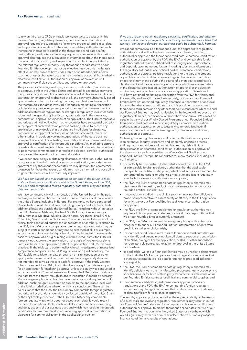 PureTech Health plc Annual report and accounts 2022 181 Risk Factor Annex — continued A d d it io na l i nf o rm at io n Clinical testing is expensive and can take many years to complete, and its outcome is inherently uncertain. Failure can occur at any time during the clinical development process. Most therapeutic candidates that begin clinical trials are never approved by regulatory authorities or notified bodies for commercialization. We may be unable to design and execute a clinical trial to support marketing authorization or certification. We cannot be certain that our clinical trials will be successful. Additionally, any safety concerns observed in any one of our clinical trials in our targeted indications could limit the prospects for regulatory clearances, certification, authorization or approval of our therapeutic candidates in those and other indications, which could have a material adverse effect on our business, financial condition and results of operations. In addition, even if such clinical trials are successfully completed, we cannot guarantee that the FDA, the EMA or comparable foreign regulatory authorities or notified bodies (when applicable) will interpret the results as we do, and more trials could be required before we submit our therapeutic candidates for clearance, certification or approval. For example, the definition of clinical meaningfulness for outcome measures in lymphedema has not been firmly established by the FDA, introducing risk in evaluating and demonstrating the efficacy required to obtain FDA approval of LYT-100. Even if we believe that our and our Founded Entities’ clinical trials and preclinical studies demonstrate the safety and efficacy of our and their therapeutic candidates, only the FDA and other comparable regulatory agencies may ultimately make such determination. No regulatory agency has made any such determination that any of our Wholly Owned Programs or those of our Founded Entities are safe or effective for use for any indication. Additionally, we may utilize an “open-label” trial design for some of our future clinical trials. An open-label trial is one where both the patient and investigator know whether the patient is receiving the test article or either an existing approved drug or placebo. Open-label trials are subject to various limitations that may exaggerate any therapeutic effect as patients in open-label studies are aware that they are receiving treatment. Open- label trials may be subject to a “patient bias” where patients perceive their symptoms to have improved merely due to their awareness of receiving an experimental treatment. Patients selected for early clinical studies often include the most severe sufferers and their symptoms may have been bound to improve notwithstanding the new treatment. In addition, open-label trials may be subject to an “investigator bias” where those assessing and reviewing the physiological outcomes of the clinical trials are aware of which patients have received treatment and may interpret the information of the treated group more favorably given this knowledge. The opportunity for bias in clinical trials as a result of open-label design may not be adequately handled and may cause any of our trials that utilize such design to fail or to be considered inadequate and additional trials may be necessary to support future marketing applications. Moreover, results acceptable to support approval in one jurisdiction may be deemed inadequate by another regulatory authority to support regulatory approval in that other jurisdiction. To the extent that the results of the trials are not satisfactory to the FDA, the EMA or comparable foreign regulatory authorities for support of a marketing application, we may be required to expend significant resources, which may not be available to us, to conduct additional trials in support of potential approval of our Wholly Owned Programs. Even if regulatory approval is secured for a therapeutic candidate, the terms of such approval may limit the scope and use of the specific therapeutic candidate, which may also limit its commercial potential. Even if we complete the necessary preclinical studies and clinical trials, the marketing approval and certification process is expensive, time- consuming and uncertain and may prevent us from obtaining clearance, certification, authorization or approvals for the potential commercialization of therapeutic candidates. Any therapeutic candidate we may develop and the activities associated with their development and potential commercialization, including their design, testing, manufacture, safety, efficacy, recordkeeping, labeling, storage, approval, certification, advertising, promotion, sale and distribution, are subject to comprehensive regulation by the FDA and other comparable foreign regulatory authorities. Failure to obtain marketing authorization or certification for a therapeutic candidate will prevent us from commercializing the therapeutic candidate in a given jurisdiction. For example, although Gelesis and Akili have received marketing authorization for Plenity and EndeavorRx, respectively, from the FDA, and are CE marked in the EU, we and our Founded Entities have not received clearance, certification, authorization or approval to market any of our or their other therapeutic candidates from regulatory authorities in any jurisdiction and it is possible that none of the other therapeutic candidates we and our Founded Entities may seek to develop in the future will ever obtain regulatory clearance, authorization or approval. We have no experience in filing and supporting the applications necessary to gain marketing clearance, certification, authorization or approval and expect In addition to side effects caused by the therapeutic candidate, the administration process or related procedures also can cause adverse side effects. If any such AEs occur, our clinical trials could be suspended or terminated. If we are