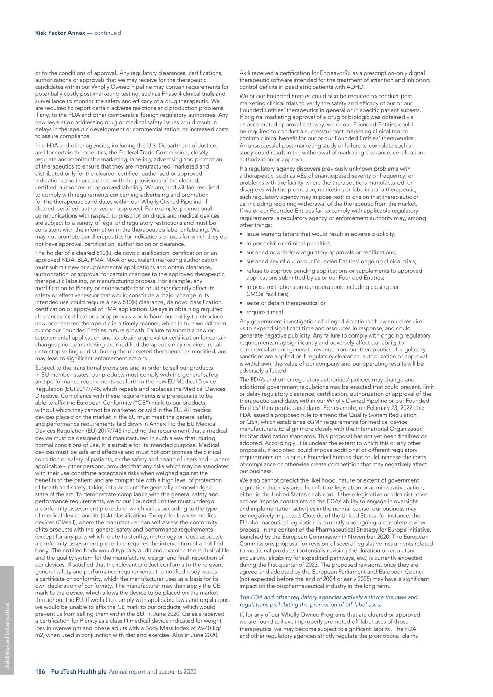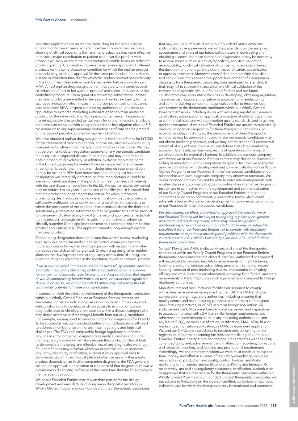 PureTech Health plc Annual report and accounts 2022 185 Risk Factor Annex — continued A d d it io na l i nf o rm at io n that may require such tests. If we or our Founded Entities enter into such collaborative agreements, we will be dependent on the sustained cooperation and effort of our future collaborators in developing and obtaining approval for these companion diagnostics. It may be necessary to resolve issues such as selectivity/specificity, analytical validation, reproducibility, or clinical validation of companion diagnostics during the development and regulatory clearance, certification, authorization or approval processes. Moreover, even if data from preclinical studies and early clinical trials appear to support development of a companion diagnostic for a therapeutic candidate, data generated in later clinical trials may fail to support the analytical and clinical validation of the companion diagnostic. We, our Founded Entities and our future collaborators may encounter difficulties in developing, obtaining regulatory clearance, certification, authorization or approval for, manufacturing and commercializing companion diagnostics similar to those we face with respect to the therapeutic candidates within our Wholly Owned Pipeline themselves, including issues with achieving regulatory clearance, certification, authorization or approval, production of sufficient quantities at commercial scale and with appropriate quality standards, and in gaining market acceptance. If we or our Founded Entities are unable to successfully develop companion diagnostics for these therapeutic candidates, or experience delays in doing so, the development of these therapeutic candidates may be adversely affected, these therapeutic candidates may not obtain marketing approval, and we may not realize the full commercial potential of any of these therapeutic candidates that obtain marketing approval. As a result, our business, results of operations and financial condition could be materially harmed. In addition, a diagnostic company with whom we or our Founded Entities contract may decide to discontinue selling or manufacturing the companion diagnostic test that we anticipate using in connection with development and commercialization of our Wholly Owned Programs or our Founded Entities’ therapeutic candidates or our relationship with such diagnostic company may otherwise terminate. We or our Founded Entities may not be able to enter into arrangements with another diagnostic company to obtain supplies of an alternative diagnostic test for use in connection with the development and commercialization of our Wholly Owned Programs or our Founded Entities’ therapeutic candidates or do so on commercially reasonable terms, which could adversely affect and/or delay the development or commercialization of our or our Founded Entities’ therapeutic candidates. For any cleared, certified, authorized or approved therapeutic, we or our Founded Entities will be subject to ongoing regulatory obligations and continued regulatory review, which may result in significant additional expense and we or our Founded Entities may be subject to penalties if we or our Founded Entities fail to comply with regulatory requirements or experience unanticipated problems with the therapeutic candidates within our Wholly Owned Pipeline or our Founded Entities’ therapeutic candidates. Gelesis’ Plenity and Akili’s EndeavorRx are, and any of the therapeutic candidates within our Wholly Owned Programs or our Founded Entities’ therapeutic candidates that are cleared, certified, authorized or approved will be, subject to ongoing regulatory requirements for manufacturing, labeling, packaging, storage, advertising, promotion, sampling, record- keeping, conduct of post-marketing studies, and submission of safety, efficacy and other post-market information, including both federal and state requirements in the United States and requirements of comparable foreign regulatory authorities. Manufacturers and manufacturers’ facilities are required to comply with extensive requirements imposed by the FDA, the EMA and other comparable foreign regulatory authorities, including ensuring that quality control and manufacturing procedures conform to current good manufacturing practices, or cGMP, or similar foreign regulations. As such, we and our CMOs are subject to continual review and inspections to assess compliance with cGMP, or similar foreign requirements and adherence to commitments made in any marketing authorization, and any future 510(k), de novo classification, certification, PMA, NDA, BLA or marketing authorization application, or MAA, or equivalent application. We and our CMOs are also subject to requirements pertaining to the registration of our manufacturing facilities and the listing of our and our Founded Entities’ therapeutics and therapeutic candidates with the FDA; continued complaint, adverse event and malfunction reporting; corrections and removals reporting; and labeling and promotional requirements. Accordingly, we and others with whom we work must continue to expend time, money, and effort in all areas of regulatory compliance, including manufacturing, production and quality control. Gelesis’ and Akili’s marketing authorizations and certifications for Plenity and EndeavorRx, respectively, are and any regulatory clearances, certification, authorization or approvals that we may receive for the therapeutic candidates within our Wholly Owned Pipeline or our Founded Entities’ therapeutic candidates will be, subject to limitations on the cleared, certified, authorized or approved indicated uses for which the therapeutic may be marketed and promoted any other applications to market the same drug for the same disease or condition for seven years, except in certain circumstances, such as a showing of clinical superiority (i.e., another product is safer, more effective or makes a major contribution to patient care) over the pr