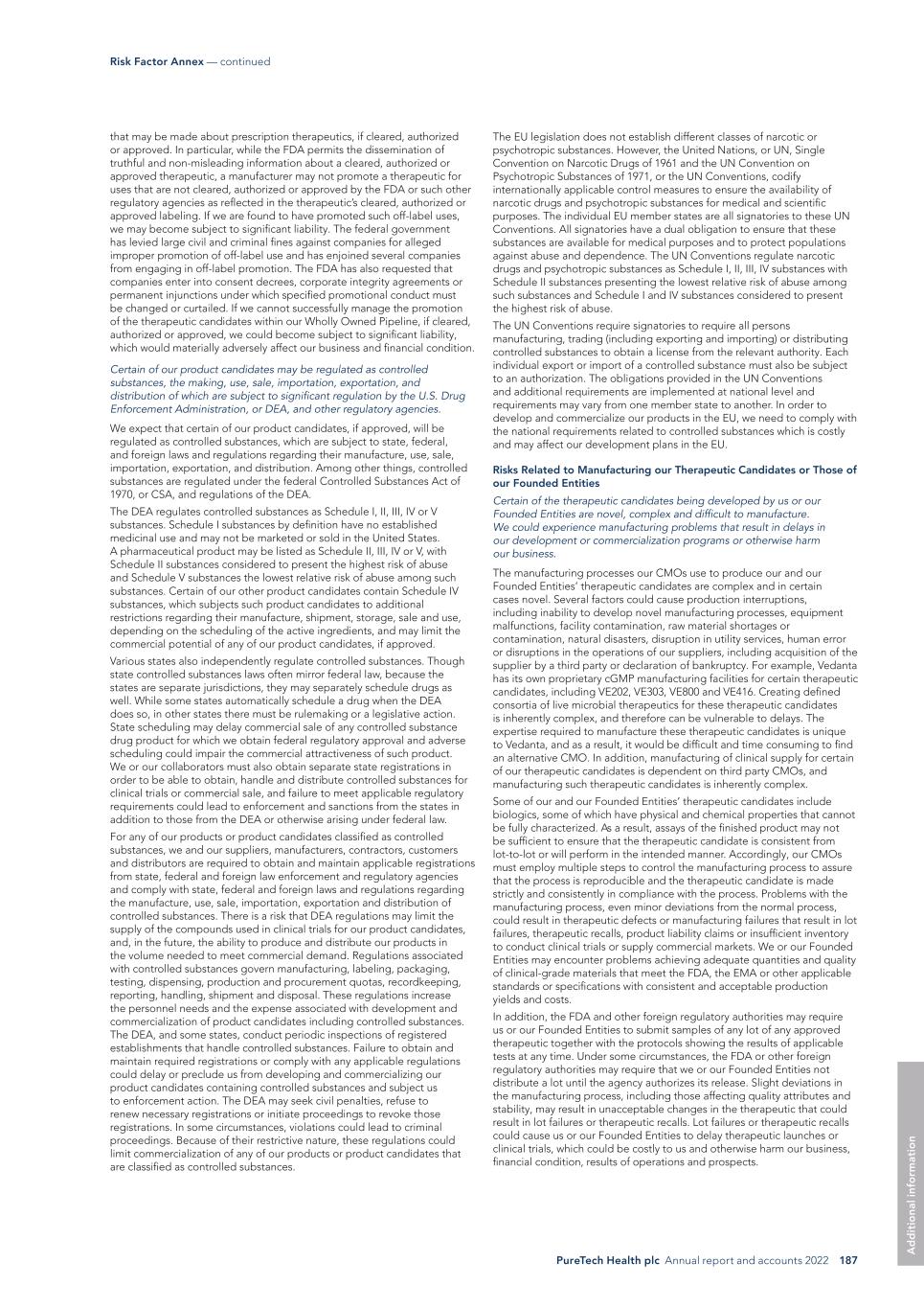 PureTech Health plc Annual report and accounts 2022 187 Risk Factor Annex — continued A d d it io na l i nf o rm at io n The EU legislation does not establish different classes of narcotic or psychotropic substances. However, the United Nations, or UN, Single Convention on Narcotic Drugs of 1961 and the UN Convention on Psychotropic Substances of 1971, or the UN Conventions, codify internationally applicable control measures to ensure the availability of narcotic drugs and psychotropic substances for medical and scientific purposes. The individual EU member states are all signatories to these UN Conventions. All signatories have a dual obligation to ensure that these substances are available for medical purposes and to protect populations against abuse and dependence. The UN Conventions regulate narcotic drugs and psychotropic substances as Schedule I, II, III, IV substances with Schedule II substances presenting the lowest relative risk of abuse among such substances and Schedule I and IV substances considered to present the highest risk of abuse. The UN Conventions require signatories to require all persons manufacturing, trading (including exporting and importing) or distributing controlled substances to obtain a license from the relevant authority. Each individual export or import of a controlled substance must also be subject to an authorization. The obligations provided in the UN Conventions and additional requirements are implemented at national level and requirements may vary from one member state to another. In order to develop and commercialize our products in the EU, we need to comply with the national requirements related to controlled substances which is costly and may affect our development plans in the EU. Risks Related to Manufacturing our Therapeutic Candidates or Those of our Founded Entities Certain of the therapeutic candidates being developed by us or our Founded Entities are novel, complex and difficult to manufacture. We could experience manufacturing problems that result in delays in our development or commercialization programs or otherwise harm our business. The manufacturing processes our CMOs use to produce our and our Founded Entities’ therapeutic candidates are complex and in certain cases novel. Several factors could cause production interruptions, including inability to develop novel manufacturing processes, equipment malfunctions, facility contamination, raw material shortages or contamination, natural disasters, disruption in utility services, human error or disruptions in the operations of our suppliers, including acquisition of the supplier by a third party or declaration of bankruptcy. For example, Vedanta has its own proprietary cGMP manufacturing facilities for certain therapeutic candidates, including VE202, VE303, VE800 and VE416. Creating defined consortia of live microbial therapeutics for these therapeutic candidates is inherently complex, and therefore can be vulnerable to delays. The expertise required to manufacture these therapeutic candidates is unique to Vedanta, and as a result, it would be difficult and time consuming to find an alternative CMO. In addition, manufacturing of clinical supply for certain of our therapeutic candidates is dependent on third party CMOs, and manufacturing such therapeutic candidates is inherently complex. Some of our and our Founded Entities’ therapeutic candidates include biologics, some of which have physical and chemical properties that cannot be fully characterized. As a result, assays of the finished product may not be sufficient to ensure that the therapeutic candidate is consistent from lot-to-lot or will perform in the intended manner. Accordingly, our CMOs must employ multiple steps to control the manufacturing process to assure that the process is reproducible and the therapeutic candidate is made strictly and consistently in compliance with the process. Problems with the manufacturing process, even minor deviations from the normal process, could result in therapeutic defects or manufacturing failures that result in lot failures, therapeutic recalls, product liability claims or insufficient inventory to conduct clinical trials or supply commercial markets. We or our Founded Entities may encounter problems achieving adequate quantities and quality of clinical-grade materials that meet the FDA, the EMA or other applicable standards or specifications with consistent and acceptable production yields and costs. In addition, the FDA and other foreign regulatory authorities may require us or our Founded Entities to submit samples of any lot of any approved therapeutic together with the protocols showing the results of applicable tests at any time. Under some circumstances, the FDA or other foreign regulatory authorities may require that we or our Founded Entities not distribute a lot until the agency authorizes its release. Slight deviations in the manufacturing process, including those affecting quality attributes and stability, may result in unacceptable changes in the therapeutic that could result in lot failures or therapeutic recalls. Lot failures or therapeutic recalls could cause us or our Founded Entities to delay therapeutic launches or clinical trials, which could be costly to us and otherwise harm our business, financial condition, results of operations and prospects. that may be made about prescription therapeutics, if cleared, authorized or approved. In particular, while the FDA permits the dissemination of truthful and non-misleading information about a cleared, authorized or approved therapeutic, a manufacturer may not promote a therapeutic for uses that are not cleared, authorized or approved by the FDA or such other regulatory agencies as reflected in the therapeutic’s cleared, authorized or approved labeling. If we are found to have promoted such off-label uses, we may become subject to significant liability. The federal government has levied large civil and criminal fines against