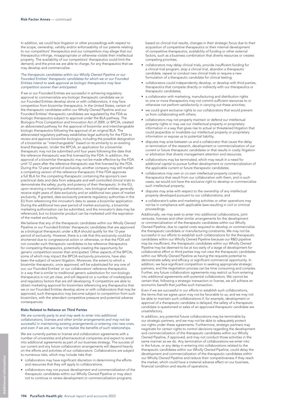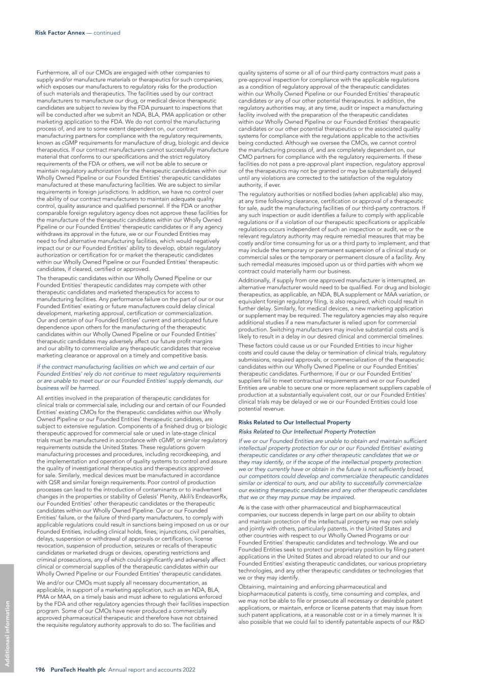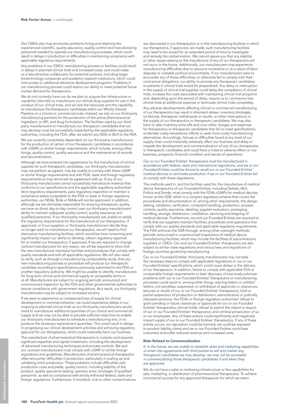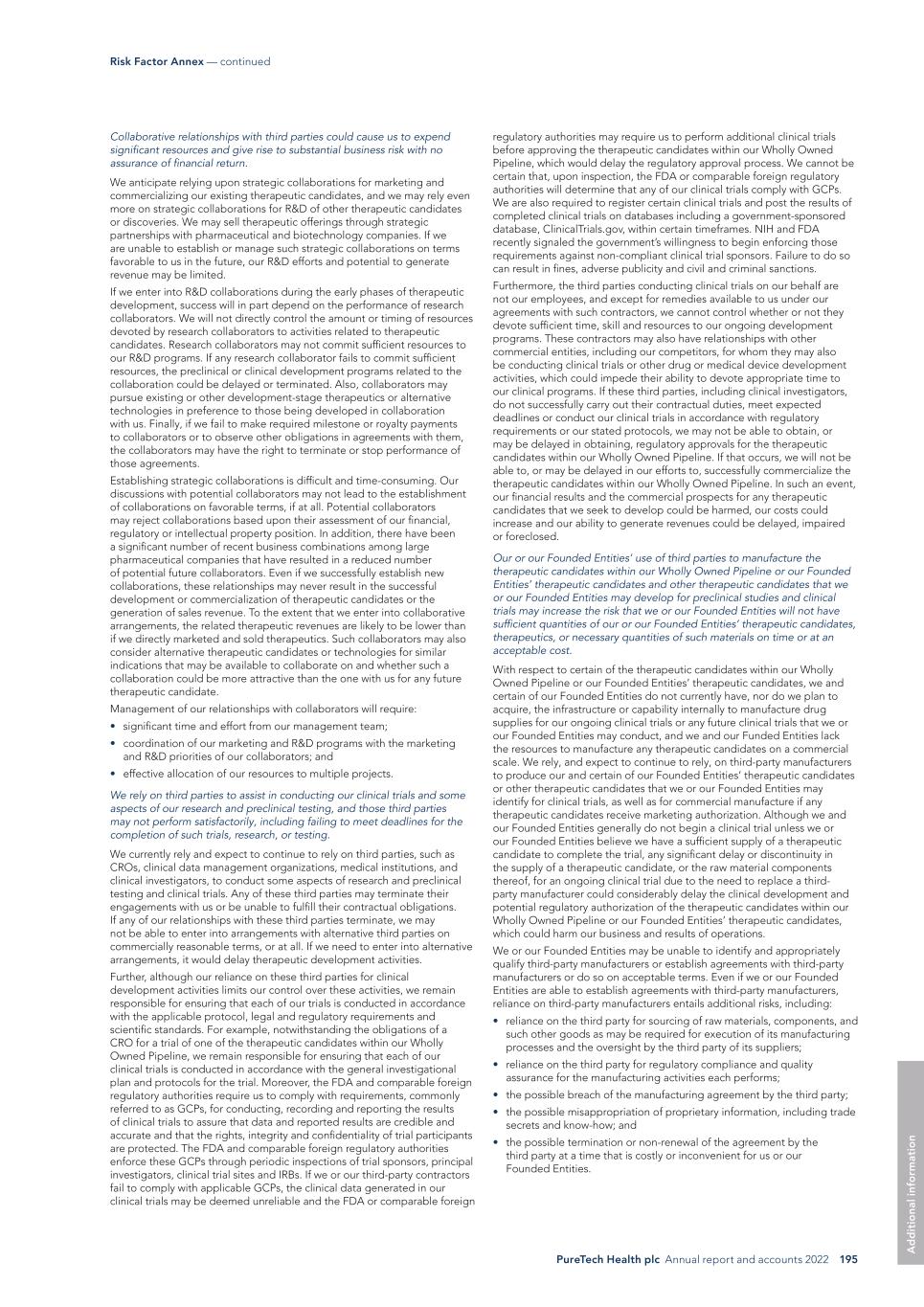 PureTech Health plc Annual report and accounts 2022 195 Risk Factor Annex — continued A d d it io na l i nf o rm at io n regulatory authorities may require us to perform additional clinical trials before approving the therapeutic candidates within our Wholly Owned Pipeline, which would delay the regulatory approval process. We cannot be certain that, upon inspection, the FDA or comparable foreign regulatory authorities will determine that any of our clinical trials comply with GCPs. We are also required to register certain clinical trials and post the results of completed clinical trials on databases including a government-sponsored database, ClinicalTrials.gov, within certain timeframes. NIH and FDA recently signaled the government’s willingness to begin enforcing those requirements against non-compliant clinical trial sponsors. Failure to do so can result in fines, adverse publicity and civil and criminal sanctions. Furthermore, the third parties conducting clinical trials on our behalf are not our employees, and except for remedies available to us under our agreements with such contractors, we cannot control whether or not they devote sufficient time, skill and resources to our ongoing development programs. These contractors may also have relationships with other commercial entities, including our competitors, for whom they may also be conducting clinical trials or other drug or medical device development activities, which could impede their ability to devote appropriate time to our clinical programs. If these third parties, including clinical investigators, do not successfully carry out their contractual duties, meet expected deadlines or conduct our clinical trials in accordance with regulatory requirements or our stated protocols, we may not be able to obtain, or may be delayed in obtaining, regulatory approvals for the therapeutic candidates within our Wholly Owned Pipeline. If that occurs, we will not be able to, or may be delayed in our efforts to, successfully commercialize the therapeutic candidates within our Wholly Owned Pipeline. In such an event, our financial results and the commercial prospects for any therapeutic candidates that we seek to develop could be harmed, our costs could increase and our ability to generate revenues could be delayed, impaired or foreclosed. Our or our Founded Entities’ use of third parties to manufacture the therapeutic candidates within our Wholly Owned Pipeline or our Founded Entities’ therapeutic candidates and other therapeutic candidates that we or our Founded Entities may develop for preclinical studies and clinical trials may increase the risk that we or our Founded Entities will not have sufficient quantities of our or our Founded Entities’ therapeutic candidates, therapeutics, or necessary quantities of such materials on time or at an acceptable cost. With respect to certain of the therapeutic candidates within our Wholly Owned Pipeline or our Founded Entities’ therapeutic candidates, we and certain of our Founded Entities do not currently have, nor do we plan to acquire, the infrastructure or capability internally to manufacture drug supplies for our ongoing clinical trials or any future clinical trials that we or our Founded Entities may conduct, and we and our Funded Entities lack the resources to manufacture any therapeutic candidates on a commercial scale. We rely, and expect to continue to rely, on third-party manufacturers to produce our and certain of our Founded Entities’ therapeutic candidates or other therapeutic candidates that we or our Founded Entities may identify for clinical trials, as well as for commercial manufacture if any therapeutic candidates receive marketing authorization. Although we and our Founded Entities generally do not begin a clinical trial unless we or our Founded Entities believe we have a sufficient supply of a therapeutic candidate to complete the trial, any significant delay or discontinuity in the supply of a therapeutic candidate, or the raw material components thereof, for an ongoing clinical trial due to the need to replace a third- party manufacturer could considerably delay the clinical development and potential regulatory authorization of the therapeutic candidates within our Wholly Owned Pipeline or our Founded Entities’ therapeutic candidates, which could harm our business and results of operations. We or our Founded Entities may be unable to identify and appropriately qualify third-party manufacturers or establish agreements with third-party manufacturers or do so on acceptable terms. Even if we or our Founded Entities are able to establish agreements with third-party manufacturers, reliance on third-party manufacturers entails additional risks, including: • reliance on the third party for sourcing of raw materials, components, and such other goods as may be required for execution of its manufacturing processes and the oversight by the third party of its suppliers; • reliance on the third party for regulatory compliance and quality assurance for the manufacturing activities each performs; • the possible breach of the manufacturing agreement by the third party; • the possible misappropriation of proprietary information, including trade secrets and know-how; and • the possible termination or non-renewal of the agreement by the third party at a time that is costly or inconvenient for us or our Founded Entities. Collaborative relationships with third parties could cause us to expend significant resources and give rise to substantial business risk with no assurance of financial return. We anticipate relying upon strategic collaborations for marketing and commercializing our existing therapeutic candidates, and we may rely even more on strategic collaborations for R&D of other therapeutic candidates or discoveries. We may sell therapeutic offerings through strategic partnerships with pharmaceutical and biotechnology companies. If we are unable to establish or manage s