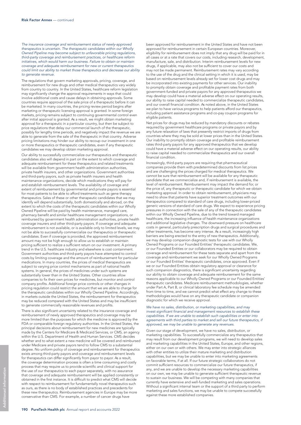 190 PureTech Health plc Annual report and accounts 2022 Risk Factor Annex — continued A d d it io na sl in fo rm at io n been approved for reimbursement in the United States and have not been approved for reimbursement in certain European countries. Moreover, eligibility for reimbursement does not imply that any drug will be paid for in all cases or at a rate that covers our costs, including research, development, manufacture, sale, and distribution. Interim reimbursement levels for new drugs, if applicable, may also not be sufficient to cover our costs and may not be made permanent. Reimbursement rates may vary according to the use of the drug and the clinical setting in which it is used, may be based on reimbursement levels already set for lower cost drugs and may be incorporated into existing payments for other services. Our inability to promptly obtain coverage and profitable payment rates from both government-funded and private payors for any approved therapeutics we may develop could have a material adverse effect on our operating results, our ability to raise capital needed to commercialize therapeutic candidates, and our overall financial condition. As noted above, in the United States we plan to have various programs to help patients afford our therapeutics, including patient assistance programs and co-pay coupon programs for eligible patients. Net prices for drugs may be reduced by mandatory discounts or rebates required by government healthcare programs or private payors and by any future relaxation of laws that presently restrict imports of drugs from countries where they may be sold at lower prices than in the United States. Our inability to promptly obtain coverage and profitable reimbursement rates third-party payors for any approved therapeutics that we develop could have a material adverse effect on our operating results, our ability to raise capital needed to commercialize therapeutics and our overall financial condition. Increasingly, third-party payors are requiring that pharmaceutical companies provide them with predetermined discounts from list prices and are challenging the prices charged for medical therapeutics. We cannot be sure that reimbursement will be available for any therapeutic candidate that we commercialize and, if reimbursement is available, the level of reimbursement. Reimbursement may impact the demand for, or the price of, any therapeutic or therapeutic candidate for which we obtain marketing approval. In order to obtain reimbursement, physicians may need to show that patients have superior treatment outcomes with our therapeutics compared to standard of care drugs, including lower-priced generic versions of standard of care drugs. We expect to experience pricing pressures in connection with the sale of any of the therapeutic candidates within our Wholly Owned Pipeline, due to the trend toward managed healthcare, the increasing influence of health maintenance organizations and additional legislative changes. The downward pressure on healthcare costs in general, particularly prescription drugs and surgical procedures and other treatments, has become very intense. As a result, increasingly high barriers are being erected to the entry of new therapeutics. Additionally, we may develop companion diagnostic tests for use with our Wholly Owned Programs or our Founded Entities’ therapeutic candidates. We, or our Founded Entities or our collaborators may be required to obtain coverage and reimbursement for these tests separate and apart from the coverage and reimbursement we seek for our Wholly Owned Programs or our Founded Entities’ therapeutic candidates, once approved. Even if we or our Founded Entities obtain regulatory approval or clearance for such companion diagnostics, there is significant uncertainty regarding our ability to obtain coverage and adequate reimbursement for the same reasons applicable to our Wholly Owned Programs or our Founded Entities’ therapeutic candidates. Medicare reimbursement methodologies, whether under Part A, Part B, or clinical laboratory fee schedule may be amended from time to time, and we cannot predict what effect any change to these methodologies would have on any therapeutic candidate or companion diagnostic for which we receive approval. We have no sales, distribution, or marketing capabilities, and may invest significant financial and management resources to establish these capabilities. If we are unable to establish such capabilities or enter into agreements with third parties to market and sell our future therapeutics, if approved, we may be unable to generate any revenues. Given our stage of development, we have no sales, distribution, or marketing capabilities. To successfully commercialize any therapeutics that may result from our development programs, we will need to develop sales and marketing capabilities in the United States, Europe, and other regions, either on our own or with others. We may enter into strategic alliances with other entities to utilize their mature marketing and distribution capabilities, but we may be unable to enter into marketing agreements on favorable terms, if at all. If our future strategic collaborators do not commit sufficient resources to commercialize our future therapeutics, if any, and we are unable to develop the necessary marketing capabilities on our own, we may be unable to generate sufficient therapeutic revenue to sustain our business. We will be competing with many companies that currently have extensive and well-funded marketing and sales operations. Without a significant internal team or the support of a third party to perform marketing and sales functions, we may be unable to compete successfully against these more established companies. The insurance coverage and reimbursement status of newly-approved therapeutics is uncertain. The therapeutic candidates within our Wholly Owned Pipeline may become subject to unfavorable pricing regulations, third-party cover