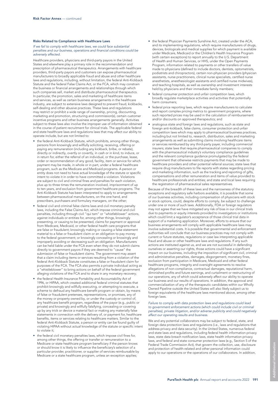 PureTech Health plc Annual report and accounts 2022 191 Risk Factor Annex — continued A d d it io na l i nf o rm at io n • the federal Physician Payments Sunshine Act, created under the ACA, and its implementing regulations, which require manufacturers of drugs, devices, biologicals and medical supplies for which payment is available under Medicare, Medicaid or the Children’s Health Insurance Program (with certain exceptions) to report annually to the U.S. Department of Health and Human Services, or HHS, under the Open Payments Program, information related to payments or other transfers of value made to physicians (defined to include doctors, dentists, optometrists, podiatrists and chiropractors), certain non-physician providers (physician assistants, nurse practitioners, clinical nurse specialists, certified nurse anesthetists, anesthesiologist assistants and certified nurse midwives), and teaching hospitals, as well as ownership and investment interests held by physicians and their immediate family members; • federal consumer protection and unfair competition laws, which broadly regulate marketplace activities and activities that potentially harm consumers; • federal price reporting laws, which require manufacturers to calculate and report complex pricing metrics to government programs, where such reported prices may be used in the calculation of reimbursement and/or discounts on approved therapeutics; and • analogous state and foreign laws and regulations, such as state and foreign anti-kickback, false claims, consumer protection and unfair competition laws which may apply to pharmaceutical business practices, including but not limited to, research, distribution, sales and marketing arrangements as well as submitting claims involving healthcare items or services reimbursed by any third-party payer, including commercial insurers; state laws that require pharmaceutical companies to comply with the pharmaceutical industry’s voluntary compliance guidelines and the relevant compliance guidance promulgated by the federal government that otherwise restricts payments that may be made to healthcare providers and other potential referral sources; state laws that require drug manufacturers to file reports with states regarding pricing and marketing information, such as the tracking and reporting of gifts, compensations and other remuneration and items of value provided to healthcare professionals and entities; and state and local laws requiring the registration of pharmaceutical sales representatives. Because of the breadth of these laws and the narrowness of the statutory exceptions and regulatory safe harbors available, it is possible that some of our business activities, including compensation of physicians with stock or stock options, could, despite efforts to comply, be subject to challenge under one or more of such laws. Additionally, FDA or foreign regulators may not agree that we have mitigated any risk of bias in our clinical trials due to payments or equity interests provided to investigators or institutions which could limit a regulator’s acceptance of those clinical trial data in support of a marketing application. Moreover, efforts to ensure that our business arrangements will comply with applicable healthcare laws may involve substantial costs. It is possible that governmental and enforcement authorities will conclude that our business practices may not comply with current or future statutes, regulations or case law interpreting applicable fraud and abuse or other healthcare laws and regulations. If any such actions are instituted against us, and we are not successful in defending ourselves or asserting our rights, those actions could have a significant impact on our business, including the imposition of significant civil, criminal and administrative penalties, damages, disgorgement, monetary fines, exclusion from participation in Medicare, Medicaid and other federal healthcare programs, integrity and oversight agreements to resolve allegations of non-compliance, contractual damages, reputational harm, diminished profits and future earnings, and curtailment or restructuring of our operations, any of which could adversely affect our ability to operate our business and our results of operations. In addition, the approval and commercialization of any of the therapeutic candidates within our Wholly Owned Pipeline outside the United States will also likely subject us to foreign equivalents of the healthcare laws mentioned above, among other foreign laws. Failure to comply with data protection laws and regulations could lead to government enforcement actions (which could include civil or criminal penalties), private litigation, and/or adverse publicity and could negatively affect our operating results and business. We and any potential collaborators may be subject to federal, state, and foreign data protection laws and regulations (i.e., laws and regulations that address privacy and data security). In the United States, numerous federal and state laws and regulations, including federal health information privacy laws, state data breach notification laws, state health information privacy laws, and federal and state consumer protection laws (e.g., Section 5 of the Federal Trade Commission Act), that govern the collection, use, disclosure and protection of health-related and other personal information could apply to our operations or the operations of our collaborators. In addition, Risks Related to Compliance with Healthcare Laws If we fail to comply with healthcare laws, we could face substantial penalties and our business, operations and financial conditions could be adversely affected. Healthcare providers, physicians and third-party payors in the United States and elsewhere play a primary role in the recommendation and prescription of pharmaceutical therapeutics. Arrangements with healthcare providers, third-party payors and customers can expose pharmaceutical manufactu