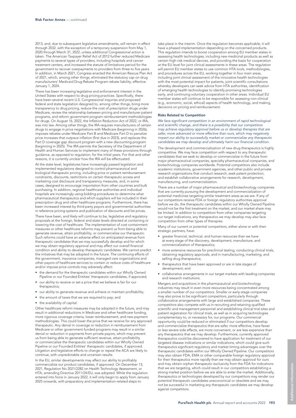 PureTech Health plc Annual report and accounts 2022 193 Risk Factor Annex — continued A d d it io na l i nf o rm at io n take place in the interim. Once the regulation becomes applicable, it will have a phased implementation depending on the concerned products. This regulation intends to boost cooperation among EU member states in assessing health technologies, including new medicinal products as well as certain high-risk medical devices, and providing the basis for cooperation at the EU level for joint clinical assessments in these areas. The regulation will permit EU member states to use common HTA tools, methodologies, and procedures across the EU, working together in four main areas, including joint clinical assessment of the innovative health technologies with the most potential impact for patients, joint scientific consultations whereby developers can seek advice from HTA authorities, identification of emerging health technologies to identify promising technologies early, and continuing voluntary cooperation in other areas. Individual EU member states will continue to be responsible for assessing non-clinical (e.g., economic, social, ethical) aspects of health technology, and making decisions on pricing and reimbursement. Risks Related to Competition We face significant competition in an environment of rapid technological and scientific change, and there is a possibility that our competitors may achieve regulatory approval before us or develop therapies that are safer, more advanced or more effective than ours, which may negatively impact our ability to successfully market or commercialize any therapeutic candidates we may develop and ultimately harm our financial condition. The development and commercialization of new drug therapeutics is highly competitive. We may face competition with respect to any therapeutic candidates that we seek to develop or commercialize in the future from major pharmaceutical companies, specialty pharmaceutical companies, and biotechnology companies worldwide. Potential competitors also include academic institutions, government agencies, and other public and private research organizations that conduct research, seek patent protection, and establish collaborative arrangements for research, development, manufacturing, and commercialization. There are a number of major pharmaceutical and biotechnology companies that are currently pursuing the development and commercialization of potential medicines targeting similar treatment areas as we are. If any of our competitors receive FDA or foreign regulatory authorities approval before we do, the therapeutic candidates within our Wholly Owned Pipeline would not be the first treatment on the market, and our market share may be limited. In addition to competition from other companies targeting our target indications, any therapeutics we may develop may also face competition from other types of therapies. Many of our current or potential competitors, either alone or with their strategic partners, have: • greater financial, technical, and human resources than we have at every stage of the discovery, development, manufacture, and commercialization of therapeutics; • more extensive resources for preclinical testing, conducting clinical trials, obtaining regulatory approvals, and in manufacturing, marketing, and selling drug therapeutics; • therapeutics that have been approved or are in late stages of development; and • collaborative arrangements in our target markets with leading companies and research institutions. Mergers and acquisitions in the pharmaceutical and biotechnology industries may result in even more resources being concentrated among a smaller number of our competitors. Smaller or early-stage companies may also prove to be significant competitors, particularly through collaborative arrangements with large and established companies. These competitors also compete with us in recruiting and retaining qualified scientific and management personnel and establishing clinical trial sites and patient registration for clinical trials, as well as in acquiring technologies complementary to, or necessary for, our programs. Our commercial opportunity could be reduced or eliminated if our competitors develop and commercialize therapeutics that are safer, more effective, have fewer or less severe side effects, are more convenient, or are less expensive than any therapeutics that we may develop. Furthermore, currently approved therapeutics could be discovered to have application for treatment of our targeted disease indications or similar indications, which could give such therapeutics significant regulatory and market timing advantages over the therapeutic candidates within our Wholly Owned Pipeline. Our competitors may also obtain FDA, EMA or other comparable foreign regulatory approval for their therapeutics more rapidly than we may obtain approval for ours and may obtain orphan therapeutic exclusivity from the FDA for indications that we are targeting, which could result in our competitors establishing a strong market position before we are able to enter the market. Additionally, therapeutics or technologies developed by our competitors may render our potential therapeutic candidates uneconomical or obsolete and we may not be successful in marketing any therapeutic candidates we may develop against competitors. 2013, and, due to subsequent legislative amendments, will remain in effect through 2032, with the exception of a temporary suspension from May 1, 2020 through March 31, 2022, unless additional Congressional action is taken. The American Taxpayer Relief Act of 2012 further reduced Medicare payments to several types of providers, including hospitals and cancer treatment centers, and increased the statute of limitations period for the government to recover overpayments to providers from three to five years. In addition, in March 2021, Congress enacted the American Rescue Plan Act of 2021, which, among o