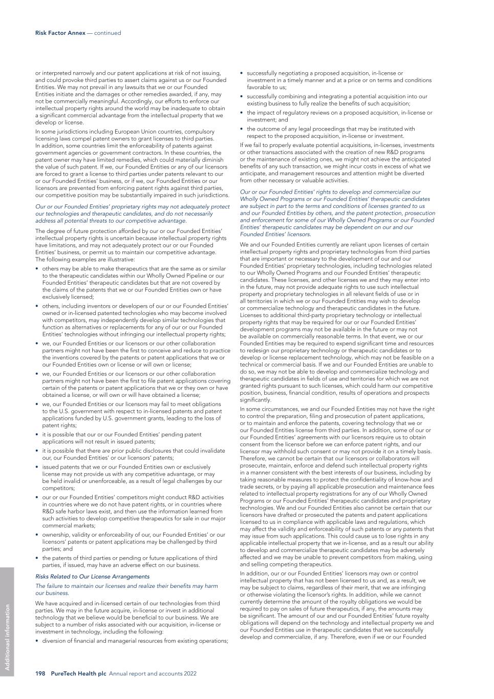 198 PureTech Health plc Annual report and accounts 2022 Risk Factor Annex — continued A d d it io na sl in fo rm at io n • successfully negotiating a proposed acquisition, in-license or investment in a timely manner and at a price or on terms and conditions favorable to us; • successfully combining and integrating a potential acquisition into our existing business to fully realize the benefits of such acquisition; • the impact of regulatory reviews on a proposed acquisition, in-license or investment; and • the outcome of any legal proceedings that may be instituted with respect to the proposed acquisition, in-license or investment. If we fail to properly evaluate potential acquisitions, in-licenses, investments or other transactions associated with the creation of new R&D programs or the maintenance of existing ones, we might not achieve the anticipated benefits of any such transaction, we might incur costs in excess of what we anticipate, and management resources and attention might be diverted from other necessary or valuable activities. Our or our Founded Entities’ rights to develop and commercialize our Wholly Owned Programs or our Founded Entities’ therapeutic candidates are subject in part to the terms and conditions of licenses granted to us and our Founded Entities by others, and the patent protection, prosecution and enforcement for some of our Wholly Owned Programs or our Founded Entities’ therapeutic candidates may be dependent on our and our Founded Entities’ licensors. We and our Founded Entities currently are reliant upon licenses of certain intellectual property rights and proprietary technologies from third parties that are important or necessary to the development of our and our Founded Entities’ proprietary technologies, including technologies related to our Wholly Owned Programs and our Founded Entities’ therapeutic candidates. These licenses, and other licenses we and they may enter into in the future, may not provide adequate rights to use such intellectual property and proprietary technologies in all relevant fields of use or in all territories in which we or our Founded Entities may wish to develop or commercialize technology and therapeutic candidates in the future. Licenses to additional third-party proprietary technology or intellectual property rights that may be required for our or our Founded Entities’ development programs may not be available in the future or may not be available on commercially reasonable terms. In that event, we or our Founded Entities may be required to expend significant time and resources to redesign our proprietary technology or therapeutic candidates or to develop or license replacement technology, which may not be feasible on a technical or commercial basis. If we and our Founded Entities are unable to do so, we may not be able to develop and commercialize technology and therapeutic candidates in fields of use and territories for which we are not granted rights pursuant to such licenses, which could harm our competitive position, business, financial condition, results of operations and prospects significantly. In some circumstances, we and our Founded Entities may not have the right to control the preparation, filing and prosecution of patent applications, or to maintain and enforce the patents, covering technology that we or our Founded Entities license from third parties. In addition, some of our or our Founded Entities’ agreements with our licensors require us to obtain consent from the licensor before we can enforce patent rights, and our licensor may withhold such consent or may not provide it on a timely basis. Therefore, we cannot be certain that our licensors or collaborators will prosecute, maintain, enforce and defend such intellectual property rights in a manner consistent with the best interests of our business, including by taking reasonable measures to protect the confidentiality of know-how and trade secrets, or by paying all applicable prosecution and maintenance fees related to intellectual property registrations for any of our Wholly Owned Programs or our Founded Entities’ therapeutic candidates and proprietary technologies. We and our Founded Entities also cannot be certain that our licensors have drafted or prosecuted the patents and patent applications licensed to us in compliance with applicable laws and regulations, which may affect the validity and enforceability of such patents or any patents that may issue from such applications. This could cause us to lose rights in any applicable intellectual property that we in-license, and as a result our ability to develop and commercialize therapeutic candidates may be adversely affected and we may be unable to prevent competitors from making, using and selling competing therapeutics. In addition, our or our Founded Entities’ licensors may own or control intellectual property that has not been licensed to us and, as a result, we may be subject to claims, regardless of their merit, that we are infringing or otherwise violating the licensor’s rights. In addition, while we cannot currently determine the amount of the royalty obligations we would be required to pay on sales of future therapeutics, if any, the amounts may be significant. The amount of our and our Founded Entities’ future royalty obligations will depend on the technology and intellectual property we and our Founded Entities use in therapeutic candidates that we successfully develop and commercialize, if any. Therefore, even if we or our Founded or interpreted narrowly and our patent applications at risk of not issuing, and could provoke third parties to assert claims against us or our Founded Entities. We may not prevail in any lawsuits that we or our Founded Entities initiate and the damages or other remedies awarded, if any, may not be commercially meaningful. Accordingly, our efforts to enforce our intellectual property rights around the world may be inadequate to obtain 