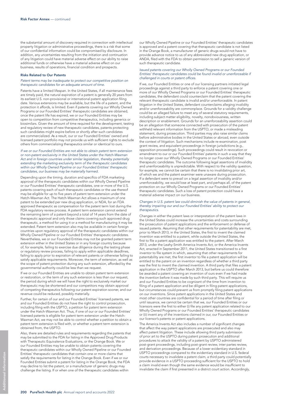 200 PureTech Health plc Annual report and accounts 2022 Risk Factor Annex — continued A d d it io na sl in fo rm at io n our Wholly Owned Pipeline or our Founded Entities’ therapeutic candidates is approved and a patent covering that therapeutic candidate is not listed in the Orange Book, a manufacturer of generic drugs would not have to provide advance notice to us of any abbreviated new drug application, or ANDA, filed with the FDA to obtain permission to sell a generic version of such therapeutic candidate. Issued patents covering our Wholly Owned Programs or our Founded Entities’ therapeutic candidates could be found invalid or unenforceable if challenged in courts or patent offices. If we, our Founded Entities or one of our licensing partners initiated legal proceedings against a third party to enforce a patent covering one or more of our Wholly Owned Programs or our Founded Entities’ therapeutic candidates, the defendant could counterclaim that the patent covering the relevant therapeutic candidate is invalid and/or unenforceable. In patent litigation in the United States, defendant counterclaims alleging invalidity and/or unenforceability are commonplace. Grounds for a validity challenge could be an alleged failure to meet any of several statutory requirements, including subject matter eligibility, novelty, nonobviousness, written description or enablement. Grounds for an unenforceability assertion could be an allegation that someone connected with prosecution of the patent withheld relevant information from the USPTO, or made a misleading statement, during prosecution. Third parties may also raise similar claims before administrative bodies in the United States or abroad, even outside the context of litigation. Such mechanisms include re-examination, post grant review, and equivalent proceedings in foreign jurisdictions (e.g., opposition proceedings). Such proceedings could result in revocation or amendment to our or our Founded Entities’ patents in such a way that they no longer cover our Wholly Owned Programs or our Founded Entities’ therapeutic candidates. The outcome following legal assertions of invalidity and unenforceability is unpredictable. With respect to the validity question, for example, we cannot be certain that there is no invalidating prior art, of which we and the patent examiner were unaware during prosecution. If a defendant were to prevail on a legal assertion of invalidity and/or unenforceability, we would lose at least part, and perhaps all, of the patent protection on our Wholly Owned Programs or our Founded Entities’ therapeutic candidates. Such a loss of patent protection could have a material adverse impact on our business. Changes in U.S. patent law could diminish the value of patents in general, thereby impairing our and our Founded Entities’ ability to protect our therapeutics. Changes in either the patent laws or interpretation of the patent laws in the United States could increase the uncertainties and costs surrounding the prosecution of patent applications and the enforcement or defense of issued patents. Assuming that other requirements for patentability are met, prior to March 2013, in the United States, the first to invent the claimed invention was entitled to a patent, while outside the United States, the first to file a patent application was entitled to the patent. After March 2013, under the Leahy-Smith America Invents Act, or the America Invents Act, enacted in September 2011, the United States transitioned to a first inventor to file system in which, assuming that other requirements for patentability are met, the first inventor to file a patent application will be entitled to the patent on an invention regardless of whether a third party was the first to invent the claimed invention. A third party that files a patent application in the USPTO after March 2013, but before us could therefore be awarded a patent covering an invention of ours even if we had made the invention before it was made by such third party. This will require us and our Founded Entities to be cognizant of the time from invention to filing of a patent application and be diligent in filing patent applications, but circumstances could prevent us from promptly filing patent applications on our inventions. Since patent applications in the United States and most other countries are confidential for a period of time after filing or until issuance, we cannot be certain that we, our Founded Entities or our licensors were the first to either (i) file any patent application related to our Wholly Owned Programs or our Founded Entities’ therapeutic candidates or (ii) invent any of the inventions claimed in our, our Founded Entities or our licensor’s patents or patent applications. The America Invents Act also includes a number of significant changes that affect the way patent applications are prosecuted and also may affect patent litigation. These include allowing third party submission of prior art to the USPTO during patent prosecution and additional procedures to attack the validity of a patent by USPTO administered post-grant proceedings, including post-grant review, inter partes review, and derivation proceedings. Because of a lower evidentiary standard in USPTO proceedings compared to the evidentiary standard in U.S. federal courts necessary to invalidate a patent claim, a third party could potentially provide evidence in a USPTO proceeding sufficient for the USPTO to hold a claim invalid even though the same evidence would be insufficient to invalidate the claim if first presented in a district court action. Accordingly, the substantial amount of discovery required in connection with intellectual property litigation or administrative proceedings, there is a risk that some of our confidential information could be compromised by disclosure. In addition, any uncertainties resulting from the initiation and continuation of any litigation could have material adv
