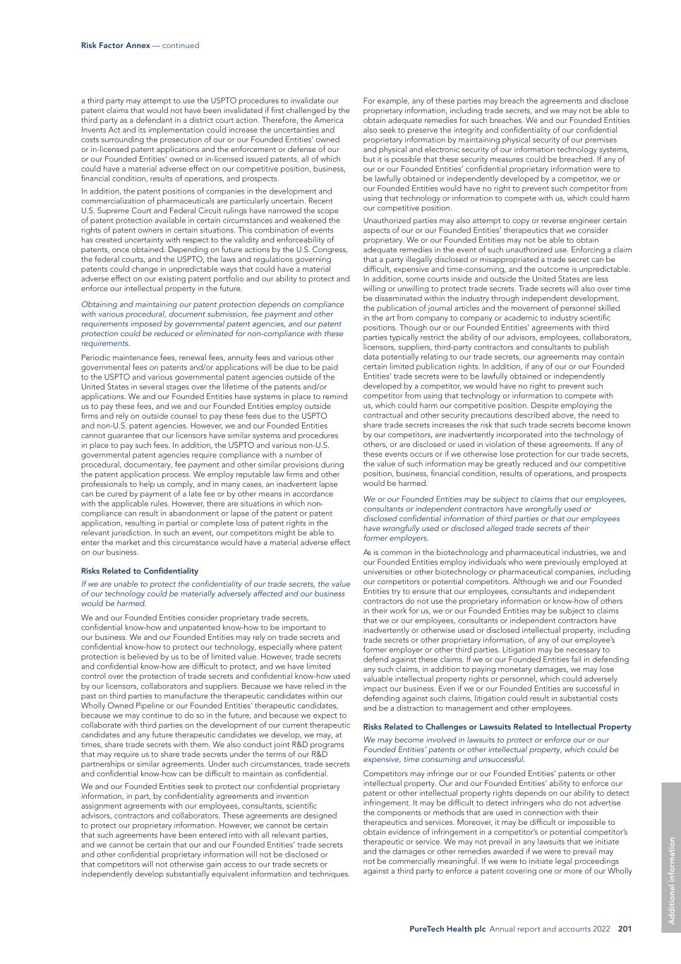 PureTech Health plc Annual report and accounts 2022 201 Risk Factor Annex — continued A d d it io na l i nf o rm at io n For example, any of these parties may breach the agreements and disclose proprietary information, including trade secrets, and we may not be able to obtain adequate remedies for such breaches. We and our Founded Entities also seek to preserve the integrity and confidentiality of our confidential proprietary information by maintaining physical security of our premises and physical and electronic security of our information technology systems, but it is possible that these security measures could be breached. If any of our or our Founded Entities’ confidential proprietary information were to be lawfully obtained or independently developed by a competitor, we or our Founded Entities would have no right to prevent such competitor from using that technology or information to compete with us, which could harm our competitive position. Unauthorized parties may also attempt to copy or reverse engineer certain aspects of our or our Founded Entities’ therapeutics that we consider proprietary. We or our Founded Entities may not be able to obtain adequate remedies in the event of such unauthorized use. Enforcing a claim that a party illegally disclosed or misappropriated a trade secret can be difficult, expensive and time-consuming, and the outcome is unpredictable. In addition, some courts inside and outside the United States are less willing or unwilling to protect trade secrets. Trade secrets will also over time be disseminated within the industry through independent development, the publication of journal articles and the movement of personnel skilled in the art from company to company or academic to industry scientific positions. Though our or our Founded Entities’ agreements with third parties typically restrict the ability of our advisors, employees, collaborators, licensors, suppliers, third-party contractors and consultants to publish data potentially relating to our trade secrets, our agreements may contain certain limited publication rights. In addition, if any of our or our Founded Entities’ trade secrets were to be lawfully obtained or independently developed by a competitor, we would have no right to prevent such competitor from using that technology or information to compete with us, which could harm our competitive position. Despite employing the contractual and other security precautions described above, the need to share trade secrets increases the risk that such trade secrets become known by our competitors, are inadvertently incorporated into the technology of others, or are disclosed or used in violation of these agreements. If any of these events occurs or if we otherwise lose protection for our trade secrets, the value of such information may be greatly reduced and our competitive position, business, financial condition, results of operations, and prospects would be harmed. We or our Founded Entities may be subject to claims that our employees, consultants or independent contractors have wrongfully used or disclosed confidential information of third parties or that our employees have wrongfully used or disclosed alleged trade secrets of their former employers. As is common in the biotechnology and pharmaceutical industries, we and our Founded Entities employ individuals who were previously employed at universities or other biotechnology or pharmaceutical companies, including our competitors or potential competitors. Although we and our Founded Entities try to ensure that our employees, consultants and independent contractors do not use the proprietary information or know-how of others in their work for us, we or our Founded Entities may be subject to claims that we or our employees, consultants or independent contractors have inadvertently or otherwise used or disclosed intellectual property, including trade secrets or other proprietary information, of any of our employee’s former employer or other third parties. Litigation may be necessary to defend against these claims. If we or our Founded Entities fail in defending any such claims, in addition to paying monetary damages, we may lose valuable intellectual property rights or personnel, which could adversely impact our business. Even if we or our Founded Entities are successful in defending against such claims, litigation could result in substantial costs and be a distraction to management and other employees. Risks Related to Challenges or Lawsuits Related to Intellectual Property We may become involved in lawsuits to protect or enforce our or our Founded Entities’ patents or other intellectual property, which could be expensive, time consuming and unsuccessful. Competitors may infringe our or our Founded Entities’ patents or other intellectual property. Our and our Founded Entities’ ability to enforce our patent or other intellectual property rights depends on our ability to detect infringement. It may be difficult to detect infringers who do not advertise the components or methods that are used in connection with their therapeutics and services. Moreover, it may be difficult or impossible to obtain evidence of infringement in a competitor’s or potential competitor’s therapeutic or service. We may not prevail in any lawsuits that we initiate and the damages or other remedies awarded if we were to prevail may not be commercially meaningful. If we were to initiate legal proceedings against a third party to enforce a patent covering one or more of our Wholly a third party may attempt to use the USPTO procedures to invalidate our patent claims that would not have been invalidated if first challenged by the third party as a defendant in a district court action. Therefore, the America Invents Act and its implementation could increase the uncertainties and costs surrounding the prosecution of our or our Founded Entities’ owned or in-licensed patent applications and the enforcement or defe