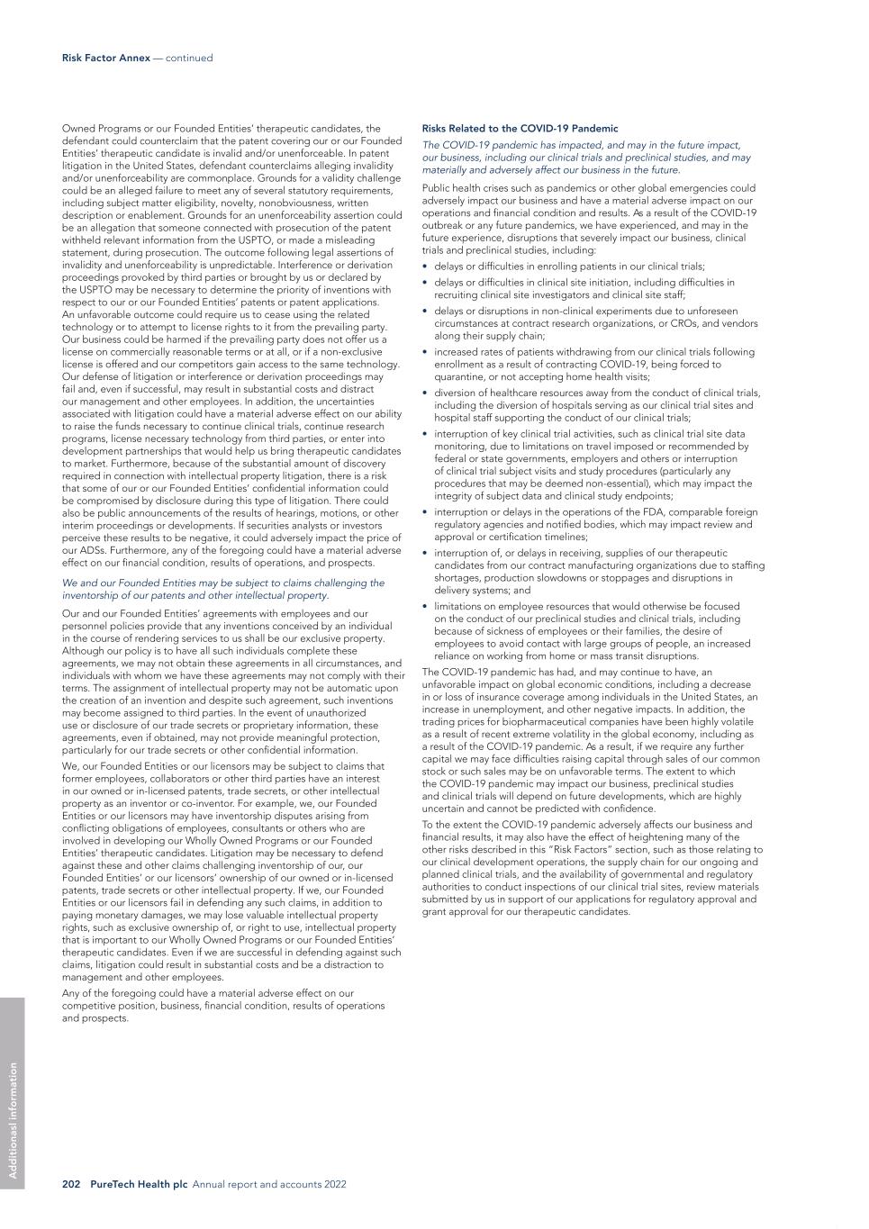 202 PureTech Health plc Annual report and accounts 2022 Risk Factor Annex — continued A d d it io na sl in fo rm at io n Risks Related to the COVID-19 Pandemic The COVID-19 pandemic has impacted, and may in the future impact, our business, including our clinical trials and preclinical studies, and may materially and adversely affect our business in the future. Public health crises such as pandemics or other global emergencies could adversely impact our business and have a material adverse impact on our operations and financial condition and results. As a result of the COVID-19 outbreak or any future pandemics, we have experienced, and may in the future experience, disruptions that severely impact our business, clinical trials and preclinical studies, including: • delays or difficulties in enrolling patients in our clinical trials; • delays or difficulties in clinical site initiation, including difficulties in recruiting clinical site investigators and clinical site staff; • delays or disruptions in non-clinical experiments due to unforeseen circumstances at contract research organizations, or CROs, and vendors along their supply chain; • increased rates of patients withdrawing from our clinical trials following enrollment as a result of contracting COVID-19, being forced to quarantine, or not accepting home health visits; • diversion of healthcare resources away from the conduct of clinical trials, including the diversion of hospitals serving as our clinical trial sites and hospital staff supporting the conduct of our clinical trials; • interruption of key clinical trial activities, such as clinical trial site data monitoring, due to limitations on travel imposed or recommended by federal or state governments, employers and others or interruption of clinical trial subject visits and study procedures (particularly any procedures that may be deemed non-essential), which may impact the integrity of subject data and clinical study endpoints; • interruption or delays in the operations of the FDA, comparable foreign regulatory agencies and notified bodies, which may impact review and approval or certification timelines; • interruption of, or delays in receiving, supplies of our therapeutic candidates from our contract manufacturing organizations due to staffing shortages, production slowdowns or stoppages and disruptions in delivery systems; and • limitations on employee resources that would otherwise be focused on the conduct of our preclinical studies and clinical trials, including because of sickness of employees or their families, the desire of employees to avoid contact with large groups of people, an increased reliance on working from home or mass transit disruptions. The COVID-19 pandemic has had, and may continue to have, an unfavorable impact on global economic conditions, including a decrease in or loss of insurance coverage among individuals in the United States, an increase in unemployment, and other negative impacts. In addition, the trading prices for biopharmaceutical companies have been highly volatile as a result of recent extreme volatility in the global economy, including as a result of the COVID-19 pandemic. As a result, if we require any further capital we may face difficulties raising capital through sales of our common stock or such sales may be on unfavorable terms. The extent to which the COVID-19 pandemic may impact our business, preclinical studies and clinical trials will depend on future developments, which are highly uncertain and cannot be predicted with confidence. To the extent the COVID-19 pandemic adversely affects our business and financial results, it may also have the effect of heightening many of the other risks described in this “Risk Factors” section, such as those relating to our clinical development operations, the supply chain for our ongoing and planned clinical trials, and the availability of governmental and regulatory authorities to conduct inspections of our clinical trial sites, review materials submitted by us in support of our applications for regulatory approval and grant approval for our therapeutic candidates. Owned Programs or our Founded Entities’ therapeutic candidates, the defendant could counterclaim that the patent covering our or our Founded Entities’ therapeutic candidate is invalid and/or unenforceable. In patent litigation in the United States, defendant counterclaims alleging invalidity and/or unenforceability are commonplace. Grounds for a validity challenge could be an alleged failure to meet any of several statutory requirements, including subject matter eligibility, novelty, nonobviousness, written description or enablement. Grounds for an unenforceability assertion could be an allegation that someone connected with prosecution of the patent withheld relevant information from the USPTO, or made a misleading statement, during prosecution. The outcome following legal assertions of invalidity and unenforceability is unpredictable. Interference or derivation proceedings provoked by third parties or brought by us or declared by the USPTO may be necessary to determine the priority of inventions with respect to our or our Founded Entities’ patents or patent applications. An unfavorable outcome could require us to cease using the related technology or to attempt to license rights to it from the prevailing party. Our business could be harmed if the prevailing party does not offer us a license on commercially reasonable terms or at all, or if a non-exclusive license is offered and our competitors gain access to the same technology. Our defense of litigation or interference or derivation proceedings may fail and, even if successful, may result in substantial costs and distract our management and other employees. In addition, the uncertainties associated with litigation could have a material adverse effect on our ability to raise the funds necessary to continue clinical trials, continue research programs, l