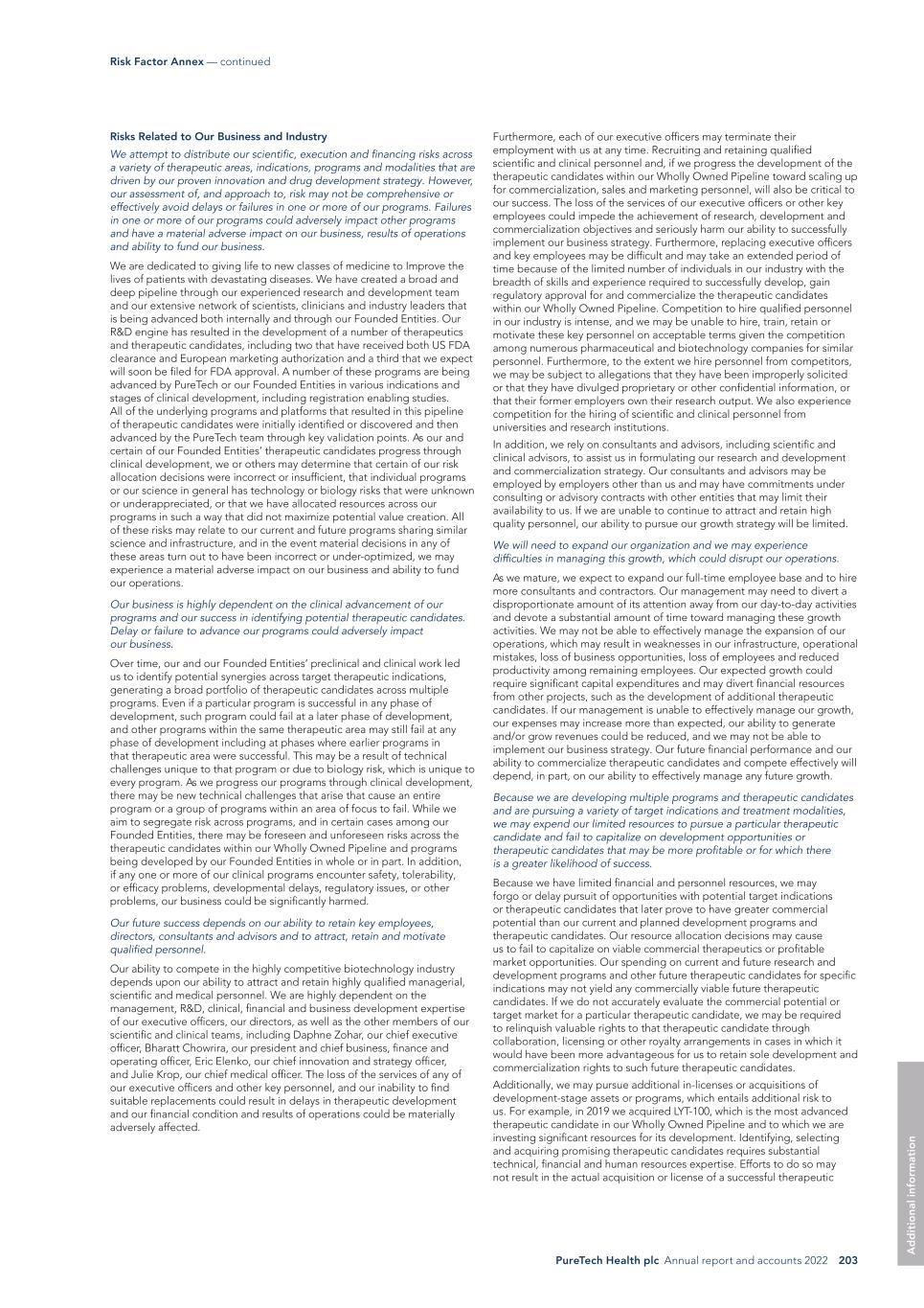 PureTech Health plc Annual report and accounts 2022 203 Risk Factor Annex — continued A d d it io na l i nf o rm at io n Furthermore, each of our executive officers may terminate their employment with us at any time. Recruiting and retaining qualified scientific and clinical personnel and, if we progress the development of the therapeutic candidates within our Wholly Owned Pipeline toward scaling up for commercialization, sales and marketing personnel, will also be critical to our success. The loss of the services of our executive officers or other key employees could impede the achievement of research, development and commercialization objectives and seriously harm our ability to successfully implement our business strategy. Furthermore, replacing executive officers and key employees may be difficult and may take an extended period of time because of the limited number of individuals in our industry with the breadth of skills and experience required to successfully develop, gain regulatory approval for and commercialize the therapeutic candidates within our Wholly Owned Pipeline. Competition to hire qualified personnel in our industry is intense, and we may be unable to hire, train, retain or motivate these key personnel on acceptable terms given the competition among numerous pharmaceutical and biotechnology companies for similar personnel. Furthermore, to the extent we hire personnel from competitors, we may be subject to allegations that they have been improperly solicited or that they have divulged proprietary or other confidential information, or that their former employers own their research output. We also experience competition for the hiring of scientific and clinical personnel from universities and research institutions. In addition, we rely on consultants and advisors, including scientific and clinical advisors, to assist us in formulating our research and development and commercialization strategy. Our consultants and advisors may be employed by employers other than us and may have commitments under consulting or advisory contracts with other entities that may limit their availability to us. If we are unable to continue to attract and retain high quality personnel, our ability to pursue our growth strategy will be limited. We will need to expand our organization and we may experience difficulties in managing this growth, which could disrupt our operations. As we mature, we expect to expand our full-time employee base and to hire more consultants and contractors. Our management may need to divert a disproportionate amount of its attention away from our day-to-day activities and devote a substantial amount of time toward managing these growth activities. We may not be able to effectively manage the expansion of our operations, which may result in weaknesses in our infrastructure, operational mistakes, loss of business opportunities, loss of employees and reduced productivity among remaining employees. Our expected growth could require significant capital expenditures and may divert financial resources from other projects, such as the development of additional therapeutic candidates. If our management is unable to effectively manage our growth, our expenses may increase more than expected, our ability to generate and/or grow revenues could be reduced, and we may not be able to implement our business strategy. Our future financial performance and our ability to commercialize therapeutic candidates and compete effectively will depend, in part, on our ability to effectively manage any future growth. Because we are developing multiple programs and therapeutic candidates and are pursuing a variety of target indications and treatment modalities, we may expend our limited resources to pursue a particular therapeutic candidate and fail to capitalize on development opportunities or therapeutic candidates that may be more profitable or for which there is a greater likelihood of success. Because we have limited financial and personnel resources, we may forgo or delay pursuit of opportunities with potential target indications or therapeutic candidates that later prove to have greater commercial potential than our current and planned development programs and therapeutic candidates. Our resource allocation decisions may cause us to fail to capitalize on viable commercial therapeutics or profitable market opportunities. Our spending on current and future research and development programs and other future therapeutic candidates for specific indications may not yield any commercially viable future therapeutic candidates. If we do not accurately evaluate the commercial potential or target market for a particular therapeutic candidate, we may be required to relinquish valuable rights to that therapeutic candidate through collaboration, licensing or other royalty arrangements in cases in which it would have been more advantageous for us to retain sole development and commercialization rights to such future therapeutic candidates. Additionally, we may pursue additional in-licenses or acquisitions of development-stage assets or programs, which entails additional risk to us. For example, in 2019 we acquired LYT-100, which is the most advanced therapeutic candidate in our Wholly Owned Pipeline and to which we are investing significant resources for its development. Identifying, selecting and acquiring promising therapeutic candidates requires substantial technical, financial and human resources expertise. Efforts to do so may not result in the actual acquisition or license of a successful therapeutic Risks Related to Our Business and Industry We attempt to distribute our scientific, execution and financing risks across a variety of therapeutic areas, indications, programs and modalities that are driven by our proven innovation and drug development strategy. However, our assessment of, and approach to, risk may not be comprehensive or effectively avoid delays or failures in one or more of our program