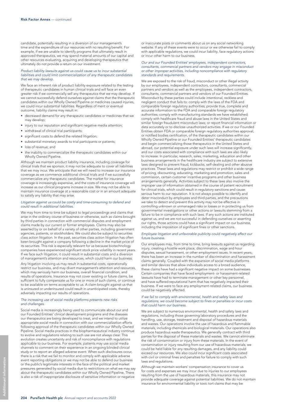 204 PureTech Health plc Annual report and accounts 2022 Risk Factor Annex — continued A d d it io na sl in fo rm at io n or inaccurate posts or comments about us on any social networking website. If any of these events were to occur or we otherwise fail to comply with applicable regulations, we could incur liability, face regulatory actions or incur other harm to our business. Our and our Founded Entities’ employees, independent contractors, consultants, commercial partners and vendors may engage in misconduct or other improper activities, including noncompliance with regulatory standards and requirements. We are exposed to the risk of fraud, misconduct or other illegal activity by our employees, independent contractors, consultants, commercial partners and vendors as well as the employees, independent contractors, consultants, commercial partners and vendors of our Founded Entities. Misconduct by these parties could include intentional, reckless and negligent conduct that fails to: comply with the laws of the FDA and comparable foreign regulatory authorities; provide true, complete and accurate information to the FDA and comparable foreign regulatory authorities; comply with manufacturing standards we have established; comply with healthcare fraud and abuse laws in the United States and similar foreign fraudulent misconduct laws; or report financial information or data accurately or to disclose unauthorized activities. If we or our Founded Entities obtain FDA or comparable foreign regulatory authorities approval, or notified bodies certification, of the therapeutic candidates within our Wholly Owned Pipeline or our Founded Entities’ therapeutic candidates and begin commercializing those therapeutics in the United States and abroad, our potential exposure under such laws will increase significantly, and our costs associated with compliance with such laws are also likely to increase. In particular, research, sales, marketing, education and other business arrangements in the healthcare industry are subject to extensive laws designed to prevent fraud, kickbacks, self-dealing and other abusive practices. These laws and regulations may restrict or prohibit a wide range of pricing, discounting, educating, marketing and promotion, sales and commission, certain customer incentive programs and other business arrangements generally. Activities subject to these laws also involve the improper use of information obtained in the course of patient recruitment for clinical trials, which could result in regulatory sanctions and cause serious harm to our reputation. It is not always possible to identify and deter misconduct by employees and third parties, and the precautions we take to detect and prevent this activity may not be effective in controlling unknown or unmanaged risks or losses or in protecting us from governmental investigations or other actions or lawsuits stemming from a failure to be in compliance with such laws. If any such actions are instituted against us, and we are not successful in defending ourselves or asserting our rights, those actions could have a significant impact on our business, including the imposition of significant fines or other sanctions. Employee litigation and unfavorable publicity could negatively affect our future business. Our employees may, from time to time, bring lawsuits against us regarding injury, creating a hostile work place, discrimination, wage and hour disputes, sexual harassment, or other employment issues. In recent years, there has been an increase in the number of discrimination and harassment claims generally. Coupled with the expansion of social media platforms and similar devices that allow individuals access to a broad audience, these claims have had a significant negative impact on some businesses. Certain companies that have faced employment- or harassment-related lawsuits have had to terminate management or other key personnel, and have suffered reputational harm that has negatively impacted their business. If we were to face any employment-related claims, our business could be negatively affected. If we fail to comply with environmental, health and safety laws and regulations, we could become subject to fines or penalties or incur costs that could harm our business. We are subject to numerous environmental, health and safety laws and regulations, including those governing laboratory procedures and the handling, use, storage, treatment and disposal of hazardous materials and wastes. Our operations involve the use of hazardous and flammable materials, including chemicals and biological materials. Our operations also produce hazardous waste therapeutics. We generally contract with third parties for the disposal of these materials and wastes. We cannot eliminate the risk of contamination or injury from these materials. In the event of contamination or injury resulting from our use of hazardous materials, we could be held liable for any resulting damages, and any liability could exceed our resources. We also could incur significant costs associated with civil or criminal fines and penalties for failure to comply with such laws and regulations. Although we maintain workers’ compensation insurance to cover us for costs and expenses we may incur due to injuries to our employees resulting from the use of hazardous materials, this insurance may not provide adequate coverage against potential liabilities. We do not maintain insurance for environmental liability or toxic tort claims that may be candidate, potentially resulting in a diversion of our management’s time and the expenditure of our resources with no resulting benefit. For example, if we are unable to identify programs that ultimately result in approved therapeutics, we may spend material amounts of our capital and other resources evaluating, acquiring and developing therapeutics that ultimately do not provide a return on our investment. Product liability lawsuits against us could cau