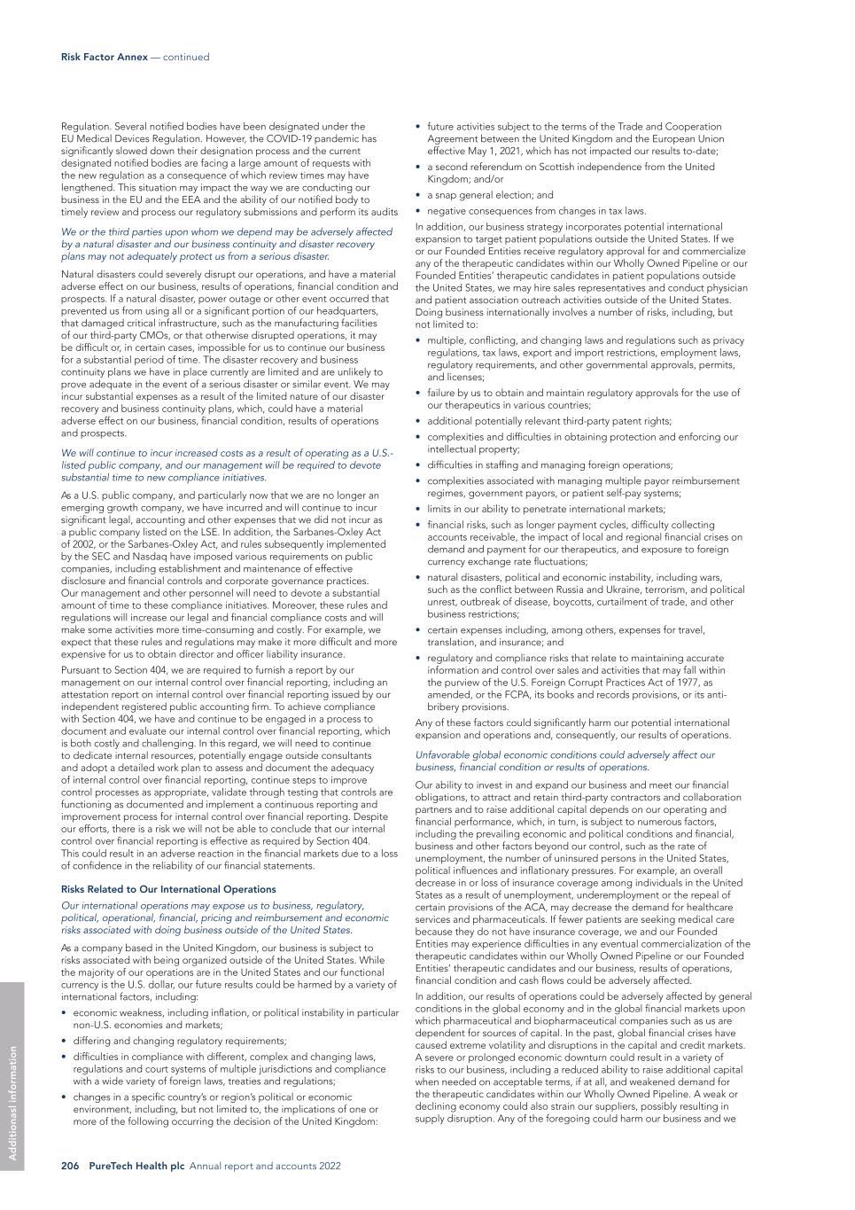 206 PureTech Health plc Annual report and accounts 2022 Risk Factor Annex — continued A d d it io na sl in fo rm at io n • future activities subject to the terms of the Trade and Cooperation Agreement between the United Kingdom and the European Union effective May 1, 2021, which has not impacted our results to-date; • a second referendum on Scottish independence from the United Kingdom; and/or • a snap general election; and • negative consequences from changes in tax laws. In addition, our business strategy incorporates potential international expansion to target patient populations outside the United States. If we or our Founded Entities receive regulatory approval for and commercialize any of the therapeutic candidates within our Wholly Owned Pipeline or our Founded Entities’ therapeutic candidates in patient populations outside the United States, we may hire sales representatives and conduct physician and patient association outreach activities outside of the United States. Doing business internationally involves a number of risks, including, but not limited to: • multiple, conflicting, and changing laws and regulations such as privacy regulations, tax laws, export and import restrictions, employment laws, regulatory requirements, and other governmental approvals, permits, and licenses; • failure by us to obtain and maintain regulatory approvals for the use of our therapeutics in various countries; • additional potentially relevant third-party patent rights; • complexities and difficulties in obtaining protection and enforcing our intellectual property; • difficulties in staffing and managing foreign operations; • complexities associated with managing multiple payor reimbursement regimes, government payors, or patient self-pay systems; • limits in our ability to penetrate international markets; • financial risks, such as longer payment cycles, difficulty collecting accounts receivable, the impact of local and regional financial crises on demand and payment for our therapeutics, and exposure to foreign currency exchange rate fluctuations; • natural disasters, political and economic instability, including wars, such as the conflict between Russia and Ukraine, terrorism, and political unrest, outbreak of disease, boycotts, curtailment of trade, and other business restrictions; • certain expenses including, among others, expenses for travel, translation, and insurance; and • regulatory and compliance risks that relate to maintaining accurate information and control over sales and activities that may fall within the purview of the U.S. Foreign Corrupt Practices Act of 1977, as amended, or the FCPA, its books and records provisions, or its anti- bribery provisions. Any of these factors could significantly harm our potential international expansion and operations and, consequently, our results of operations. Unfavorable global economic conditions could adversely affect our business, financial condition or results of operations. Our ability to invest in and expand our business and meet our financial obligations, to attract and retain third-party contractors and collaboration partners and to raise additional capital depends on our operating and financial performance, which, in turn, is subject to numerous factors, including the prevailing economic and political conditions and financial, business and other factors beyond our control, such as the rate of unemployment, the number of uninsured persons in the United States, political influences and inflationary pressures. For example, an overall decrease in or loss of insurance coverage among individuals in the United States as a result of unemployment, underemployment or the repeal of certain provisions of the ACA, may decrease the demand for healthcare services and pharmaceuticals. If fewer patients are seeking medical care because they do not have insurance coverage, we and our Founded Entities may experience difficulties in any eventual commercialization of the therapeutic candidates within our Wholly Owned Pipeline or our Founded Entities’ therapeutic candidates and our business, results of operations, financial condition and cash flows could be adversely affected. In addition, our results of operations could be adversely affected by general conditions in the global economy and in the global financial markets upon which pharmaceutical and biopharmaceutical companies such as us are dependent for sources of capital. In the past, global financial crises have caused extreme volatility and disruptions in the capital and credit markets. A severe or prolonged economic downturn could result in a variety of risks to our business, including a reduced ability to raise additional capital when needed on acceptable terms, if at all, and weakened demand for the therapeutic candidates within our Wholly Owned Pipeline. A weak or declining economy could also strain our suppliers, possibly resulting in supply disruption. Any of the foregoing could harm our business and we Regulation. Several notified bodies have been designated under the EU Medical Devices Regulation. However, the COVID-19 pandemic has significantly slowed down their designation process and the current designated notified bodies are facing a large amount of requests with the new regulation as a consequence of which review times may have lengthened. This situation may impact the way we are conducting our business in the EU and the EEA and the ability of our notified body to timely review and process our regulatory submissions and perform its audits We or the third parties upon whom we depend may be adversely affected by a natural disaster and our business continuity and disaster recovery plans may not adequately protect us from a serious disaster. Natural disasters could severely disrupt our operations, and have a material adverse effect on our business, results of operations, financial condition and prospects. If a natural disaster, power outage or other event