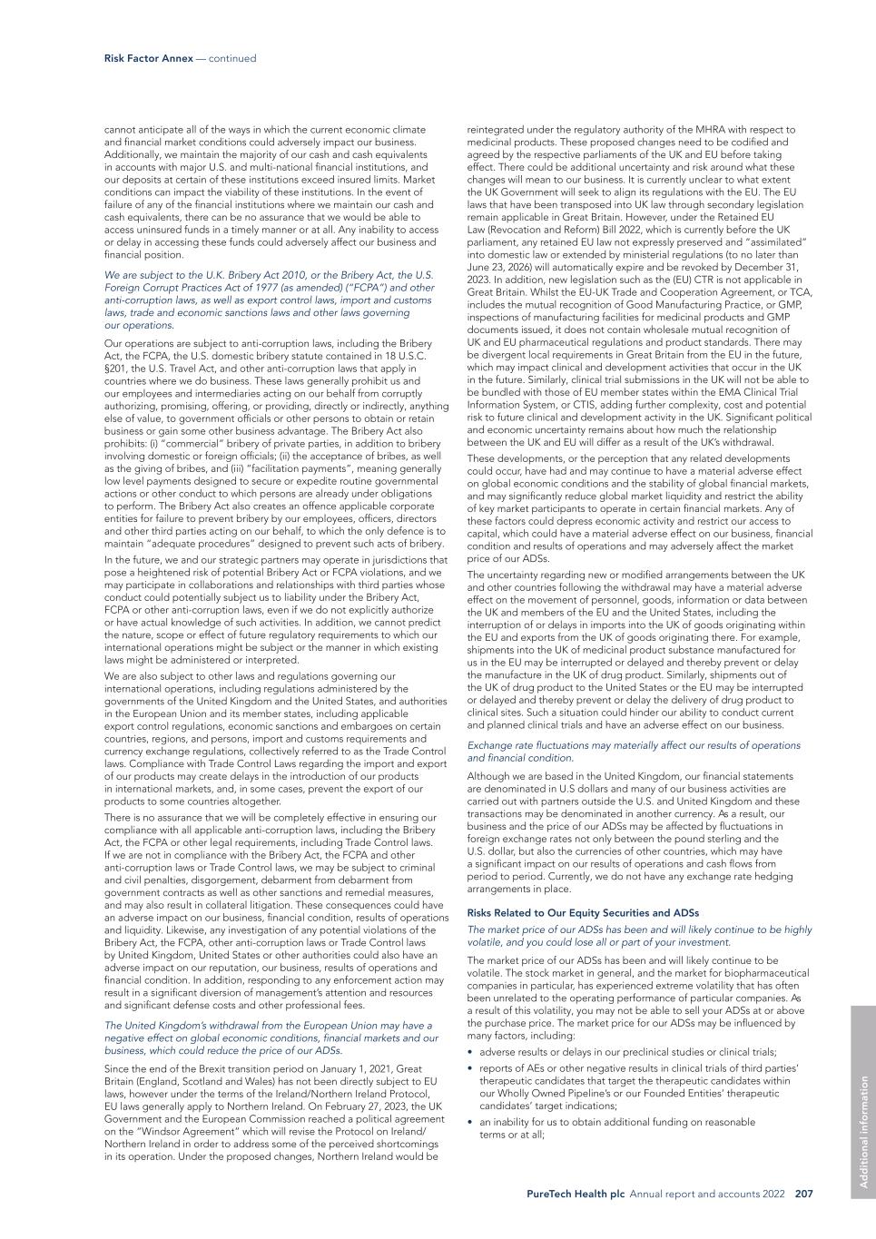 PureTech Health plc Annual report and accounts 2022 207 Risk Factor Annex — continued A d d it io na l i nf o rm at io n reintegrated under the regulatory authority of the MHRA with respect to medicinal products. These proposed changes need to be codified and agreed by the respective parliaments of the UK and EU before taking effect. There could be additional uncertainty and risk around what these changes will mean to our business. It is currently unclear to what extent the UK Government will seek to align its regulations with the EU. The EU laws that have been transposed into UK law through secondary legislation remain applicable in Great Britain. However, under the Retained EU Law (Revocation and Reform) Bill 2022, which is currently before the UK parliament, any retained EU law not expressly preserved and “assimilated” into domestic law or extended by ministerial regulations (to no later than June 23, 2026) will automatically expire and be revoked by December 31, 2023. In addition, new legislation such as the (EU) CTR is not applicable in Great Britain. Whilst the EU-UK Trade and Cooperation Agreement, or TCA, includes the mutual recognition of Good Manufacturing Practice, or GMP, inspections of manufacturing facilities for medicinal products and GMP documents issued, it does not contain wholesale mutual recognition of UK and EU pharmaceutical regulations and product standards. There may be divergent local requirements in Great Britain from the EU in the future, which may impact clinical and development activities that occur in the UK in the future. Similarly, clinical trial submissions in the UK will not be able to be bundled with those of EU member states within the EMA Clinical Trial Information System, or CTIS, adding further complexity, cost and potential risk to future clinical and development activity in the UK. Significant political and economic uncertainty remains about how much the relationship between the UK and EU will differ as a result of the UK’s withdrawal. These developments, or the perception that any related developments could occur, have had and may continue to have a material adverse effect on global economic conditions and the stability of global financial markets, and may significantly reduce global market liquidity and restrict the ability of key market participants to operate in certain financial markets. Any of these factors could depress economic activity and restrict our access to capital, which could have a material adverse effect on our business, financial condition and results of operations and may adversely affect the market price of our ADSs. The uncertainty regarding new or modified arrangements between the UK and other countries following the withdrawal may have a material adverse effect on the movement of personnel, goods, information or data between the UK and members of the EU and the United States, including the interruption of or delays in imports into the UK of goods originating within the EU and exports from the UK of goods originating there. For example, shipments into the UK of medicinal product substance manufactured for us in the EU may be interrupted or delayed and thereby prevent or delay the manufacture in the UK of drug product. Similarly, shipments out of the UK of drug product to the United States or the EU may be interrupted or delayed and thereby prevent or delay the delivery of drug product to clinical sites. Such a situation could hinder our ability to conduct current and planned clinical trials and have an adverse effect on our business. Exchange rate fluctuations may materially affect our results of operations and financial condition. Although we are based in the United Kingdom, our financial statements are denominated in U.S dollars and many of our business activities are carried out with partners outside the U.S. and United Kingdom and these transactions may be denominated in another currency. As a result, our business and the price of our ADSs may be affected by fluctuations in foreign exchange rates not only between the pound sterling and the U.S. dollar, but also the currencies of other countries, which may have a significant impact on our results of operations and cash flows from period to period. Currently, we do not have any exchange rate hedging arrangements in place. Risks Related to Our Equity Securities and ADSs The market price of our ADSs has been and will likely continue to be highly volatile, and you could lose all or part of your investment. The market price of our ADSs has been and will likely continue to be volatile. The stock market in general, and the market for biopharmaceutical companies in particular, has experienced extreme volatility that has often been unrelated to the operating performance of particular companies. As a result of this volatility, you may not be able to sell your ADSs at or above the purchase price. The market price for our ADSs may be influenced by many factors, including: • adverse results or delays in our preclinical studies or clinical trials; • reports of AEs or other negative results in clinical trials of third parties’ therapeutic candidates that target the therapeutic candidates within our Wholly Owned Pipeline’s or our Founded Entities’ therapeutic candidates’ target indications; • an inability for us to obtain additional funding on reasonable terms or at all; cannot anticipate all of the ways in which the current economic climate and financial market conditions could adversely impact our business. Additionally, we maintain the majority of our cash and cash equivalents in accounts with major U.S. and multi-national financial institutions, and our deposits at certain of these institutions exceed insured limits. Market conditions can impact the viability of these institutions. In the event of failure of any of the financial institutions where we maintain our cash and cash equivalents, there can be no assurance that we would be able to access uninsured funds