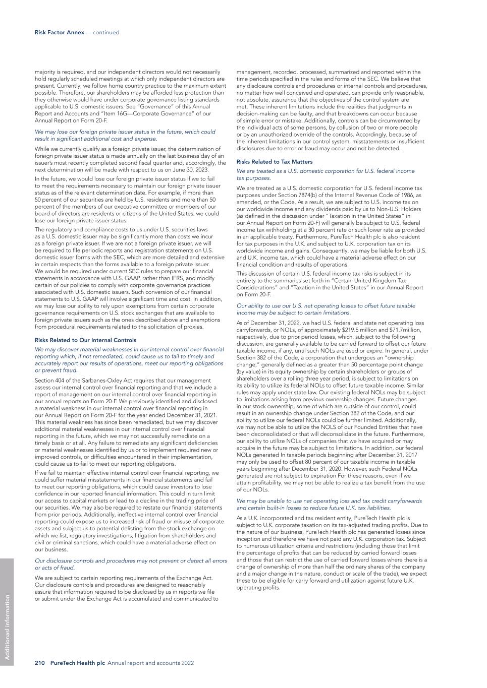 210 PureTech Health plc Annual report and accounts 2022 Risk Factor Annex — continued A d d it io na sl in fo rm at io n management, recorded, processed, summarized and reported within the time periods specified in the rules and forms of the SEC. We believe that any disclosure controls and procedures or internal controls and procedures, no matter how well conceived and operated, can provide only reasonable, not absolute, assurance that the objectives of the control system are met. These inherent limitations include the realities that judgments in decision-making can be faulty, and that breakdowns can occur because of simple error or mistake. Additionally, controls can be circumvented by the individual acts of some persons, by collusion of two or more people or by an unauthorized override of the controls. Accordingly, because of the inherent limitations in our control system, misstatements or insufficient disclosures due to error or fraud may occur and not be detected. Risks Related to Tax Matters We are treated as a U.S. domestic corporation for U.S. federal income tax purposes. We are treated as a U.S. domestic corporation for U.S. federal income tax purposes under Section 7874(b) of the Internal Revenue Code of 1986, as amended, or the Code. As a result, we are subject to U.S. income tax on our worldwide income and any dividends paid by us to Non-U.S. Holders (as defined in the discussion under “Taxation in the United States” in our Annual Report on Form 20-F) will generally be subject to U.S. federal income tax withholding at a 30 percent rate or such lower rate as provided in an applicable treaty. Furthermore, PureTech Health plc is also resident for tax purposes in the U.K. and subject to U.K. corporation tax on its worldwide income and gains. Consequently, we may be liable for both U.S. and U.K. income tax, which could have a material adverse effect on our financial condition and results of operations. This discussion of certain U.S. federal income tax risks is subject in its entirety to the summaries set forth in “Certain United Kingdom Tax Considerations” and “Taxation in the United States” in our Annual Report on Form 20-F. Our ability to use our U.S. net operating losses to offset future taxable income may be subject to certain limitations. As of December 31, 2022, we had U.S. federal and state net operating loss carryforwards, or NOLs, of approximately $219.5 million and $71.7million, respectively, due to prior period losses, which, subject to the following discussion, are generally available to be carried forward to offset our future taxable income, if any, until such NOLs are used or expire. In general, under Section 382 of the Code, a corporation that undergoes an “ownership change,” generally defined as a greater than 50 percentage point change (by value) in its equity ownership by certain shareholders or groups of shareholders over a rolling three year period, is subject to limitations on its ability to utilize its federal NOLs to offset future taxable income. Similar rules may apply under state law. Our existing federal NOLs may be subject to limitations arising from previous ownership changes. Future changes in our stock ownership, some of which are outside of our control, could result in an ownership change under Section 382 of the Code, and our ability to utilize our federal NOLs could be further limited. Additionally, we may not be able to utilize the NOLS of our Founded Entities that have been deconsolidated or that will deconsolidate in the future. Furthermore, our ability to utilize NOLs of companies that we have acquired or may acquire in the future may be subject to limitations. In addition, our federal NOLs generated In taxable periods beginning after December 31, 2017 may only be used to offset 80 percent of our taxable income in taxable years beginning after December 31, 2020. However, such Federal NOLs generated are not subject to expiration For these reasons, even if we attain profitability, we may not be able to realize a tax benefit from the use of our NOLs. We may be unable to use net operating loss and tax credit carryforwards and certain built-in losses to reduce future U.K. tax liabilities. As a U.K. incorporated and tax resident entity, PureTech Health plc is subject to U.K. corporate taxation on its tax-adjusted trading profits. Due to the nature of our business, PureTech Health plc has generated losses since inception and therefore we have not paid any U.K. corporation tax. Subject to numerous utilization criteria and restrictions (including those that limit the percentage of profits that can be reduced by carried forward losses and those that can restrict the use of carried forward losses where there is a change of ownership of more than half the ordinary shares of the company and a major change in the nature, conduct or scale of the trade), we expect these to be eligible for carry forward and utilization against future U.K. operating profits. majority is required, and our independent directors would not necessarily hold regularly scheduled meetings at which only independent directors are present. Currently, we follow home country practice to the maximum extent possible. Therefore, our shareholders may be afforded less protection than they otherwise would have under corporate governance listing standards applicable to U.S. domestic issuers. See “Governance” of this Annual Report and Accounts and “Item 16G—Corporate Governance” of our Annual Report on Form 20-F. We may lose our foreign private issuer status in the future, which could result in significant additional cost and expense. While we currently qualify as a foreign private issuer, the determination of foreign private issuer status is made annually on the last business day of an issuer’s most recently completed second fiscal quarter and, accordingly, the next determination will be made with respect to us on June 30, 2023. In the future, we would lose our foreign