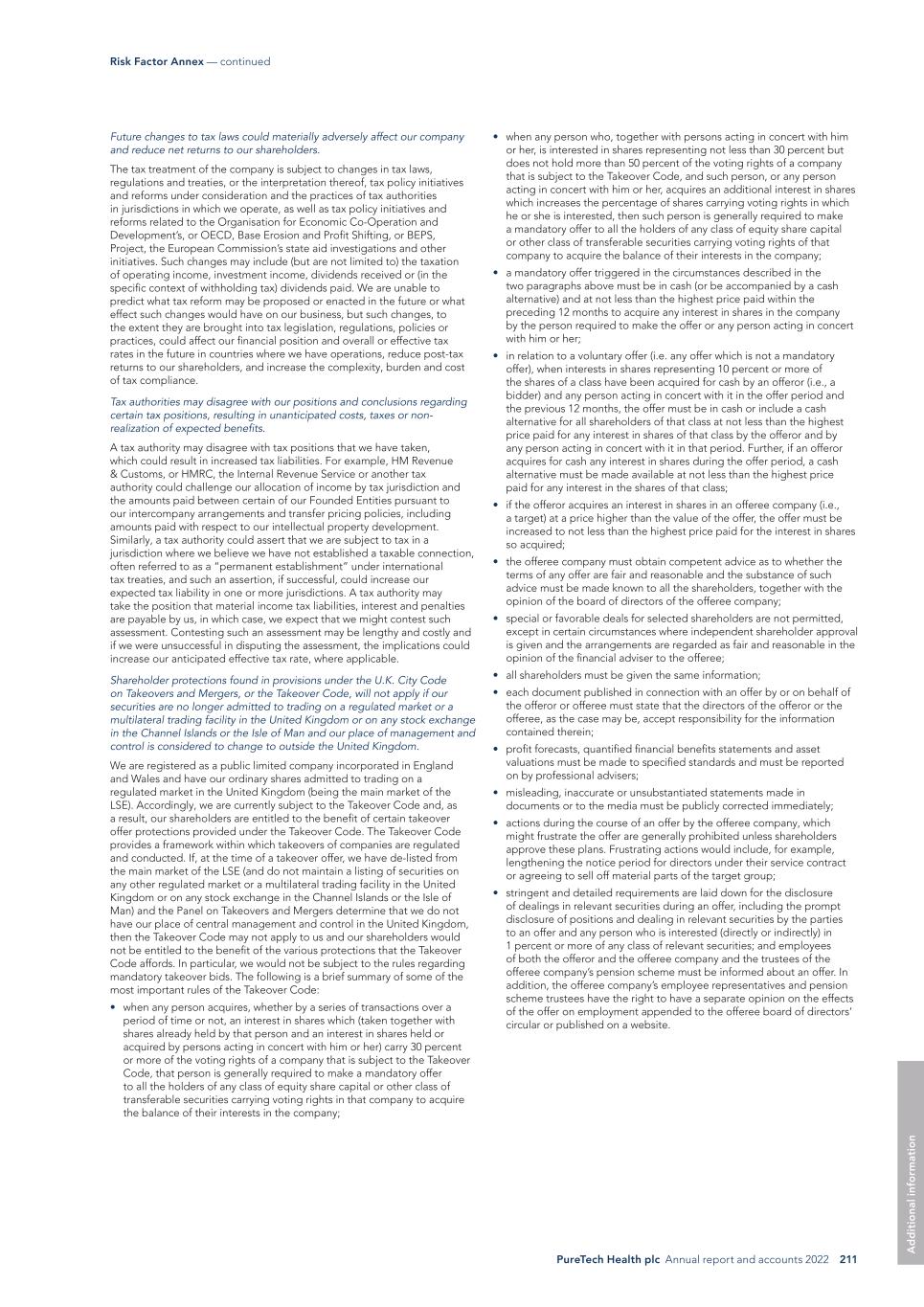 PureTech Health plc Annual report and accounts 2022 211 Risk Factor Annex — continued A d d it io na l i nf o rm at io n • when any person who, together with persons acting in concert with him or her, is interested in shares representing not less than 30 percent but does not hold more than 50 percent of the voting rights of a company that is subject to the Takeover Code, and such person, or any person acting in concert with him or her, acquires an additional interest in shares which increases the percentage of shares carrying voting rights in which he or she is interested, then such person is generally required to make a mandatory offer to all the holders of any class of equity share capital or other class of transferable securities carrying voting rights of that company to acquire the balance of their interests in the company; • a mandatory offer triggered in the circumstances described in the two paragraphs above must be in cash (or be accompanied by a cash alternative) and at not less than the highest price paid within the preceding 12 months to acquire any interest in shares in the company by the person required to make the offer or any person acting in concert with him or her; • in relation to a voluntary offer (i.e. any offer which is not a mandatory offer), when interests in shares representing 10 percent or more of the shares of a class have been acquired for cash by an offeror (i.e., a bidder) and any person acting in concert with it in the offer period and the previous 12 months, the offer must be in cash or include a cash alternative for all shareholders of that class at not less than the highest price paid for any interest in shares of that class by the offeror and by any person acting in concert with it in that period. Further, if an offeror acquires for cash any interest in shares during the offer period, a cash alternative must be made available at not less than the highest price paid for any interest in the shares of that class; • if the offeror acquires an interest in shares in an offeree company (i.e., a target) at a price higher than the value of the offer, the offer must be increased to not less than the highest price paid for the interest in shares so acquired; • the offeree company must obtain competent advice as to whether the terms of any offer are fair and reasonable and the substance of such advice must be made known to all the shareholders, together with the opinion of the board of directors of the offeree company; • special or favorable deals for selected shareholders are not permitted, except in certain circumstances where independent shareholder approval is given and the arrangements are regarded as fair and reasonable in the opinion of the financial adviser to the offeree; • all shareholders must be given the same information; • each document published in connection with an offer by or on behalf of the offeror or offeree must state that the directors of the offeror or the offeree, as the case may be, accept responsibility for the information contained therein; • profit forecasts, quantified financial benefits statements and asset valuations must be made to specified standards and must be reported on by professional advisers; • misleading, inaccurate or unsubstantiated statements made in documents or to the media must be publicly corrected immediately; • actions during the course of an offer by the offeree company, which might frustrate the offer are generally prohibited unless shareholders approve these plans. Frustrating actions would include, for example, lengthening the notice period for directors under their service contract or agreeing to sell off material parts of the target group; • stringent and detailed requirements are laid down for the disclosure of dealings in relevant securities during an offer, including the prompt disclosure of positions and dealing in relevant securities by the parties to an offer and any person who is interested (directly or indirectly) in 1 percent or more of any class of relevant securities; and employees of both the offeror and the offeree company and the trustees of the offeree company’s pension scheme must be informed about an offer. In addition, the offeree company’s employee representatives and pension scheme trustees have the right to have a separate opinion on the effects of the offer on employment appended to the offeree board of directors’ circular or published on a website. Future changes to tax laws could materially adversely affect our company and reduce net returns to our shareholders. The tax treatment of the company is subject to changes in tax laws, regulations and treaties, or the interpretation thereof, tax policy initiatives and reforms under consideration and the practices of tax authorities in jurisdictions in which we operate, as well as tax policy initiatives and reforms related to the Organisation for Economic Co-Operation and Development’s, or OECD, Base Erosion and Profit Shifting, or BEPS, Project, the European Commission’s state aid investigations and other initiatives. Such changes may include (but are not limited to) the taxation of operating income, investment income, dividends received or (in the specific context of withholding tax) dividends paid. We are unable to predict what tax reform may be proposed or enacted in the future or what effect such changes would have on our business, but such changes, to the extent they are brought into tax legislation, regulations, policies or practices, could affect our financial position and overall or effective tax rates in the future in countries where we have operations, reduce post-tax returns to our shareholders, and increase the complexity, burden and cost of tax compliance. Tax authorities may disagree with our positions and conclusions regarding certain tax positions, resulting in unanticipated costs, taxes or non- realization of expected benefits. A tax authority may disagree with tax positions that we have ta