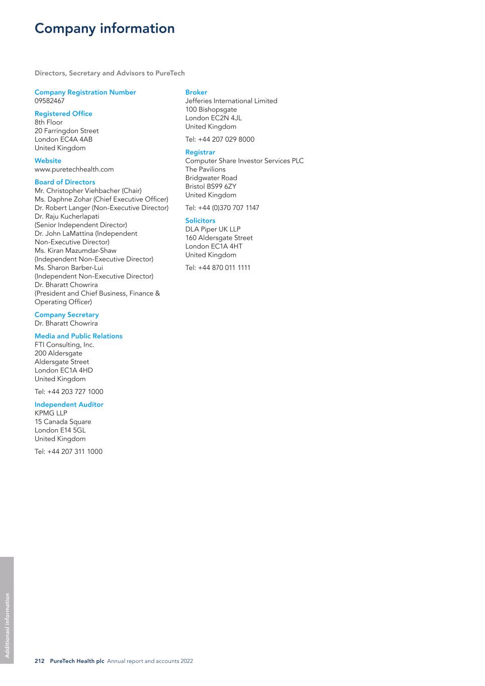 212 PureTech Health plc Annual report and accounts 2022 A d d it io na sl in fo rm at io n Broker Jefferies International Limited 100 Bishopsgate London EC2N 4JL United Kingdom Tel: +44 207 029 8000 Registrar Computer Share Investor Services PLC The Pavilions Bridgwater Road Bristol BS99 6ZY United Kingdom Tel: +44 (0)370 707 1147 Solicitors DLA Piper UK LLP 160 Aldersgate Street London EC1A 4HT United Kingdom Tel: +44 870 011 1111 Company Registration Number 09582467 Registered Office 8th Floor 20 Farringdon Street London EC4A 4AB United Kingdom Website www.puretechhealth.com Board of Directors Mr. Christopher Viehbacher (Chair) Ms. Daphne Zohar (Chief Executive Officer) Dr. Robert Langer (Non-Executive Director) Dr. Raju Kucherlapati (Senior Independent Director) Dr. John LaMattina (Independent Non-Executive Director) Ms. Kiran Mazumdar-Shaw (Independent Non-Executive Director) Ms. Sharon Barber-Lui (Independent Non-Executive Director) Dr. Bharatt Chowrira (President and Chief Business, Finance & Operating Officer) Company Secretary Dr. Bharatt Chowrira Media and Public Relations FTI Consulting, Inc. 200 Aldersgate Aldersgate Street London EC1A 4HD United Kingdom Tel: +44 203 727 1000 Independent Auditor KPMG LLP 15 Canada Square London E14 5GL United Kingdom Tel: +44 207 311 1000 Directors, Secretary and Advisors to PureTech Company information