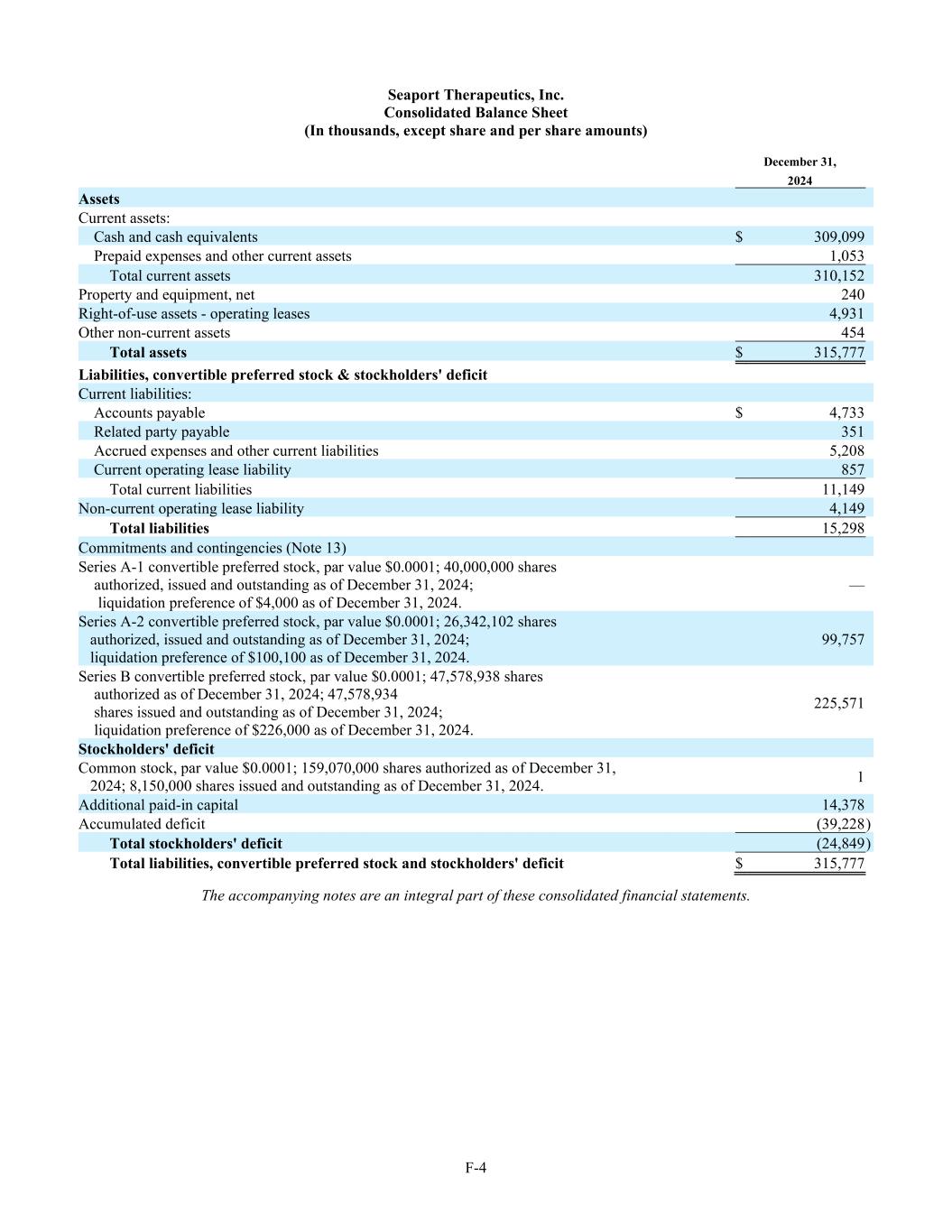 F-4 Seaport Therapeutics, Inc.  Consolidated Balance Sheet  (In thousands, except share and per share amounts)  December 31,  2024  Assets  Current assets:  Cash and cash equivalents $ 309,099  Prepaid expenses and other current assets 1,053  Total current assets 310,152  Property and equipment, net 240  Right-of-use assets - operating leases 4,931  Other non-current assets 454  Total assets $ 315,777  Liabilities, convertible preferred stock & stockholders' deficit  Current liabilities:  Accounts payable $ 4,733  Related party payable 351  Accrued expenses and other current liabilities 5,208  Current operating lease liability 857  Total current liabilities 11,149  Non-current operating lease liability 4,149  Total liabilities 15,298  Commitments and contingencies (Note 13)  Series A-1 convertible preferred stock, par value $0.0001; 40,000,000 shares      authorized, issued and outstanding as of December 31, 2024;       liquidation preference of $4,000 as of December 31, 2024.  —  Series A-2 convertible preferred stock, par value $0.0001; 26,342,102 shares     authorized, issued and outstanding as of December 31, 2024;     liquidation preference of $100,100 as of December 31, 2024.  99,757  Series B convertible preferred stock, par value $0.0001; 47,578,938 shares      authorized as of December 31, 2024; 47,578,934      shares issued and outstanding as of December 31, 2024;      liquidation preference of $226,000 as of December 31, 2024.  225,571  Stockholders' deficit  Common stock, par value $0.0001; 159,070,000 shares authorized as of December 31,     2024; 8,150,000 shares issued and outstanding as of December 31, 2024. 1  Additional paid-in capital 14,378  Accumulated deficit (39,228 )  Total stockholders' deficit (24,849 )  Total liabilities, convertible preferred stock and stockholders' deficit $ 315,777  The accompanying notes are an integral part of these consolidated financial statements.