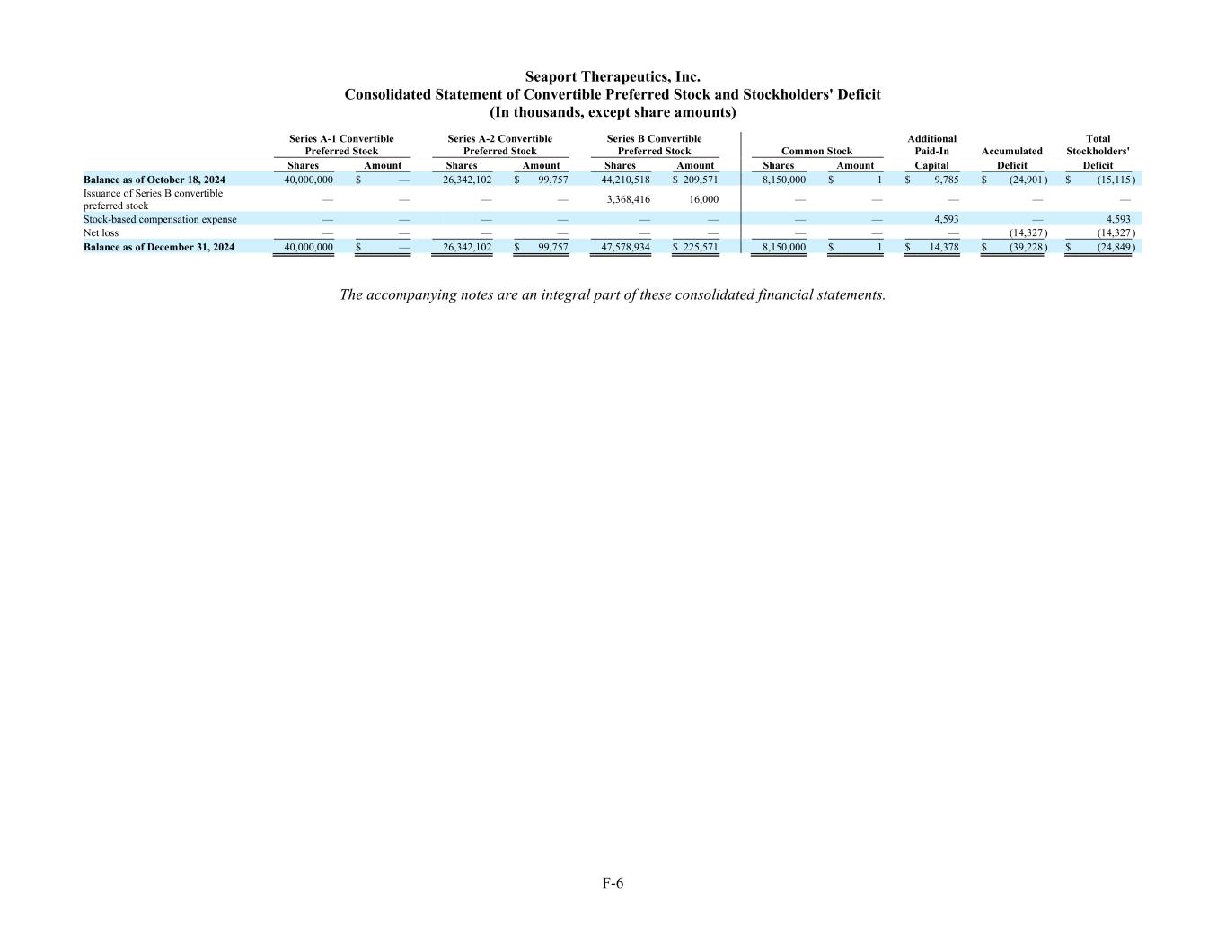 F-6  Seaport Therapeutics, Inc.  Consolidated Statement of Convertible Preferred Stock and Stockholders' Deficit  (In thousands, except share amounts)       Series A-1 Convertible  Preferred Stock    Series A-2 Convertible  Preferred Stock    Series B Convertible  Preferred Stock    Common Stock    Additional  Paid-In   Accumulated    Total  Stockholders'     Shares   Amount   Shares   Amount   Shares   Amount    Shares   Amount   Capital   Deficit   Deficit   Balance as of October 18, 2024   40,000,000   $ —    26,342,102   $ 99,757    44,210,518   $ 209,571    8,150,000   $ 1   $ 9,785   $ (24,901 )  $ (15,115 )  Issuance of Series B convertible  preferred stock   —    —    —    —    3,368,416    16,000    —    —    —    —    —   Stock-based compensation expense   —    —    —    —    —    —    —    —    4,593    —    4,593   Net loss   —    —    —    —    —    —    —    —    —    (14,327 )   (14,327 )  Balance as of December 31, 2024   40,000,000   $ —    26,342,102   $ 99,757    47,578,934   $ 225,571    8,150,000   $ 1   $ 14,378   $ (39,228 )  $ (24,849 )      The accompanying notes are an integral part of these consolidated financial statements.