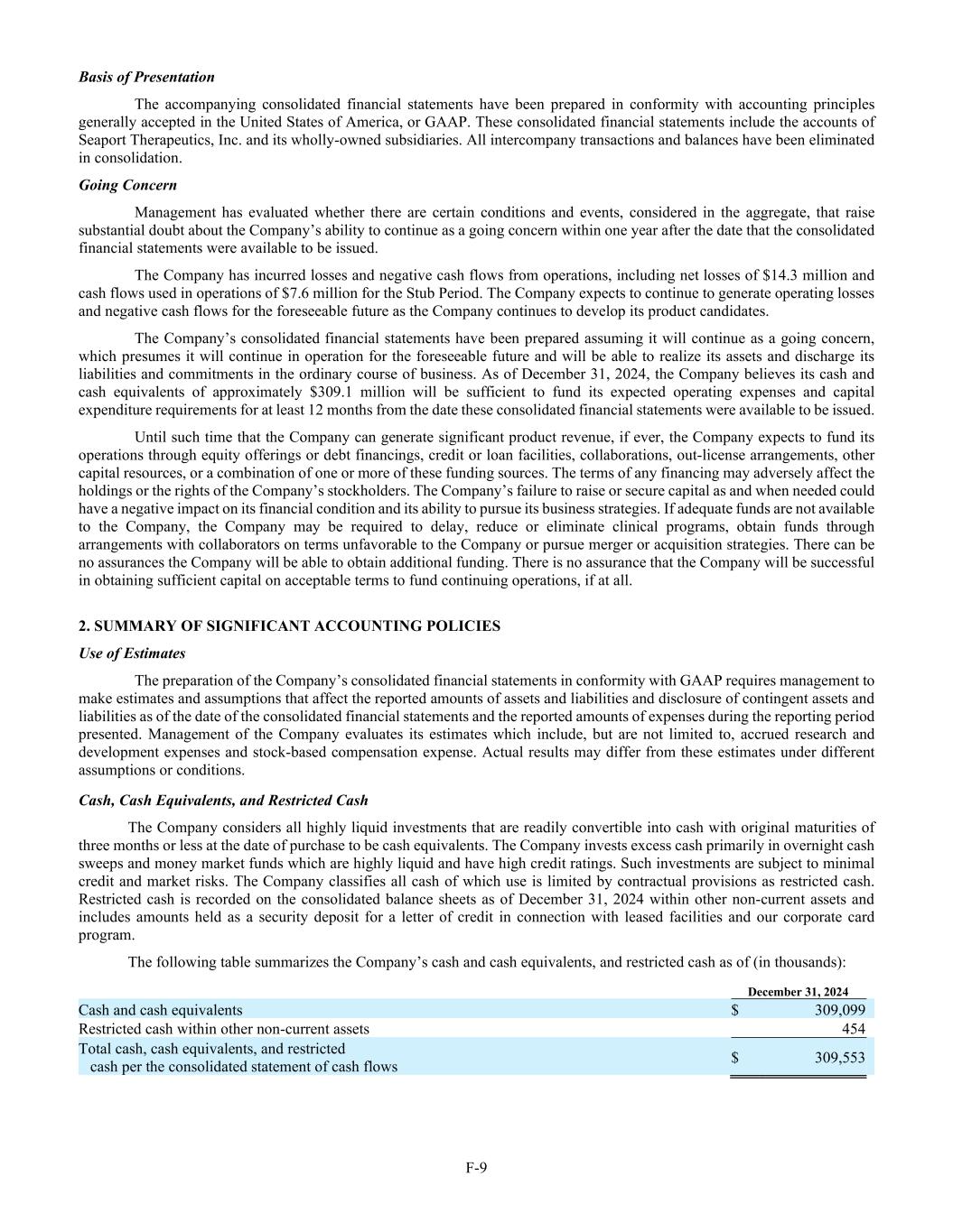 F-9  Basis of Presentation  The accompanying consolidated financial statements have been prepared in conformity with accounting principles  generally accepted in the United States of America, or GAAP. These consolidated financial statements include the accounts of  Seaport Therapeutics, Inc. and its wholly-owned subsidiaries. All intercompany transactions and balances have been eliminated  in consolidation.  Going Concern  Management has evaluated whether there are certain conditions and events, considered in the aggregate, that raise  substantial doubt about the Company’s ability to continue as a going concern within one year after the date that the consolidated  financial statements were available to be issued.  The Company has incurred losses and negative cash flows from operations, including net losses of $14.3 million and  cash flows used in operations of $7.6 million for the Stub Period. The Company expects to continue to generate operating losses  and negative cash flows for the foreseeable future as the Company continues to develop its product candidates.    The Company’s consolidated financial statements have been prepared assuming it will continue as a going concern,  which presumes it will continue in operation for the foreseeable future and will be able to realize its assets and discharge its  liabilities and commitments in the ordinary course of business. As of December 31, 2024, the Company believes its cash and  cash equivalents of approximately $309.1 million will be sufficient to fund its expected operating expenses and capital  expenditure requirements for at least 12 months from the date these consolidated financial statements were available to be issued.     Until such time that the Company can generate significant product revenue, if ever, the Company expects to fund its  operations through equity offerings or debt financings, credit or loan facilities, collaborations, out-license arrangements, other  capital resources, or a combination of one or more of these funding sources. The terms of any financing may adversely affect the  holdings or the rights of the Company’s stockholders. The Company’s failure to raise or secure capital as and when needed could  have a negative impact on its financial condition and its ability to pursue its business strategies. If adequate funds are not available  to the Company, the Company may be required to delay, reduce or eliminate clinical programs, obtain funds through  arrangements with collaborators on terms unfavorable to the Company or pursue merger or acquisition strategies. There can be  no assurances the Company will be able to obtain additional funding. There is no assurance that the Company will be successful  in obtaining sufficient capital on acceptable terms to fund continuing operations, if at all.  2. SUMMARY OF SIGNIFICANT ACCOUNTING POLICIES  Use of Estimates  The preparation of the Company’s consolidated financial statements in conformity with GAAP requires management to  make estimates and assumptions that affect the reported amounts of assets and liabilities and disclosure of contingent assets and  liabilities as of the date of the consolidated financial statements and the reported amounts of expenses during the reporting period  presented. Management of the Company evaluates its estimates which include, but are not limited to, accrued research and  development expenses and stock-based compensation expense. Actual results may differ from these estimates under different  assumptions or conditions.  Cash, Cash Equivalents, and Restricted Cash  The Company considers all highly liquid investments that are readily convertible into cash with original maturities of  three months or less at the date of purchase to be cash equivalents. The Company invests excess cash primarily in overnight cash  sweeps and money market funds which are highly liquid and have high credit ratings. Such investments are subject to minimal  credit and market risks. The Company classifies all cash of which use is limited by contractual provisions as restricted cash.  Restricted cash is recorded on the consolidated balance sheets as of December 31, 2024 within other non-current assets and  includes amounts held as a security deposit for a letter of credit in connection with leased facilities and our corporate card  program.  The following table summarizes the Company’s cash and cash equivalents, and restricted cash as of (in thousands):    December 31, 2024   Cash and cash equivalents $ 309,099  Restricted cash within other non-current assets  454  Total cash, cash equivalents, and restricted     cash per the consolidated statement of cash flows $ 309,553