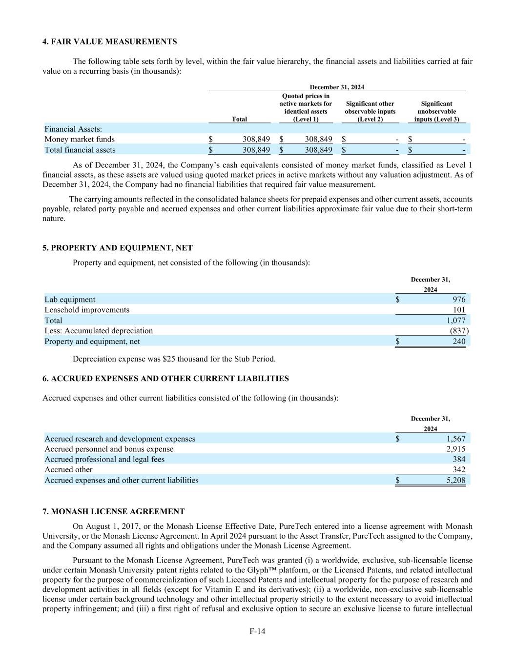 F-14  4. FAIR VALUE MEASUREMENTS  The following table sets forth by level, within the fair value hierarchy, the financial assets and liabilities carried at fair  value on a recurring basis (in thousands):    December 31, 2024     Total    Quoted prices in  active markets for  identical assets  (Level 1)    Significant other  observable inputs  (Level 2)    Significant  unobservable  inputs (Level 3)   Financial Assets:              Money market funds  $ 308,849  $ 308,849  $ -  $ -  Total financial assets  $ 308,849  $ 308,849  $ -  $ -  As of December 31, 2024, the Company’s cash equivalents consisted of money market funds, classified as Level 1  financial assets, as these assets are valued using quoted market prices in active markets without any valuation adjustment. As of  December 31, 2024, the Company had no financial liabilities that required fair value measurement.   The carrying amounts reflected in the consolidated balance sheets for prepaid expenses and other current assets, accounts  payable, related party payable and accrued expenses and other current liabilities approximate fair value due to their short-term  nature.    5. PROPERTY AND EQUIPMENT, NET   Property and equipment, net consisted of the following (in thousands):        December 31,      2024   Lab equipment   $ 976  Leasehold improvements    101  Total    1,077  Less: Accumulated depreciation    (837 )  Property and equipment, net   $ 240    Depreciation expense was $25 thousand for the Stub Period.  6. ACCRUED EXPENSES AND OTHER CURRENT LIABILITIES    Accrued expenses and other current liabilities consisted of the following (in thousands):       December 31,      2024   Accrued research and development expenses   $ 1,567  Accrued personnel and bonus expense   2,915  Accrued professional and legal fees   384  Accrued other   342  Accrued expenses and other current liabilities   $ 5,208    7. MONASH LICENSE AGREEMENT  On August 1, 2017, or the Monash License Effective Date, PureTech entered into a license agreement with Monash  University, or the Monash License Agreement. In April 2024 pursuant to the Asset Transfer, PureTech assigned to the Company,  and the Company assumed all rights and obligations under the Monash License Agreement.  Pursuant to the Monash License Agreement, PureTech was granted (i) a worldwide, exclusive, sub-licensable license  under certain Monash University patent rights related to the Glyph™ platform, or the Licensed Patents, and related intellectual  property for the purpose of commercialization of such Licensed Patents and intellectual property for the purpose of research and  development activities in all fields (except for Vitamin E and its derivatives); (ii) a worldwide, non-exclusive sub-licensable  license under certain background technology and other intellectual property strictly to the extent necessary to avoid intellectual  property infringement; and (iii) a first right of refusal and exclusive option to secure an exclusive license to future intellectual