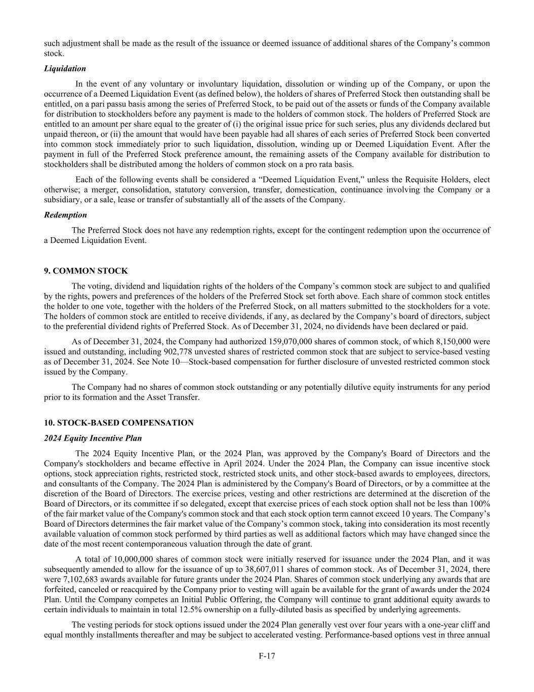 F-17  such adjustment shall be made as the result of the issuance or deemed issuance of additional shares of the Company’s common  stock.   Liquidation  In the event of any voluntary or involuntary liquidation, dissolution or winding up of the Company, or upon the  occurrence of a Deemed Liquidation Event (as defined below), the holders of shares of Preferred Stock then outstanding shall be  entitled, on a pari passu basis among the series of Preferred Stock, to be paid out of the assets or funds of the Company available  for distribution to stockholders before any payment is made to the holders of common stock. The holders of Preferred Stock are  entitled to an amount per share equal to the greater of (i) the original issue price for such series, plus any dividends declared but  unpaid thereon, or (ii) the amount that would have been payable had all shares of each series of Preferred Stock been converted  into common stock immediately prior to such liquidation, dissolution, winding up or Deemed Liquidation Event. After the  payment in full of the Preferred Stock preference amount, the remaining assets of the Company available for distribution to  stockholders shall be distributed among the holders of common stock on a pro rata basis.   Each of the following events shall be considered a “Deemed Liquidation Event,” unless the Requisite Holders, elect  otherwise; a merger, consolidation, statutory conversion, transfer, domestication, continuance involving the Company or a  subsidiary, or a sale, lease or transfer of substantially all of the assets of the Company.  Redemption  The Preferred Stock does not have any redemption rights, except for the contingent redemption upon the occurrence of  a Deemed Liquidation Event.    9. COMMON STOCK  The voting, dividend and liquidation rights of the holders of the Company’s common stock are subject to and qualified  by the rights, powers and preferences of the holders of the Preferred Stock set forth above. Each share of common stock entitles  the holder to one vote, together with the holders of the Preferred Stock, on all matters submitted to the stockholders for a vote.  The holders of common stock are entitled to receive dividends, if any, as declared by the Company’s board of directors, subject  to the preferential dividend rights of Preferred Stock. As of December 31, 2024, no dividends have been declared or paid.   As of December 31, 2024, the Company had authorized 159,070,000 shares of common stock, of which 8,150,000 were  issued and outstanding, including 902,778 unvested shares of restricted common stock that are subject to service-based vesting  as of December 31, 2024. See Note 10—Stock-based compensation for further disclosure of unvested restricted common stock  issued by the Company.   The Company had no shares of common stock outstanding or any potentially dilutive equity instruments for any period  prior to its formation and the Asset Transfer.  10. STOCK-BASED COMPENSATION  2024 Equity Incentive Plan  The 2024 Equity Incentive Plan, or the 2024 Plan, was approved by the Company's Board of Directors and the  Company's stockholders and became effective in April 2024. Under the 2024 Plan, the Company can issue incentive stock  options, stock appreciation rights, restricted stock, restricted stock units, and other stock-based awards to employees, directors,  and consultants of the Company. The 2024 Plan is administered by the Company's Board of Directors, or by a committee at the  discretion of the Board of Directors. The exercise prices, vesting and other restrictions are determined at the discretion of the  Board of Directors, or its committee if so delegated, except that exercise prices of each stock option shall not be less than 100%  of the fair market value of the Company's common stock and that each stock option term cannot exceed 10 years. The Company’s  Board of Directors determines the fair market value of the Company’s common stock, taking into consideration its most recently  available valuation of common stock performed by third parties as well as additional factors which may have changed since the  date of the most recent contemporaneous valuation through the date of grant.    A total of 10,000,000 shares of common stock were initially reserved for issuance under the 2024 Plan, and it was  subsequently amended to allow for the issuance of up to 38,607,011 shares of common stock. As of December 31, 2024, there  were 7,102,683 awards available for future grants under the 2024 Plan. Shares of common stock underlying any awards that are  forfeited, canceled or reacquired by the Company prior to vesting will again be available for the grant of awards under the 2024  Plan. Until the Company competes an Initial Public Offering, the Company will continue to grant additional equity awards to  certain individuals to maintain in total 12.5% ownership on a fully-diluted basis as specified by underlying agreements.   The vesting periods for stock options issued under the 2024 Plan generally vest over four years with a one-year cliff and  equal monthly installments thereafter and may be subject to accelerated vesting. Performance-based options vest in three annual