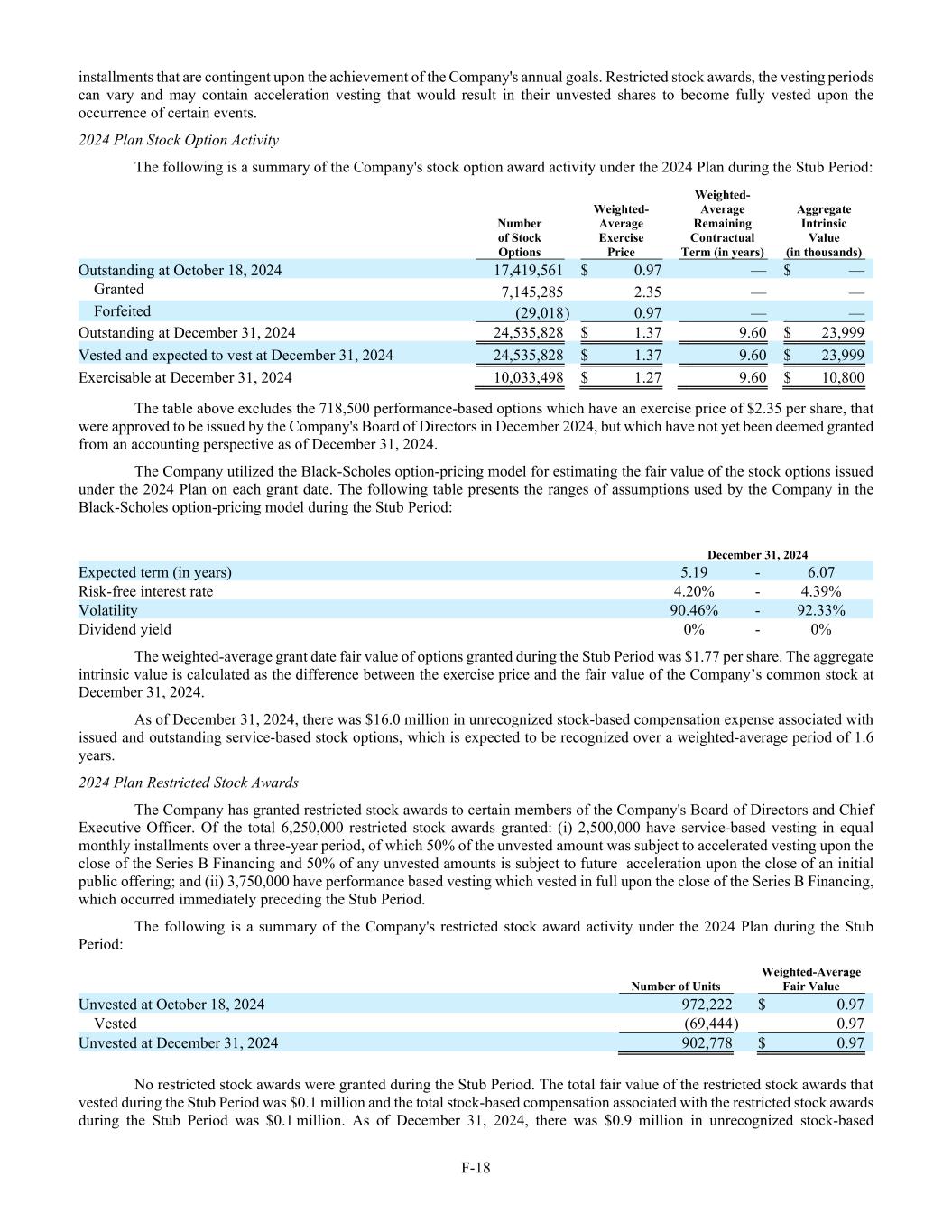 F-18  installments that are contingent upon the achievement of the Company's annual goals. Restricted stock awards, the vesting periods  can vary and may contain acceleration vesting that would result in their unvested shares to become fully vested upon the  occurrence of certain events.   2024 Plan Stock Option Activity  The following is a summary of the Company's stock option award activity under the 2024 Plan during the Stub Period:        Number  of Stock  Options    Weighted-  Average  Exercise  Price    Weighted-  Average  Remaining  Contractual  Term (in years)    Aggregate  Intrinsic  Value  (in thousands)   Outstanding at October 18, 2024   17,419,561  $ 0.97   —   $ —  Granted   7,145,285   2.35   —    —  Forfeited   (29,018 )   0.97   —    —  Outstanding at December 31, 2024   24,535,828  $ 1.37   9.60   $ 23,999  Vested and expected to vest at December 31, 2024   24,535,828  $ 1.37   9.60   $ 23,999  Exercisable at December 31, 2024   10,033,498  $ 1.27   9.60   $ 10,800  The table above excludes the 718,500 performance-based options which have an exercise price of $2.35 per share, that  were approved to be issued by the Company's Board of Directors in December 2024, but which have not yet been deemed granted  from an accounting perspective as of December 31, 2024.  The Company utilized the Black-Scholes option-pricing model for estimating the fair value of the stock options issued  under the 2024 Plan on each grant date. The following table presents the ranges of assumptions used by the Company in the  Black-Scholes option-pricing model during the Stub Period:     December 31, 2024  Expected term (in years) 5.19 - 6.07  Risk-free interest rate 4.20% - 4.39%  Volatility 90.46% - 92.33%  Dividend yield 0% - 0%  The weighted-average grant date fair value of options granted during the Stub Period was $1.77 per share. The aggregate  intrinsic value is calculated as the difference between the exercise price and the fair value of the Company’s common stock at  December 31, 2024.   As of December 31, 2024, there was $16.0 million in unrecognized stock-based compensation expense associated with  issued and outstanding service-based stock options, which is expected to be recognized over a weighted-average period of 1.6  years.  2024 Plan Restricted Stock Awards  The Company has granted restricted stock awards to certain members of the Company's Board of Directors and Chief  Executive Officer. Of the total 6,250,000 restricted stock awards granted: (i) 2,500,000 have service-based vesting in equal  monthly installments over a three-year period, of which 50% of the unvested amount was subject to accelerated vesting upon the  close of the Series B Financing and 50% of any unvested amounts is subject to future  acceleration upon the close of an initial  public offering; and (ii) 3,750,000 have performance based vesting which vested in full upon the close of the Series B Financing,  which occurred immediately preceding the Stub Period.   The following is a summary of the Company's restricted stock award activity under the 2024 Plan during the Stub  Period:       Number of Units   Weighted-Average  Fair Value   Unvested at October 18, 2024   972,222  $ 0.97  Vested   (69,444 )   0.97  Unvested at December 31, 2024   902,778  $ 0.97    No restricted stock awards were granted during the Stub Period. The total fair value of the restricted stock awards that  vested during the Stub Period was $0.1 million and the total stock-based compensation associated with the restricted stock awards  during the Stub Period was $0.1 million. As of December 31, 2024, there was $0.9 million in unrecognized stock-based