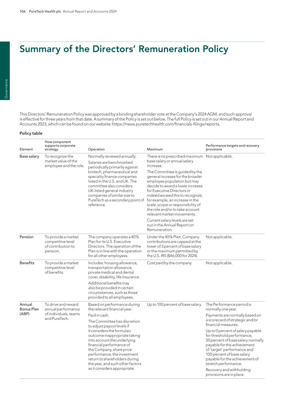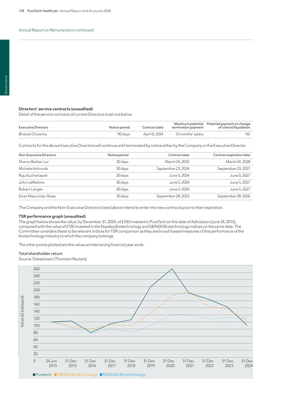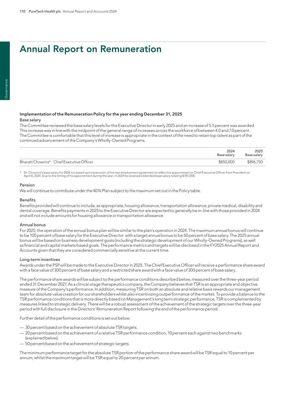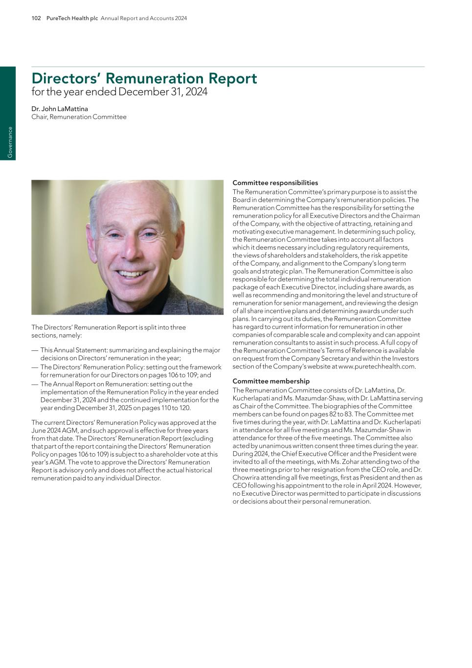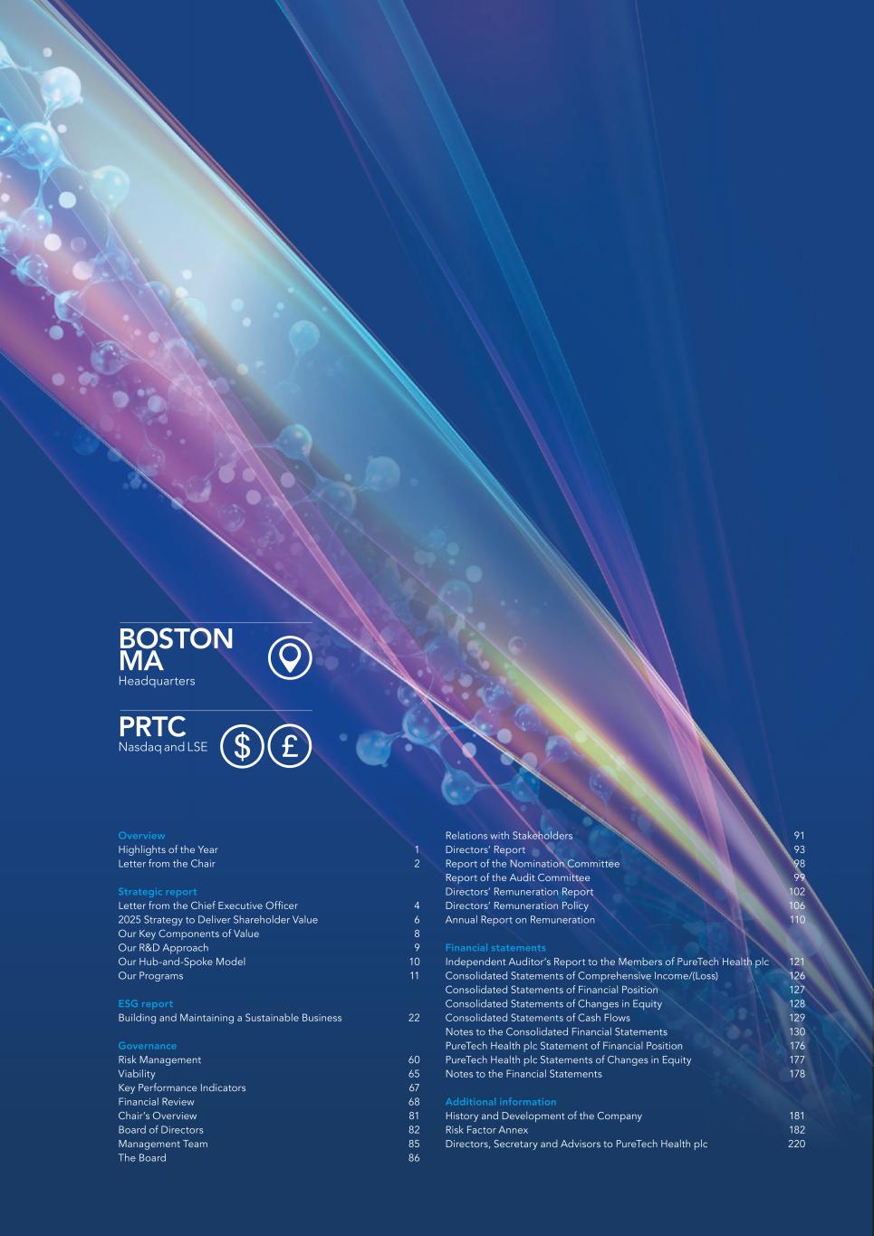 BOSTON   MA Headquarters PRTC Nasdaq and LSE Relations with Stakeholders 91 Directors’ Report 93 Report of the Nomination Committee 98 Report of the Audit Committee 99 Directors’ Remuneration Report 102 Directors’ Remuneration Policy 106 Annual Report on Remuneration 110 Financial statements Independent Auditor’s Report to the Members of PureTech Health plc 121 Consolidated Statements of Comprehensive Income/(Loss) 126 Consolidated Statements of Financial Position 127 Consolidated Statements of Changes in Equity 128 Consolidated Statements of Cash Flows 129 Notes to the Consolidated Financial Statements 130 PureTech Health plc Statement of Financial Position 176 PureTech Health plc Statements of Changes in Equity 177 Notes to the Financial Statements 178 Additional information History and Development of the Company 181 Risk Factor Annex 182 Directors, Secretary and Advisors to PureTech Health plc 220 Overview Highlights of the Year 1 Letter from the Chair 2 Strategic report Letter from the Chief Executive Officer 4 2025 Strategy to Deliver Shareholder Value 6 Our Key Components of Value 8 Our R&D Approach 9 Our Hub-and-Spoke Model 10 Our Programs 11 ESG report Building and Maintaining a Sustainable Business 22 Governance Risk Management 60 Viability 65 Key Performance Indicators 67 Financial Review 68 Chair’s Overview 81 Board of Directors 82 Management Team 85 The Board 86