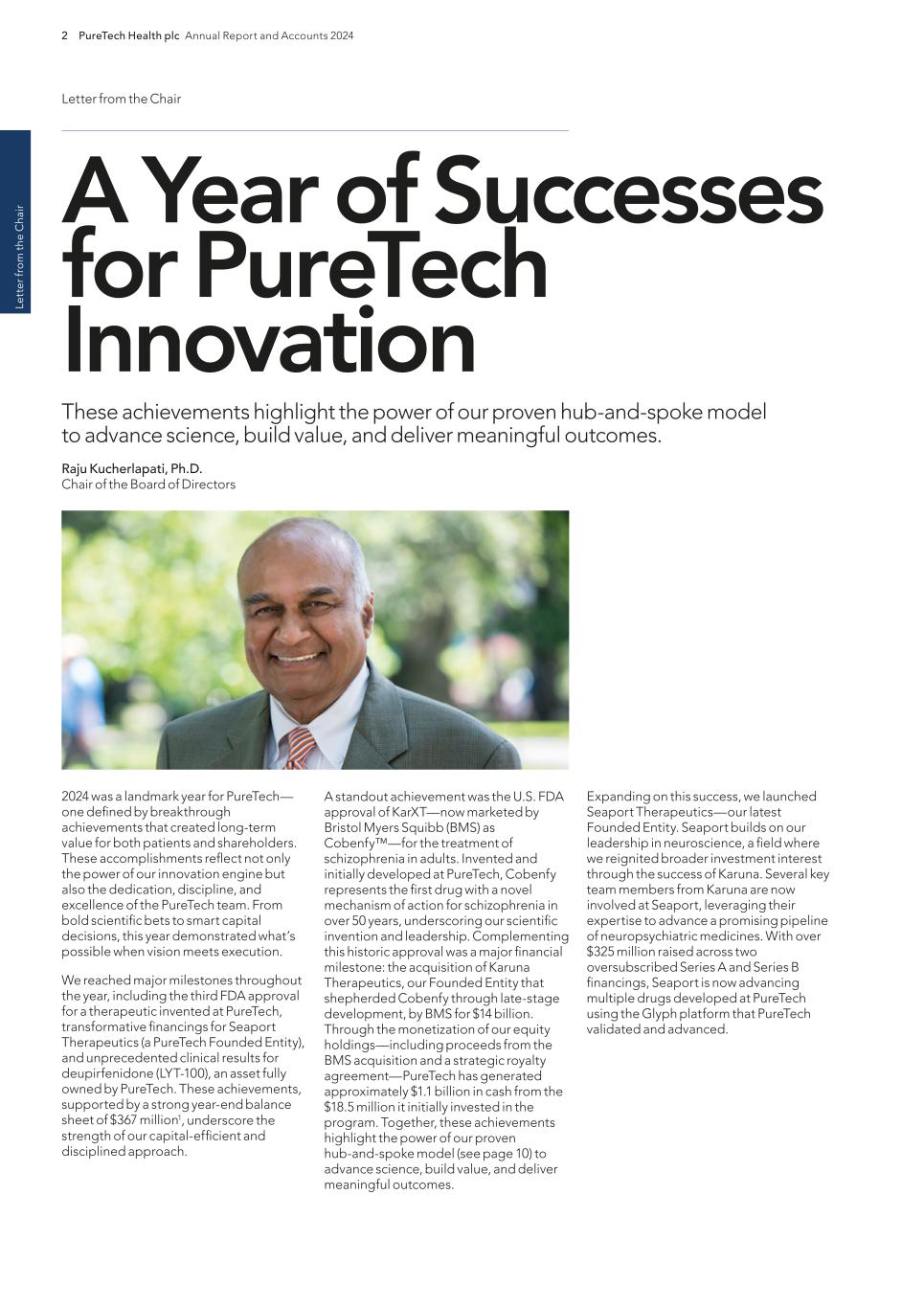2  PureTech Health plc Annual Report and Accounts 2024 A standout achievement was the U.S. FDA  approval of KarXT—now marketed by  Bristol Myers Squibb (BMS) as  Cobenfy™—for the treatment of  schizophrenia in adults. Invented and  initially developed at PureTech, Cobenfy  represents the first drug with a novel  mechanism of action for schizophrenia in  over 50 years, underscoring our scientific  invention and leadership. Complementing  this historic approval was a major financial  milestone: the acquisition of Karuna  Therapeutics, our Founded Entity that  shepherded Cobenfy through late-stage  development, by BMS for $14 billion.  Through the monetization of our equity  holdings—including proceeds from the  BMS acquisition and a strategic royalty  agreement—PureTech has generated  approximately $1.1 billion in cash from the  $18.5 million it initially invested in the  program. Together, these achievements  highlight the power of our proven  hub-and-spoke model (see page 10) to  advance science, build value, and deliver  meaningful outcomes. Expanding on this success, we launched  Seaport Therapeutics—our latest  Founded Entity. Seaport builds on our  leadership in neuroscience, a field where  we reignited broader investment interest  through the success of Karuna. Several key  team members from Karuna are now  involved at Seaport, leveraging their  expertise to advance a promising pipeline  of neuropsychiatric medicines. With over  $325 million raised across two  oversubscribed Series A and Series B  financings, Seaport is now advancing  multiple drugs developed at PureTech  using the Glyph platform that PureTech  validated and advanced. 2024 was a landmark year for PureTech— one defined by breakthrough  achievements that created long-term  value for both patients and shareholders.  These accomplishments reflect not only  the power of our innovation engine but  also the dedication, discipline, and  excellence of the PureTech team. From  bold scientific bets to smart capital  decisions, this year demonstrated what’s  possible when vision meets execution. We reached major milestones throughout  the year, including the third FDA approval  for a therapeutic invented at PureTech,  transformative financings for Seaport  Therapeutics (a PureTech Founded Entity),  and unprecedented clinical results for  deupirfenidone (LYT-100), an asset fully  owned by PureTech. These achievements,  supported by a strong year-end balance  sheet of $367 million1, underscore the  strength of our capital-efficient and  disciplined approach. A Year of Successes  for PureTech  Innovation These achievements highlight the power of our proven hub-and-spoke model  to advance science, build value, and deliver meaningful outcomes.  Raju Kucherlapati, Ph.D. Chair of the Board of Directors Le tt er  fr o m  th e  C ha ir Letter from the Chair
