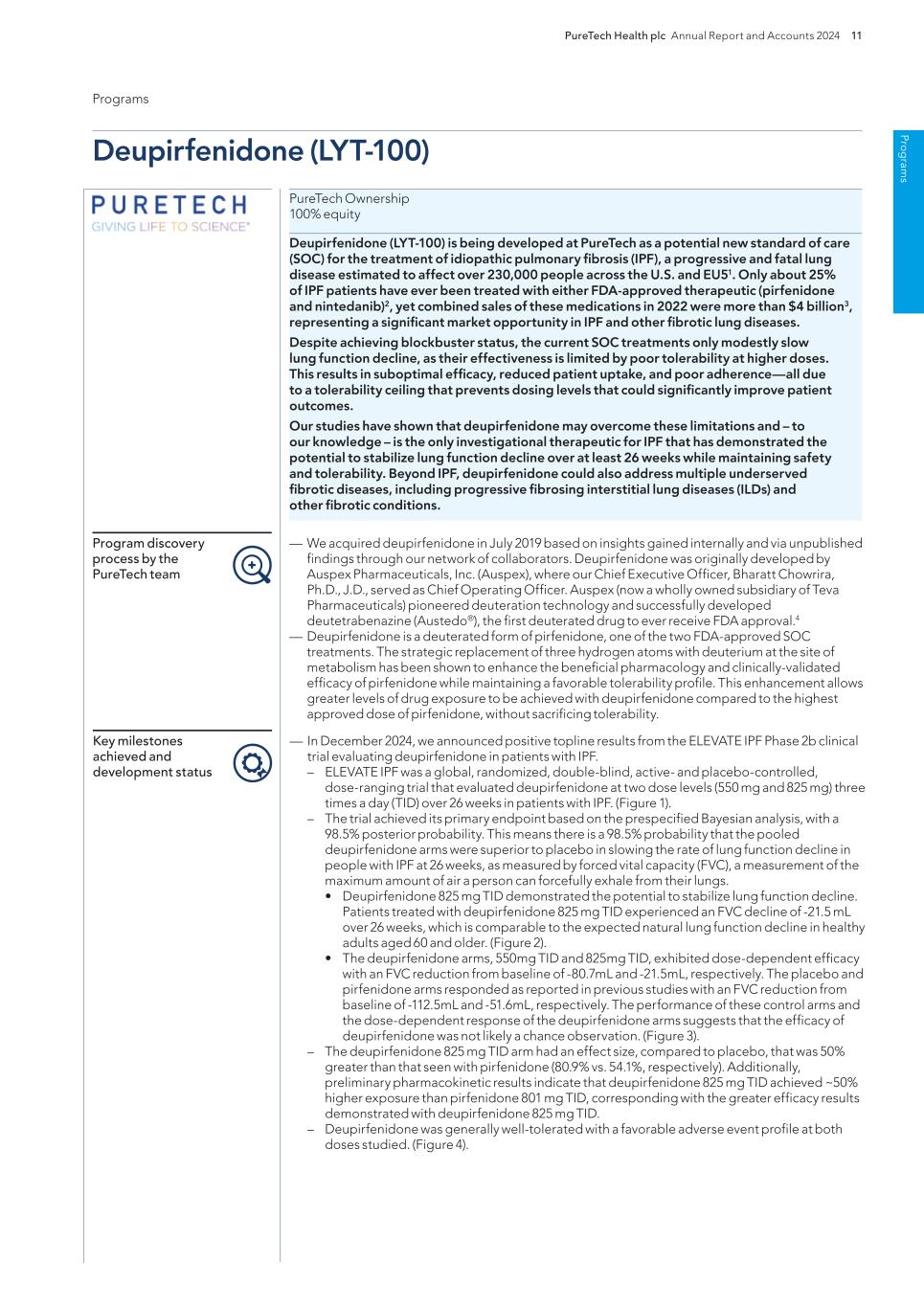 Pro g ram s PureTech Health plc Annual Report and Accounts 2024  11  — We acquired deupirfenidone in July 2019 based on insights gained internally and via unpublished  findings through our network of collaborators. Deupirfenidone was originally developed by  Auspex Pharmaceuticals, Inc. (Auspex), where our Chief Executive Officer, Bharatt Chowrira,  Ph.D., J.D., served as Chief Operating Officer. Auspex (now a wholly owned subsidiary of Teva  Pharmaceuticals) pioneered deuteration technology and successfully developed  deutetrabenazine (Austedo®), the first deuterated drug to ever receive FDA approval.4  — Deupirfenidone is a deuterated form of pirfenidone, one of the two FDA-approved SOC  treatments. The strategic replacement of three hydrogen atoms with deuterium at the site of  metabolism has been shown to enhance the beneficial pharmacology and clinically-validated  efficacy of pirfenidone while maintaining a favorable tolerability profile. This enhancement allows  greater levels of drug exposure to be achieved with deupirfenidone compared to the highest  approved dose of pirfenidone, without sacrificing tolerability. Program discovery   process by the   PureTech team Deupirfenidone (LYT-100) Programs  — In December 2024, we announced positive topline results from the ELEVATE IPF Phase 2b clinical  trial evaluating deupirfenidone in patients with IPF.   – ELEVATE IPF was a global, randomized, double-blind, active- and placebo-controlled,  dose-ranging trial that evaluated deupirfenidone at two dose levels (550 mg and 825 mg) three  times a day (TID) over 26 weeks in patients with IPF. (Figure 1).  – The trial achieved its primary endpoint based on the prespecified Bayesian analysis, with a  98.5% posterior probability. This means there is a 98.5% probability that the pooled  deupirfenidone arms were superior to placebo in slowing the rate of lung function decline in  people with IPF at 26 weeks, as measured by forced vital capacity (FVC), a measurement of the  maximum amount of air a person can forcefully exhale from their lungs.  • Deupirfenidone 825 mg TID demonstrated the potential to stabilize lung function decline.  Patients treated with deupirfenidone 825 mg TID experienced an FVC decline of -21.5 mL  over 26 weeks, which is comparable to the expected natural lung function decline in healthy  adults aged 60 and older. (Figure 2). • The deupirfenidone arms, 550mg TID and 825mg TID, exhibited dose-dependent efficacy  with an FVC reduction from baseline of -80.7mL and -21.5mL, respectively. The placebo and  pirfenidone arms responded as reported in previous studies with an FVC reduction from  baseline of -112.5mL and -51.6mL, respectively. The performance of these control arms and  the dose-dependent response of the deupirfenidone arms suggests that the efficacy of  deupirfenidone was not likely a chance observation. (Figure 3).  – The deupirfenidone 825 mg TID arm had an effect size, compared to placebo, that was 50%  greater than that seen with pirfenidone (80.9% vs. 54.1%, respectively). Additionally,  preliminary pharmacokinetic results indicate that deupirfenidone 825 mg TID achieved ~50%  higher exposure than pirfenidone 801 mg TID, corresponding with the greater efficacy results  demonstrated with deupirfenidone 825 mg TID.  – Deupirfenidone was generally well-tolerated with a favorable adverse event profile at both  doses studied. (Figure 4). Key milestones   achieved and   development status PureTech Ownership  100% equity Deupirfenidone (LYT-100) is being developed at PureTech as a potential new standard of care  (SOC) for the treatment of idiopathic pulmonary fibrosis (IPF), a progressive and fatal lung  disease estimated to affect over 230,000 people across the U.S. and EU51. Only about 25%  of IPF patients have ever been treated with either FDA-approved therapeutic (pirfenidone  and nintedanib)2, yet combined sales of these medications in 2022 were more than $4 billion3,  representing a significant market opportunity in IPF and other fibrotic lung diseases. Despite achieving blockbuster status, the current SOC treatments only modestly slow  lung function decline, as their effectiveness is limited by poor tolerability at higher doses.  This results in suboptimal efficacy, reduced patient uptake, and poor adherence—all due  to a tolerability ceiling that prevents dosing levels that could significantly improve patient  outcomes.  Our studies have shown that deupirfenidone may overcome these limitations and – to  our knowledge – is the only investigational therapeutic for IPF that has demonstrated the  potential to stabilize lung function decline over at least 26 weeks while maintaining safety  and tolerability. Beyond IPF, deupirfenidone could also address multiple underserved  fibrotic diseases, including progressive fibrosing interstitial lung diseases (ILDs) and  other fibrotic conditions.