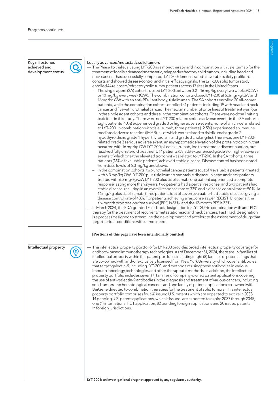 Pro g ram s PureTech Health plc Annual Report and Accounts 2024  15 Locally advanced/metastatic solid tumors  — The Phase 1b trial evaluating LYT-200 as a monotherapy and in combination with tislelizumab for the  treatment of locally advanced/metastatic, relapsed/refractory solid tumors, including head and  neck cancers, has successfully completed. LYT-200 demonstrated a favorable safety profile in all  cohorts and showed disease control and initial efficacy signals. The LYT-200 solid tumor study  enrolled 44 relapsed/refractory solid tumor patients across 13 sites in the United States.  – The single agent (SA) cohorts dosed LYT-200 between 0.2 – 16 mg/kg every two weeks (Q2W)  or 10 mg/kg every week (QW). The combination cohorts dosed LYT-200 at 6.3mg/kg QW and  16mg/kg QW with an anti-PD-1 antibody, tislelizumab. The SA cohorts enrolled 20 all-comer  patients, while the combination cohorts enrolled 24 patients, including 19 with head and neck  cancer and five with urothelial cancer. The median number of prior lines of treatment was four  in the single agent cohorts and three in the combination cohorts. There were no dose limiting  toxicities in this study. There were no LYT-200 related serious adverse events in the SA cohorts.  Eight patients (40%) experienced grade 3 or higher adverse events, none of which were related to LYT-200. In combination with tislelizumab, three patients (12.5%) experienced an immune  mediated adverse reaction (IMAR), all of which were related to tislelizumab (grade 2  hypothyroidism, grade 1 hyperthyroidism, and grade 3 cholangitis). There was one LYT-200- related grade 3 serious adverse event, an asymptomatic elevation of the protein troponin, that  occurred with 16 mg/kg QW LYT-200 plus tislelizumab, led to treatment discontinuation, but  resolved fully on steroid treatment. 14 patients (58.3%) experienced grade 3 or higher adverse  events of which one (the elevated troponin) was related to LYT-200. In the SA cohorts, three  patients (16% of evaluable patients) achieved stable disease. Disease control has been noted  from dose levels of 6.3 mg/kg and above. – In the combination cohorts, two urothelial cancer patients (out of 4 evaluable patients) treated  with 6.3 mg/kg QW LYT-200 plus tislelizumab had stable disease. In head and neck patients  treated with 6.3 mg/kg QW LYT-200 plus tislelizumab, one patient experienced a complete  response lasting more than 2 years; two patients had a partial response; and two patients had  stable disease, resulting in an overall response rate of 33% and a disease control rate of 50%. At 16 mg/kg plus tislelizumab, three patients (out of seven evaluable) had stable disease, giving a  disease control rate of 43%. For patients achieving a response as per RECIST 1.1 criteria, the  six-month progression-free survival (PFS) is 67%, and the 12-month PFS is 33%.   — In March 2024, the FDA granted Fast Track designation for LYT-200 in combination with anti-PD1  therapy for the treatment of recurrent/metastatic head and neck cancers. Fast Track designation  is a process designed to streamline the development and accelerate the assessment of drugs that  target serious conditions with unmet need. Key milestones   achieved and   development status  — The intellectual property portfolio for LYT-200 provides broad intellectual property coverage for  antibody-based immunotherapy technologies. As of December 31, 2024, there are 16 families of  intellectual property within this patent portfolio, including eight (8) families of patent filings that  are co-owned with and/or exclusively licensed from New York University which cover antibodies  that target galectin-9, including LYT-200, and methods of using these antibodies in various  immuno-oncology technologies and other therapeutic methods. In addition, the intellectual  property portfolio includes seven (7) families of company-owned patent applications covering  the use of anti-galectin-9 antibodies in the diagnosis and treatment of various cancers, including  solid tumors and hematological cancers, and one family of patent applications co-owned with  BeiGene directed to combination therapies for the treatment of solid tumors. This intellectual  property portfolio comprises four (4) issued U.S. patents which are expected to expire in 2038,  14 pending U.S. patent applications, which if issued, are expected to expire 2037 through 2045,  one (1) international PCT application, 82 pending foreign applications and 20 issued patents  in foreign jurisdictions. Intellectual property Programs continued LYT-200 is an investigational drug not approved by any regulatory authority. [Portions of this page have been intentionally omitted]