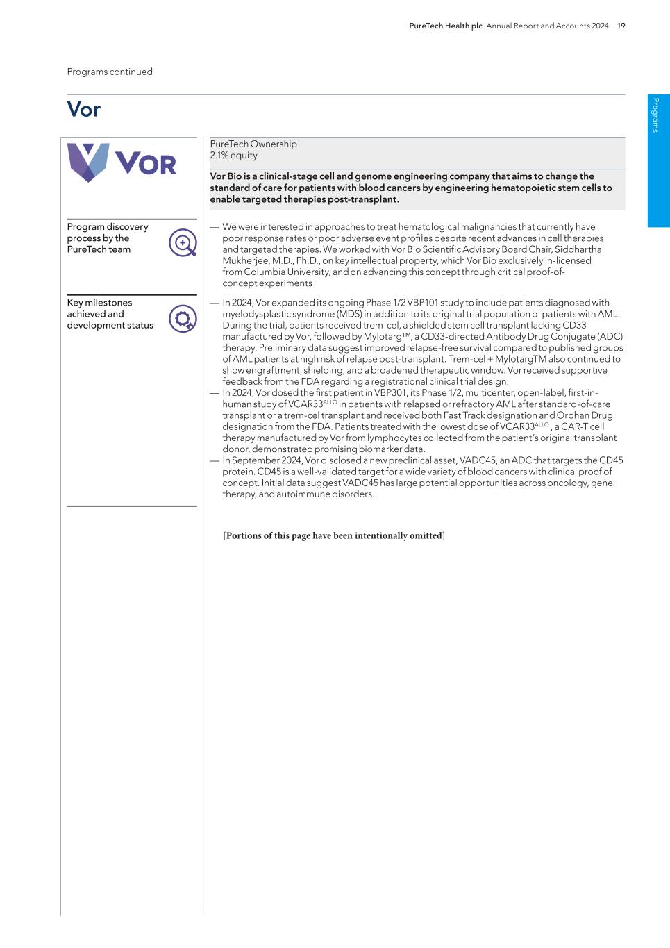 Pro g ram s PureTech Health plc Annual Report and Accounts 2024  19  — In 2024, Vor expanded its ongoing Phase 1/2 VBP101 study to include patients diagnosed with  myelodysplastic syndrome (MDS) in addition to its original trial population of patients with AML.  During the trial, patients received trem-cel, a shielded stem cell transplant lacking CD33  manufactured by Vor, followed by Mylotarg™, a CD33-directed Antibody Drug Conjugate (ADC)  therapy. Preliminary data suggest improved relapse-free survival compared to published groups  of AML patients at high risk of relapse post-transplant. Trem-cel + MylotargTM also continued to  show engraftment, shielding, and a broadened therapeutic window. Vor received supportive  feedback from the FDA regarding a registrational clinical trial design.   — In 2024, Vor dosed the first patient in VBP301, its Phase 1/2, multicenter, open-label, first-in- human study of VCAR33ALLO in patients with relapsed or refractory AML after standard-of-care  transplant or a trem-cel transplant and received both Fast Track designation and Orphan Drug  designation from the FDA. Patients treated with the lowest dose of VCAR33ALLO , a CAR-T cell  therapy manufactured by Vor from lymphocytes collected from the patient’s original transplant  donor, demonstrated promising biomarker data.   — In September 2024, Vor disclosed a new preclinical asset, VADC45, an ADC that targets the CD45  protein. CD45 is a well-validated target for a wide variety of blood cancers with clinical proof of  concept. Initial data suggest VADC45 has large potential opportunities across oncology, gene  therapy, and autoimmune disorders. Key milestones   achieved and   development status  — We were interested in approaches to treat hematological malignancies that currently have  poor response rates or poor adverse event profiles despite recent advances in cell therapies  and targeted therapies. We worked with Vor Bio Scientific Advisory Board Chair, Siddhartha  Mukherjee, M.D., Ph.D., on key intellectual property, which Vor Bio exclusively in-licensed  from Columbia University, and on advancing this concept through critical proof-of- concept experiments Program discovery   process by the   PureTech team Programs continued Vor PureTech Ownership  2.1% equity Vor Bio is a clinical-stage cell and genome engineering company that aims to change the  standard of care for patients with blood cancers by engineering hematopoietic stem cells to  enable targeted therapies post-transplant. [Portions of this page have been intentionally omitted]