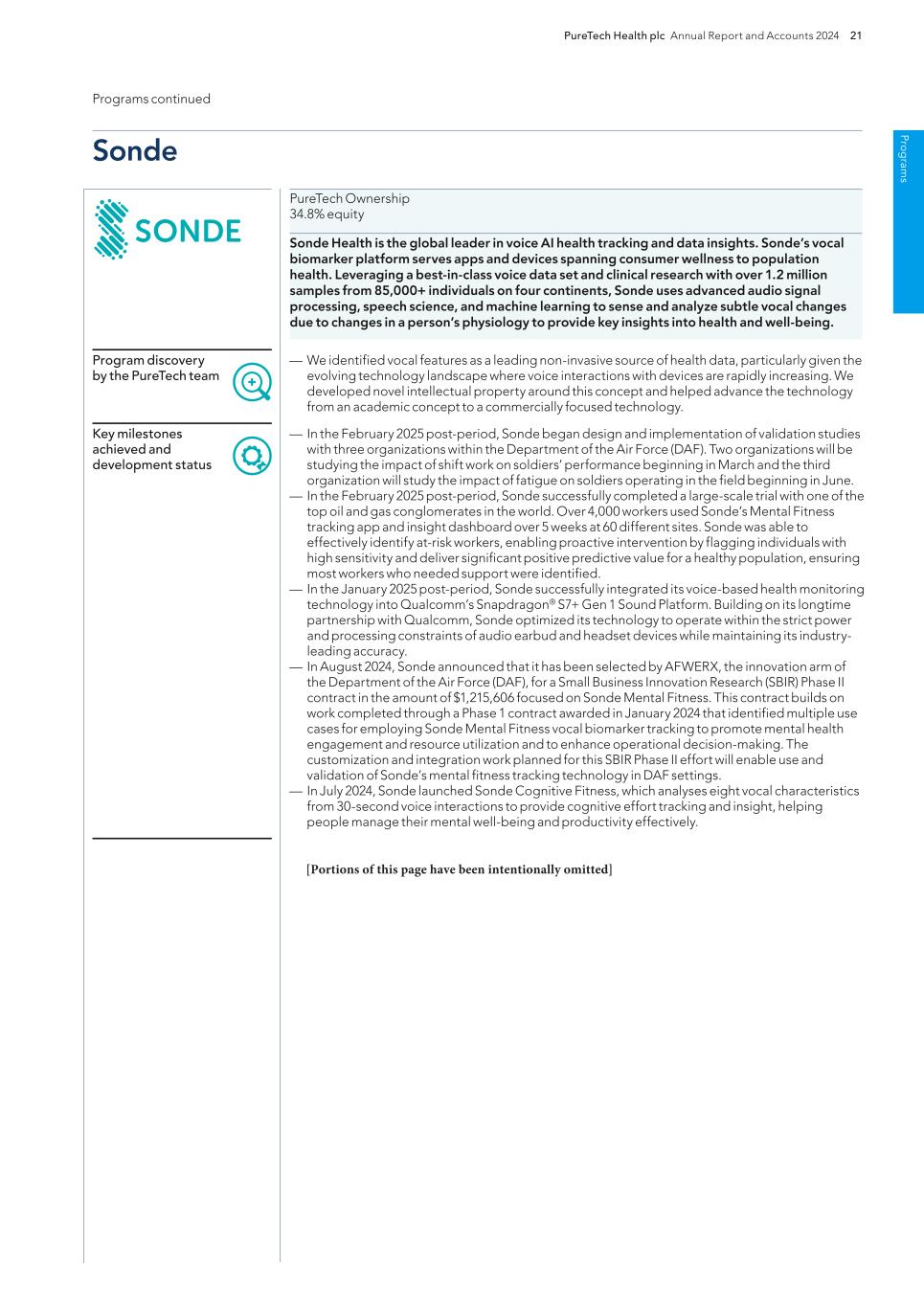 Pro g ram s PureTech Health plc Annual Report and Accounts 2024  21 Programs continued  — In the February 2025 post-period, Sonde began design and implementation of validation studies  with three organizations within the Department of the Air Force (DAF). Two organizations will be  studying the impact of shift work on soldiers’ performance beginning in March and the third  organization will study the impact of fatigue on soldiers operating in the field beginning in June.   — In the February 2025 post-period, Sonde successfully completed a large-scale trial with one of the  top oil and gas conglomerates in the world. Over 4,000 workers used Sonde’s Mental Fitness  tracking app and insight dashboard over 5 weeks at 60 different sites. Sonde was able to  effectively identify at-risk workers, enabling proactive intervention by flagging individuals with  high sensitivity and deliver significant positive predictive value for a healthy population, ensuring  most workers who needed support were identified.  — In the January 2025 post-period, Sonde successfully integrated its voice-based health monitoring  technology into Qualcomm’s Snapdragon® S7+ Gen 1 Sound Platform. Building on its longtime  partnership with Qualcomm, Sonde optimized its technology to operate within the strict power  and processing constraints of audio earbud and headset devices while maintaining its industry- leading accuracy.   — In August 2024, Sonde announced that it has been selected by AFWERX, the innovation arm of  the Department of the Air Force (DAF), for a Small Business Innovation Research (SBIR) Phase II  contract in the amount of $1,215,606 focused on Sonde Mental Fitness. This contract builds on  work completed through a Phase 1 contract awarded in January 2024 that identified multiple use  cases for employing Sonde Mental Fitness vocal biomarker tracking to promote mental health  engagement and resource utilization and to enhance operational decision-making. The  customization and integration work planned for this SBIR Phase II effort will enable use and  validation of Sonde’s mental fitness tracking technology in DAF settings.  — In July 2024, Sonde launched Sonde Cognitive Fitness, which analyses eight vocal characteristics  from 30-second voice interactions to provide cognitive effort tracking and insight, helping  people manage their mental well-being and productivity effectively. Key milestones   achieved and   development status  — We identified vocal features as a leading non-invasive source of health data, particularly given the  evolving technology landscape where voice interactions with devices are rapidly increasing. We  developed novel intellectual property around this concept and helped advance the technology  from an academic concept to a commercially focused technology. Program discovery   by the PureTech team Sonde PureTech Ownership  34.8% equity Sonde Health is the global leader in voice AI health tracking and data insights. Sonde’s vocal  biomarker platform serves apps and devices spanning consumer wellness to population  health. Leveraging a best-in-class voice data set and clinical research with over 1.2 million  samples from 85,000+ individuals on four continents, Sonde uses advanced audio signal  processing, speech science, and machine learning to sense and analyze subtle vocal changes  due to changes in a person’s physiology to provide key insights into health and well-being.  [Portions of this page have been intentionally omitted]