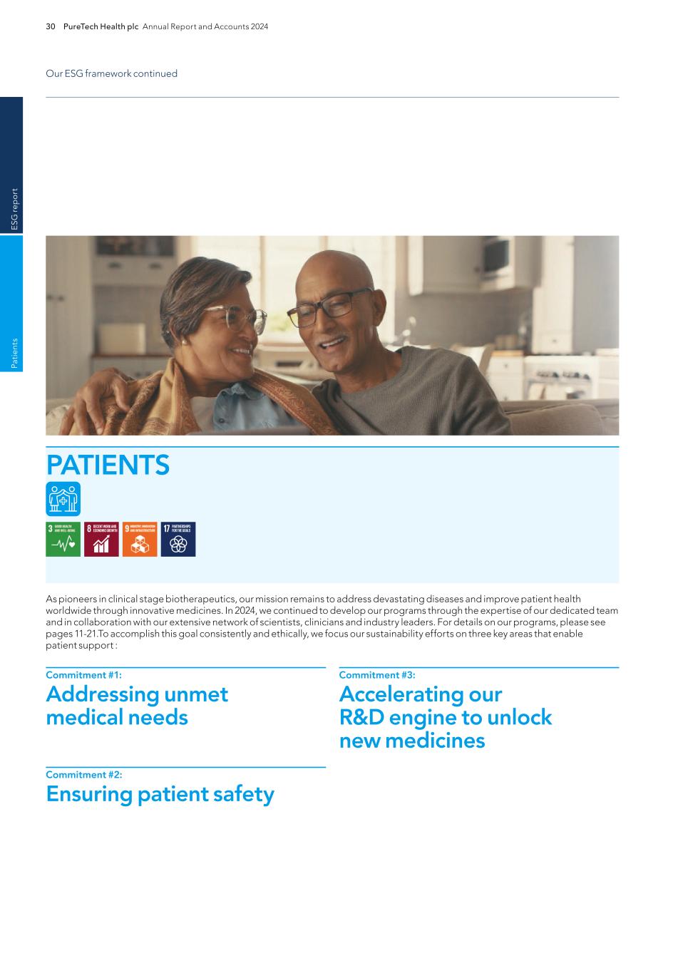 PATIENTS 30  PureTech Health plc Annual Report and Accounts 2024 Our ESG framework continued E SG  re p o rt Pa ti en ts As pioneers in clinical stage biotherapeutics, our mission remains to address devastating diseases and improve patient health  worldwide through innovative medicines. In 2024, we continued to develop our programs through the expertise of our dedicated team  and in collaboration with our extensive network of scientists, clinicians and industry leaders. For details on our programs, please see  pages 11-21.To accomplish this goal consistently and ethically, we focus our sustainability efforts on three key areas that enable  patient support :  Commitment #1:  Addressing unmet  medical needs  Commitment #2:  Ensuring patient safety Commitment #3:  Accelerating our  R&D engine to unlock  new medicines